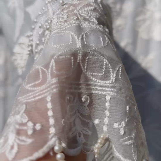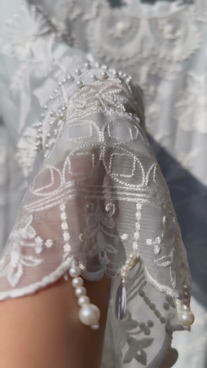 This 3-piece ensemble brings timeless charm with a fashion-forward twist. Featuring a fully embroidered chiffon kameez, paired with a luxe silk farshi shalwar, and finished with a lace-detailed chiffon dupatta — Noor-e-Farshi is made to move with you, and turn heads while doing it.