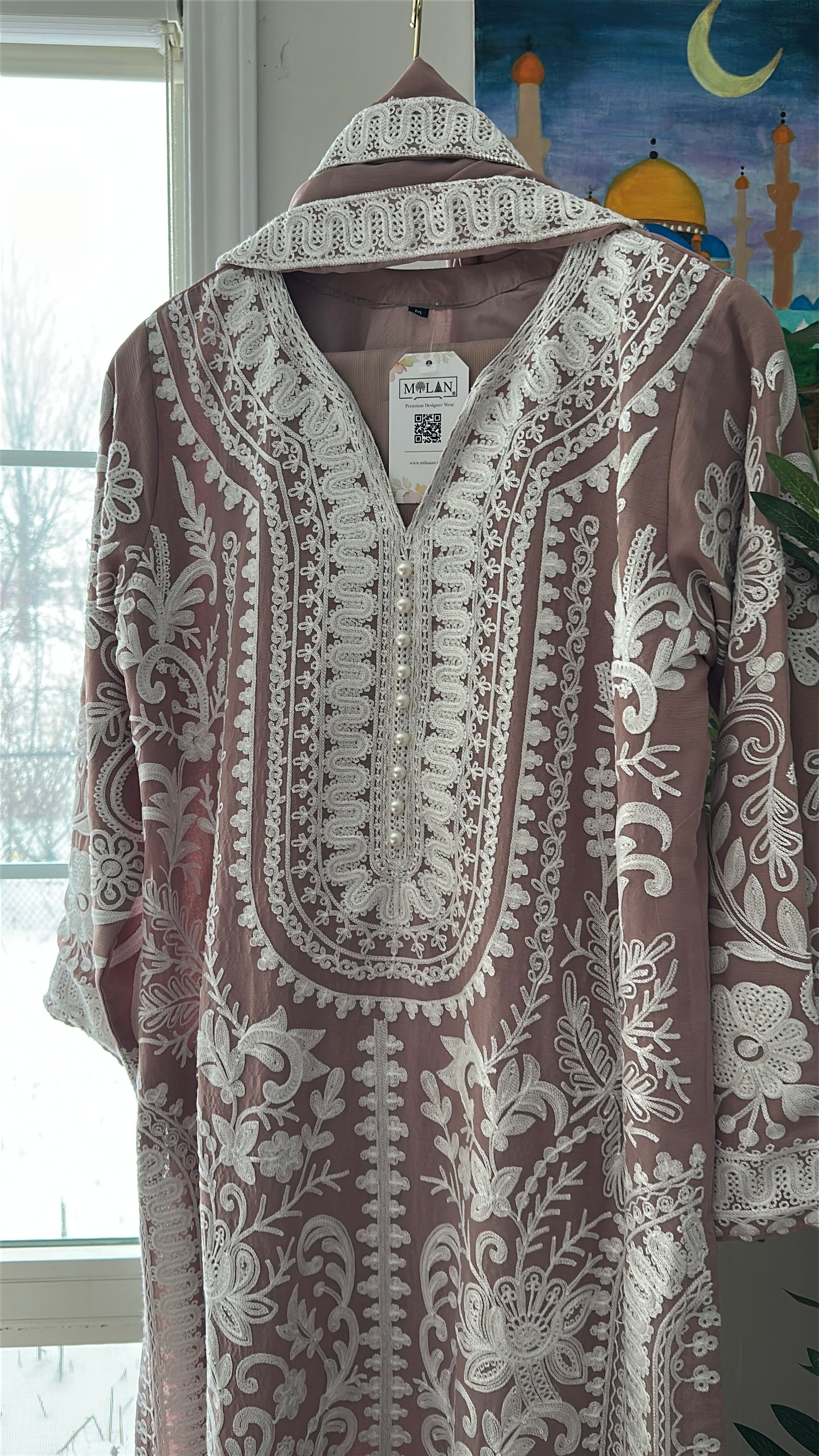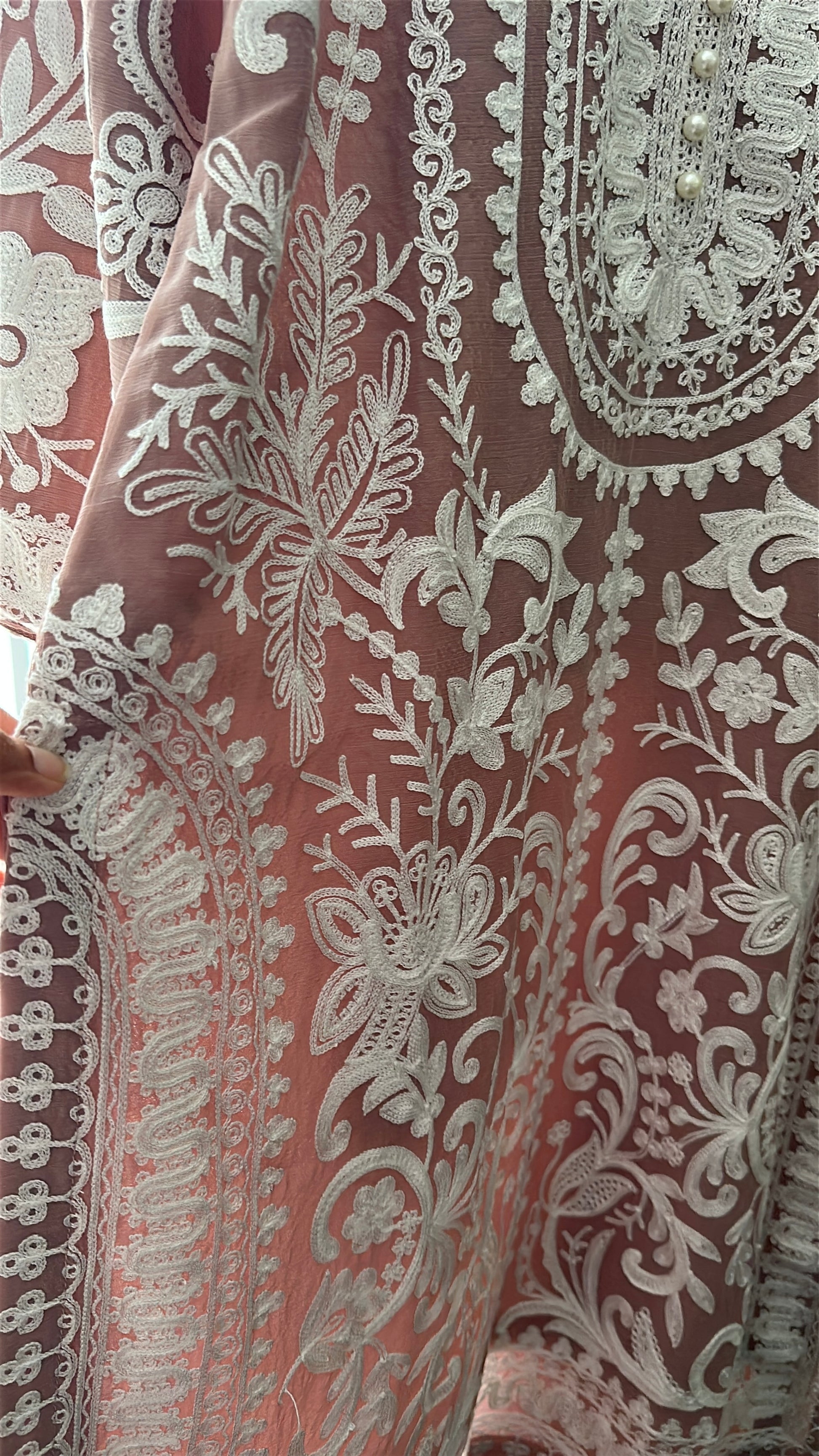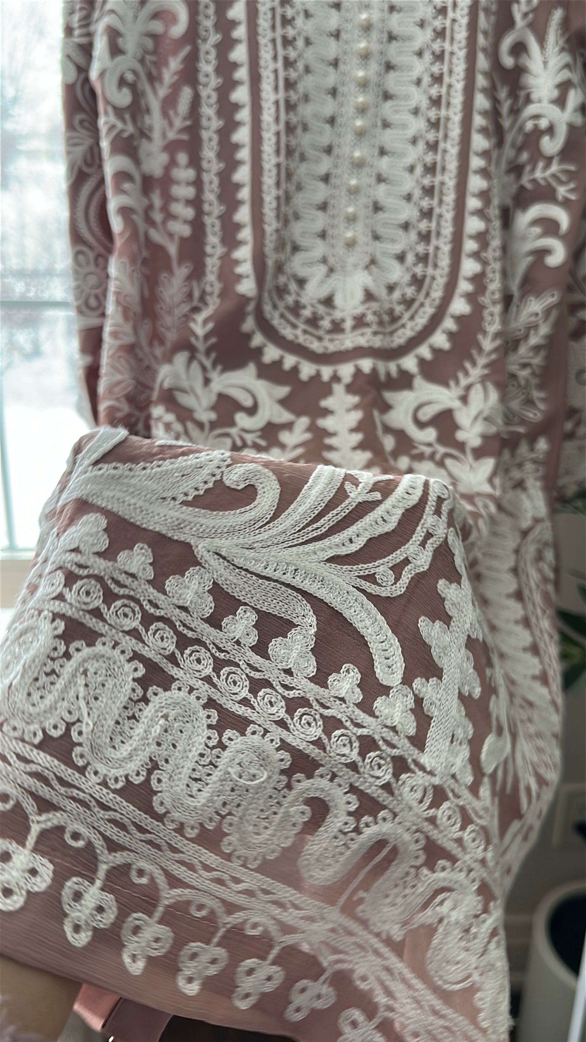 A 3-piece ensemble crafted from premium chiffon, Café Blush Élan blends warm coffee-pink tones with intricate ivory aari embroidery, creating a look that feels graceful, delicate, and quietly luxurious. The shirt features elaborate traditional aari craftsmanship flowing across the neckline, front panels, sleeves, and hem, forming a beautiful contrast against the soft café blush base. The neckline is delicately adorned with pearl embellishments, adding a refined sparkle that elevates the entire ensemble.