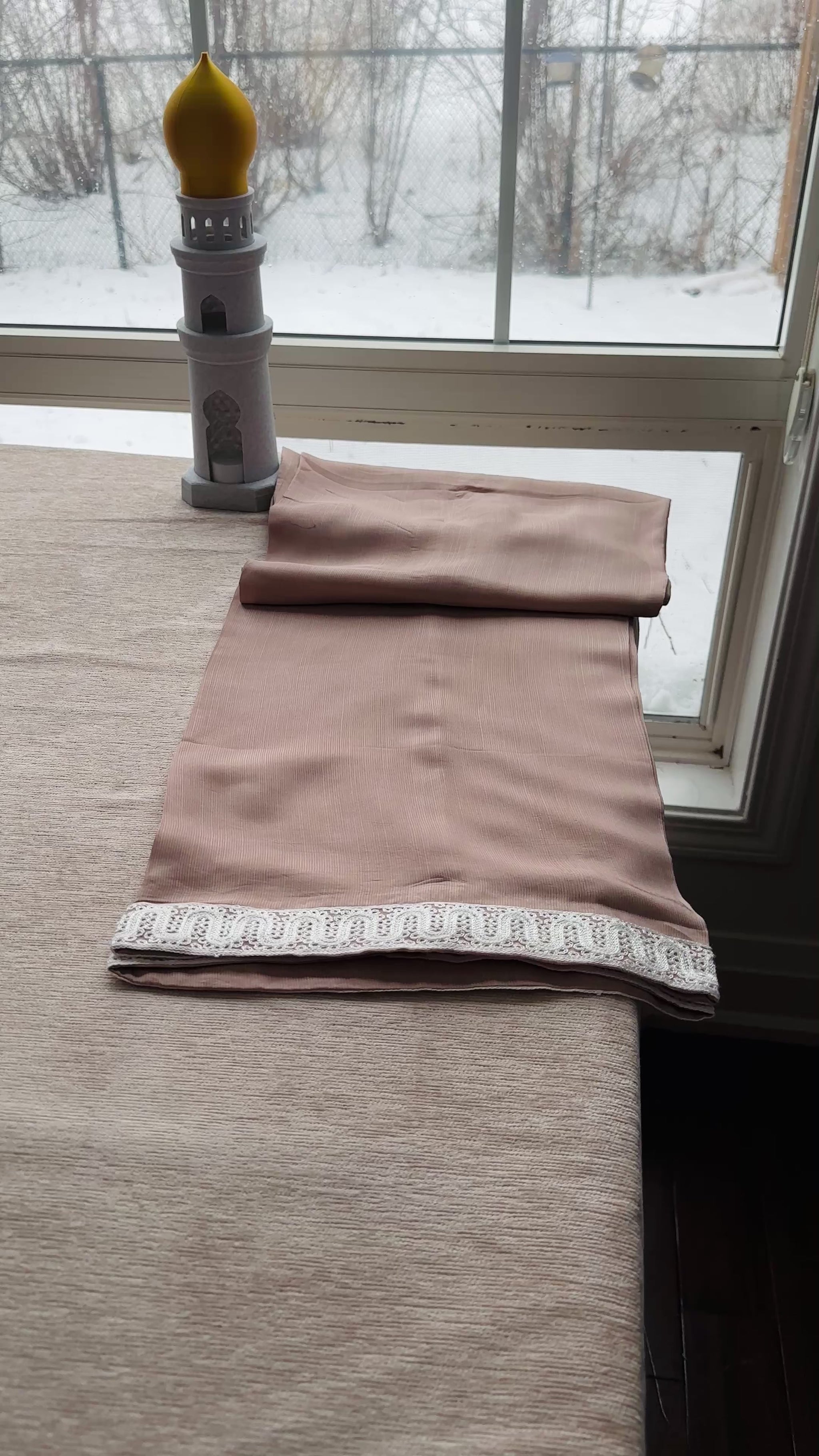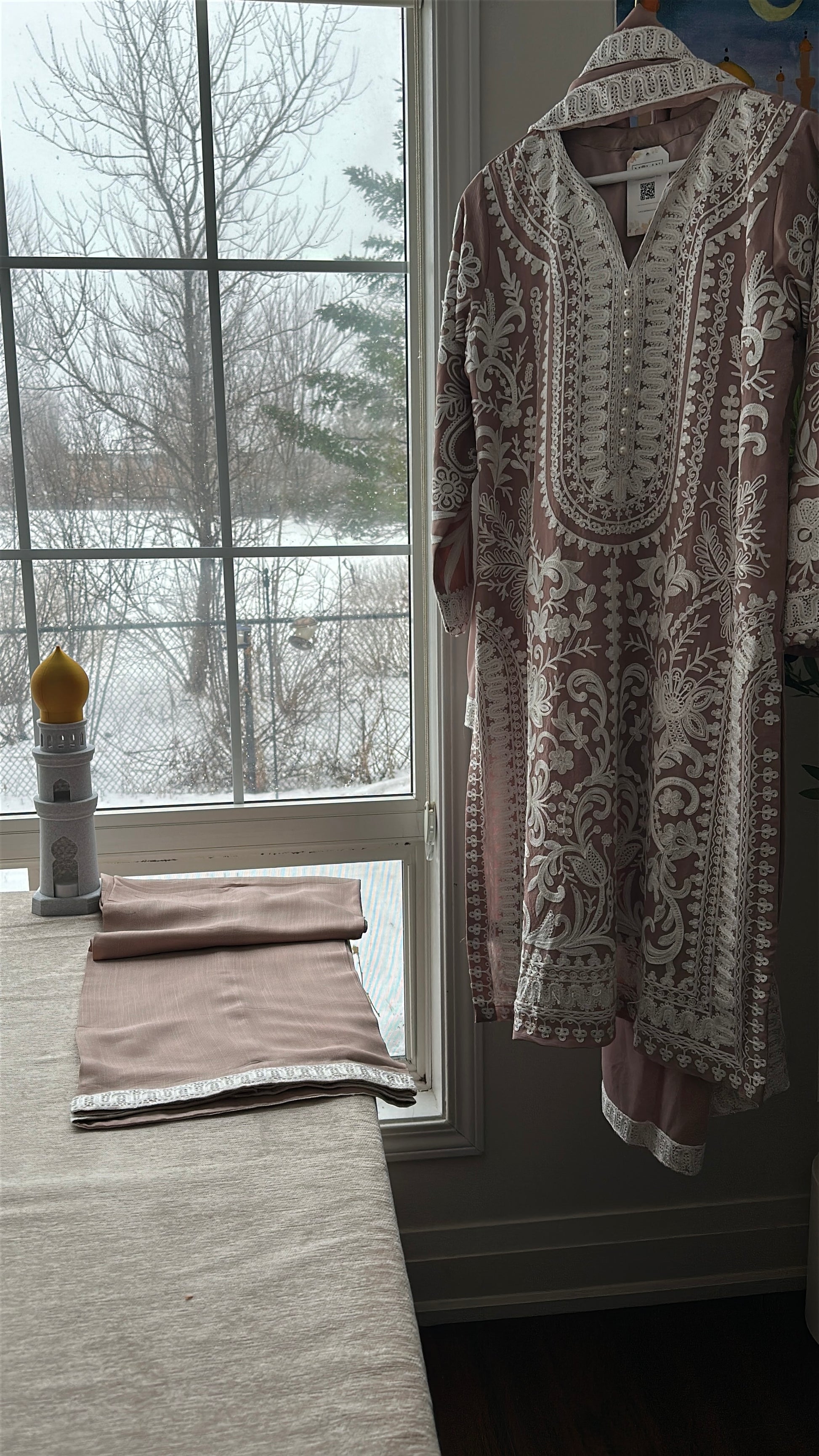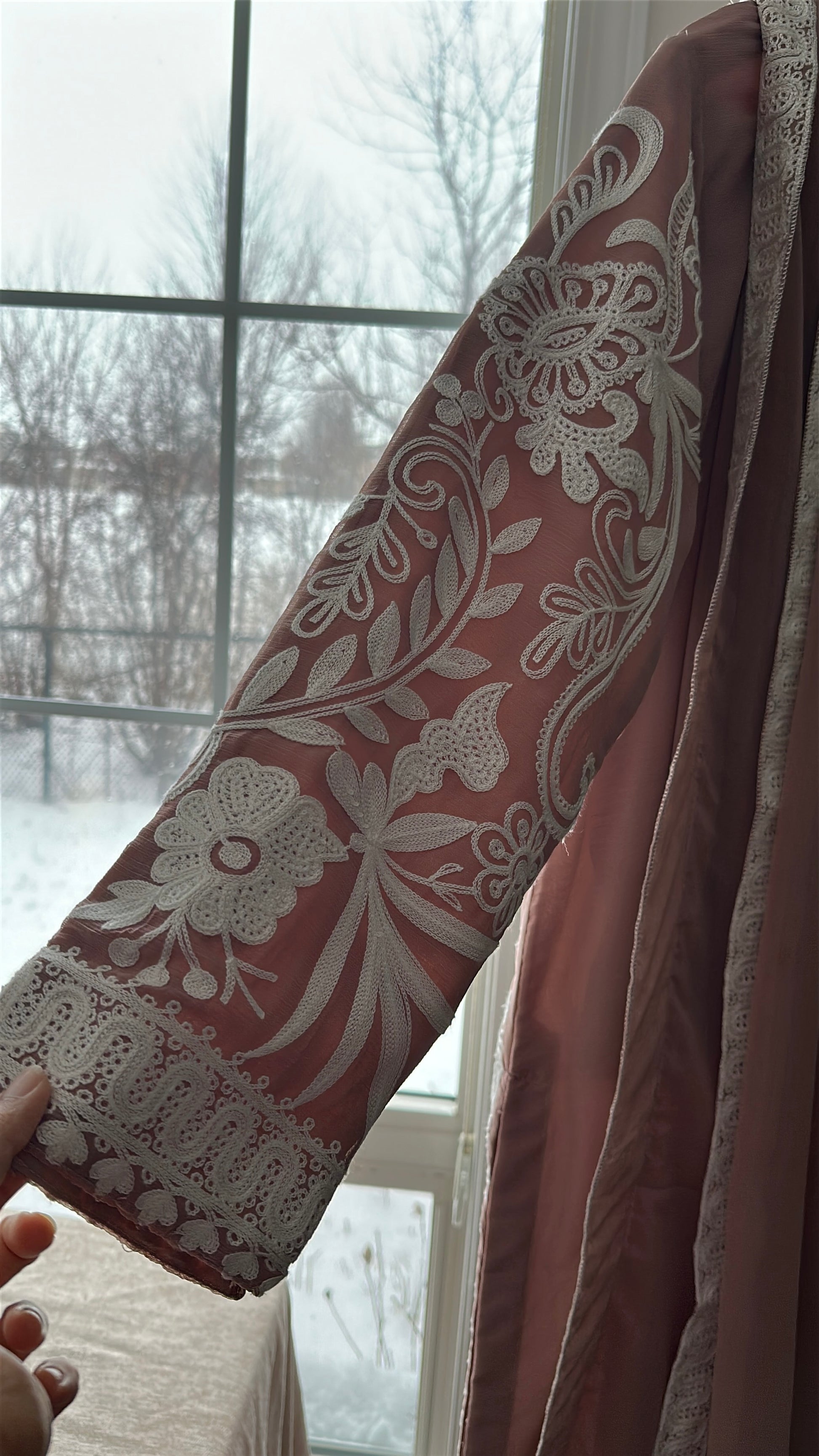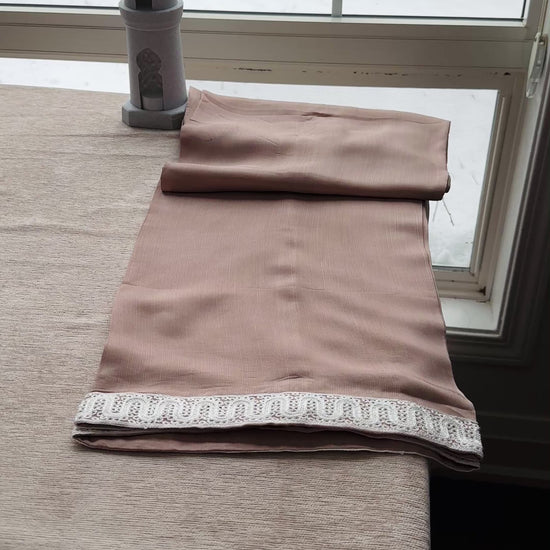 A 3-piece ensemble crafted from premium chiffon, Café Blush Élan blends warm coffee-pink tones with intricate ivory aari embroidery, creating a look that feels graceful, delicate, and quietly luxurious. The shirt features elaborate traditional aari craftsmanship flowing across the neckline, front panels, sleeves, and hem, forming a beautiful contrast against the soft café blush base. The neckline is delicately adorned with pearl embellishments, adding a refined sparkle that elevates the entire ensemble.