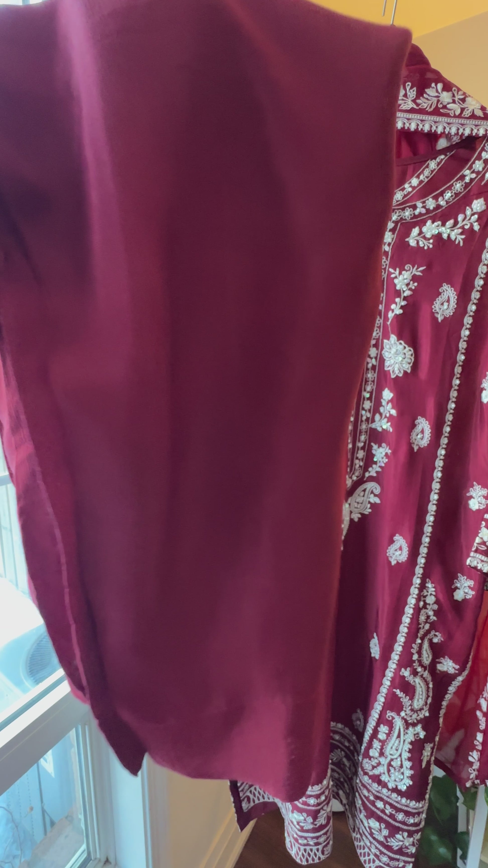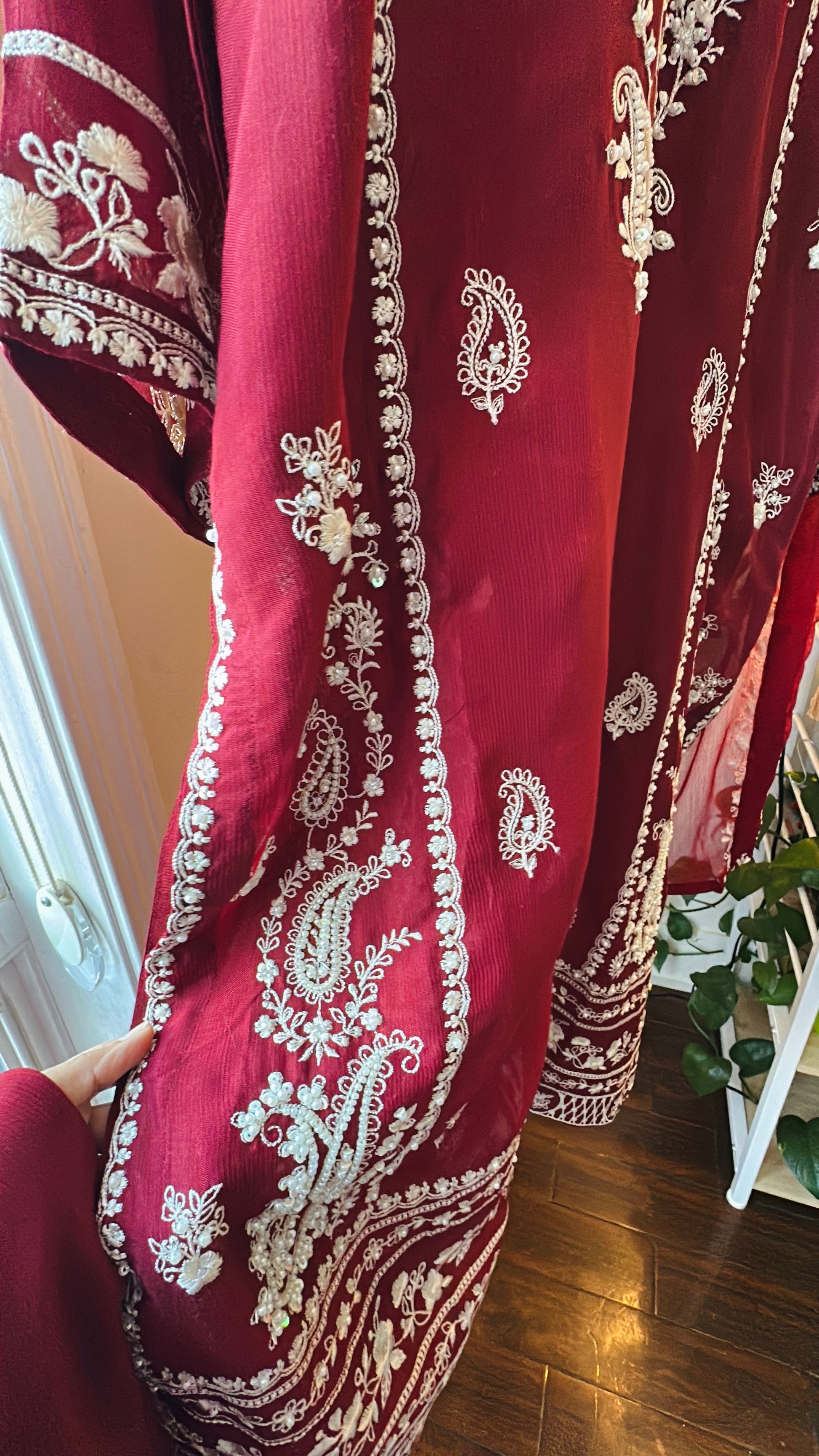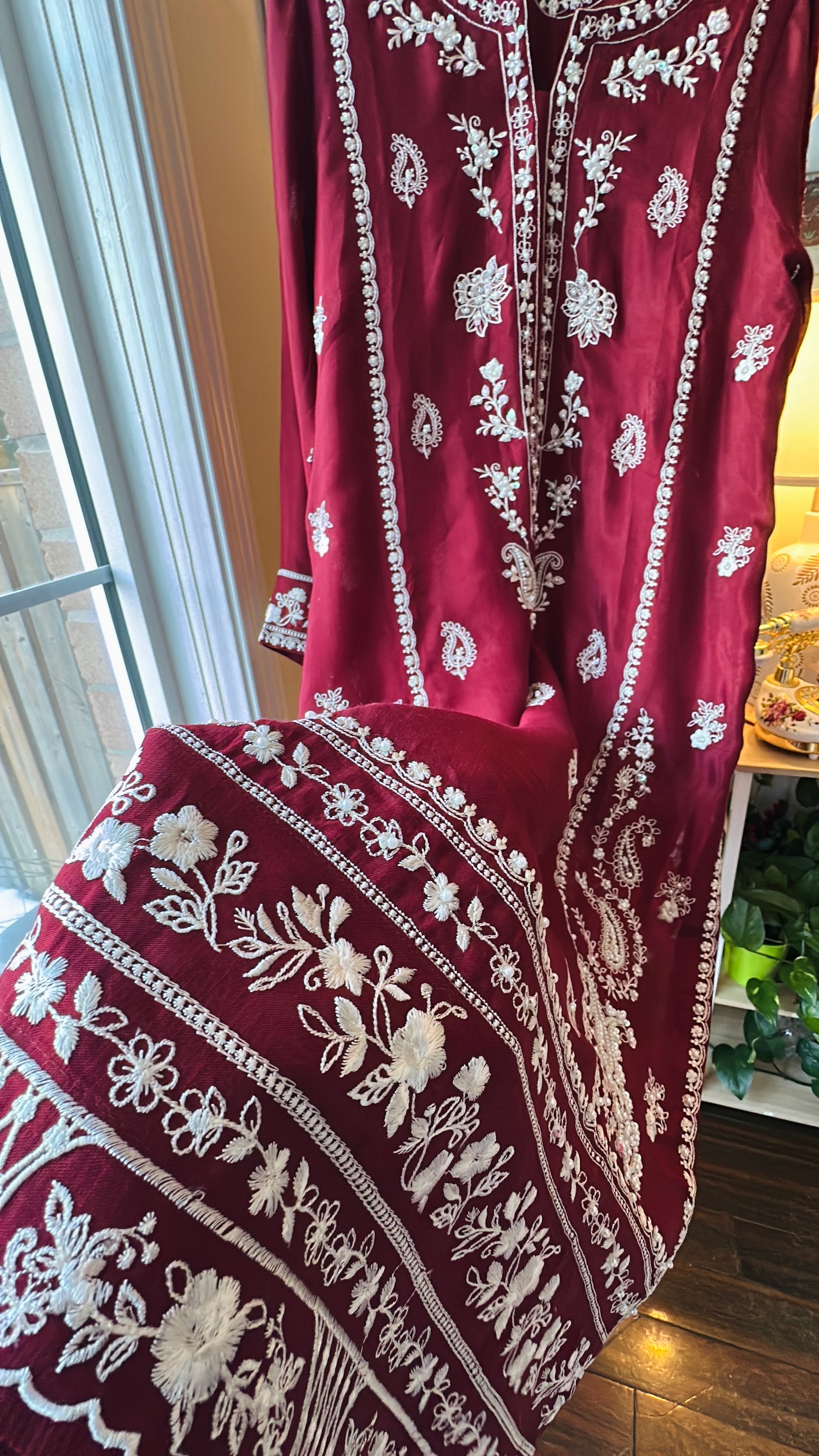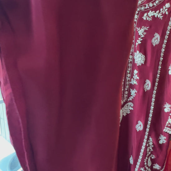 Rendered in a rich crimson hue, the shirt is fully front-and-back embroidered with pearl, sitara, and fine resham detailing that adds subtle dimension without overpowering the look. Paired with matching stitched raw silk pants and a lightweight chiffon dupatta finished with embroidered borders, this set moves effortlessly between tradition and modern refinement.
