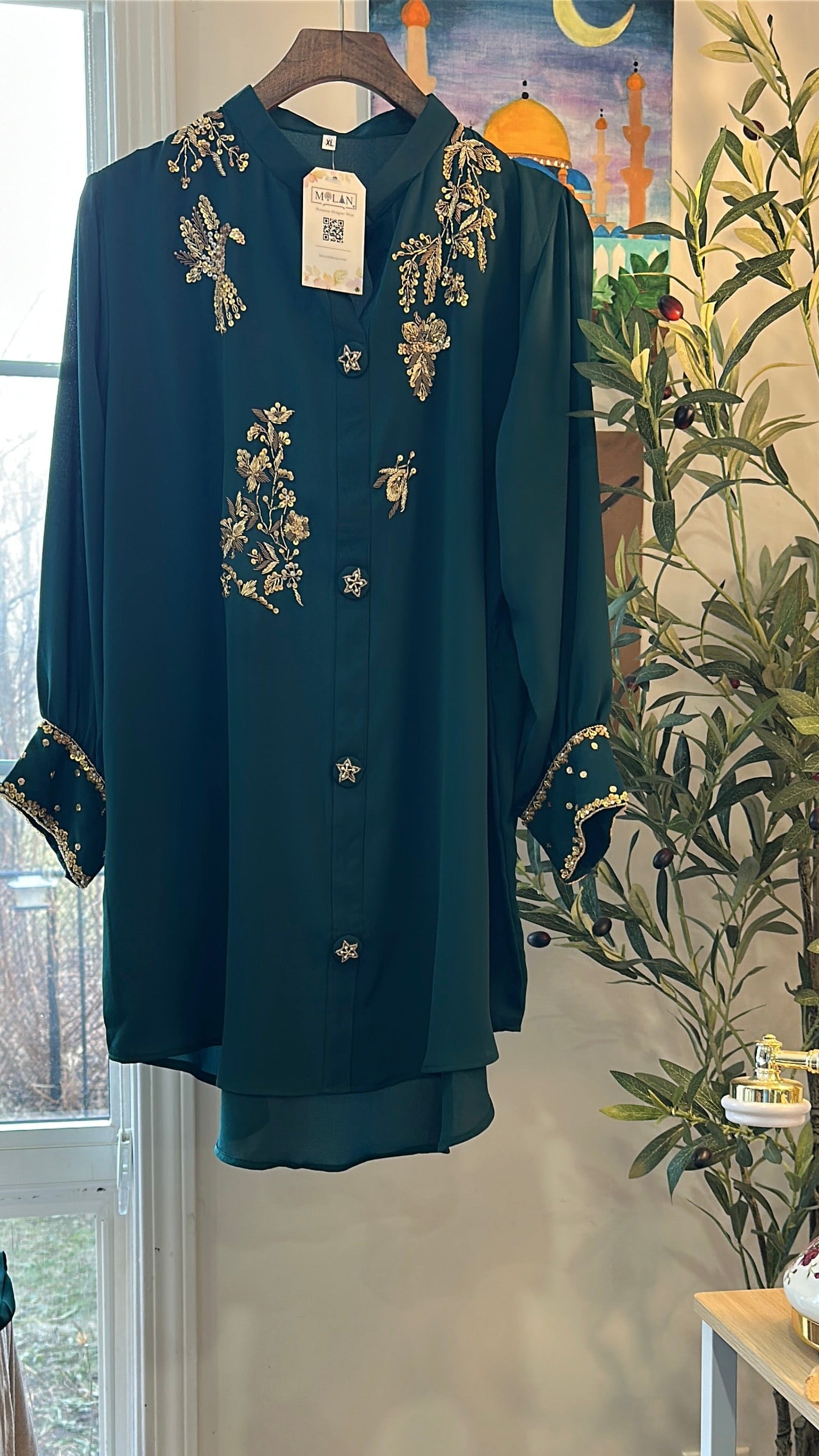A refined 2-piece cord set crafted from airy georgette, Emerald Poise blends Eastern artistry with modern minimalism. Rendered in a deep emerald tone, the shirt features delicate hand-embroidered motifs placed gracefully across the front and shoulders, adding quiet sophistication without overpowering the look.