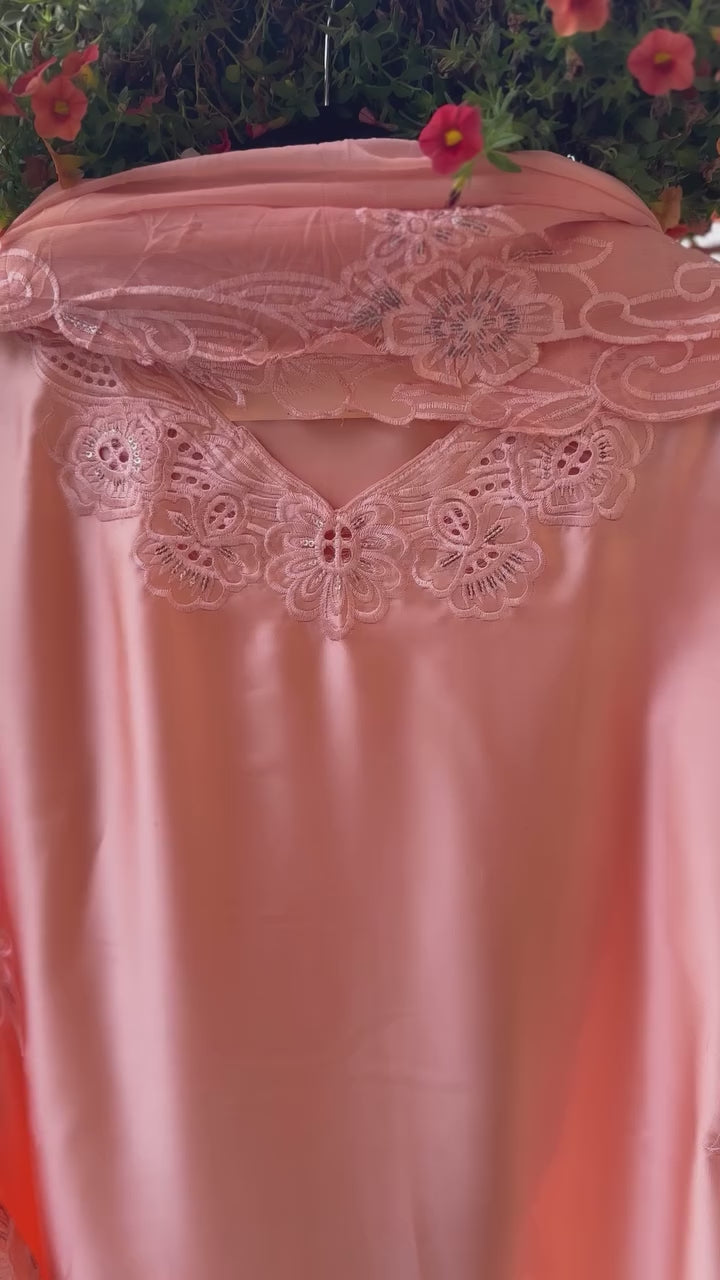 A 3-piece ensemble crafted from 100% satin silk, Luxe Élan blends tradition and elegance with a modern edge. The shirt features laser-cut embroidery with delicate sequin detailing, complemented by matching raw silk pants. The chiffon dupatta is softly sprayed with sequins and fully finished with intricate cutwork — festive, flowy, and feminine.