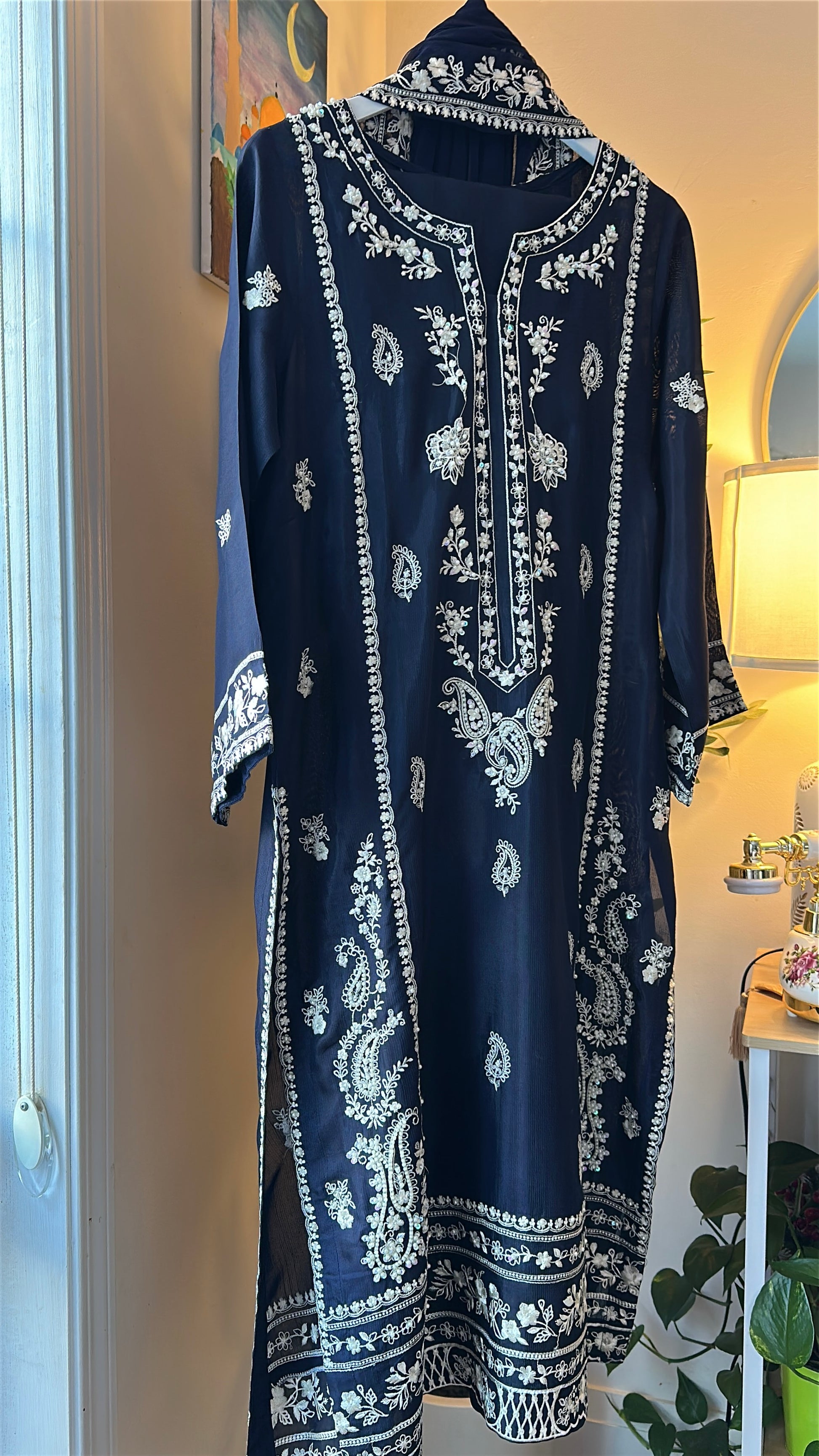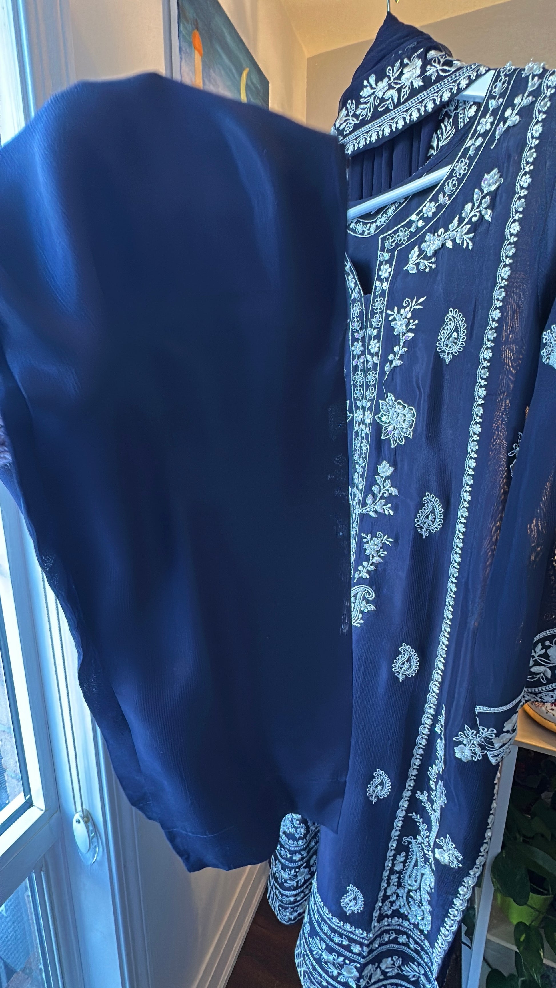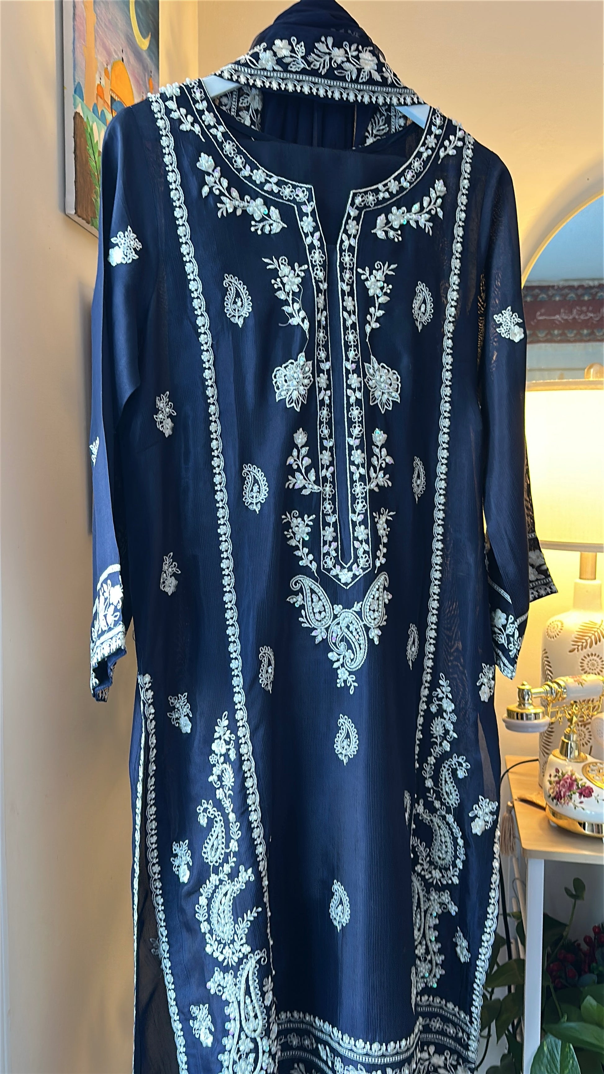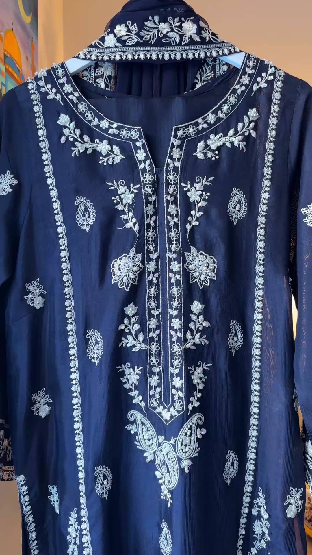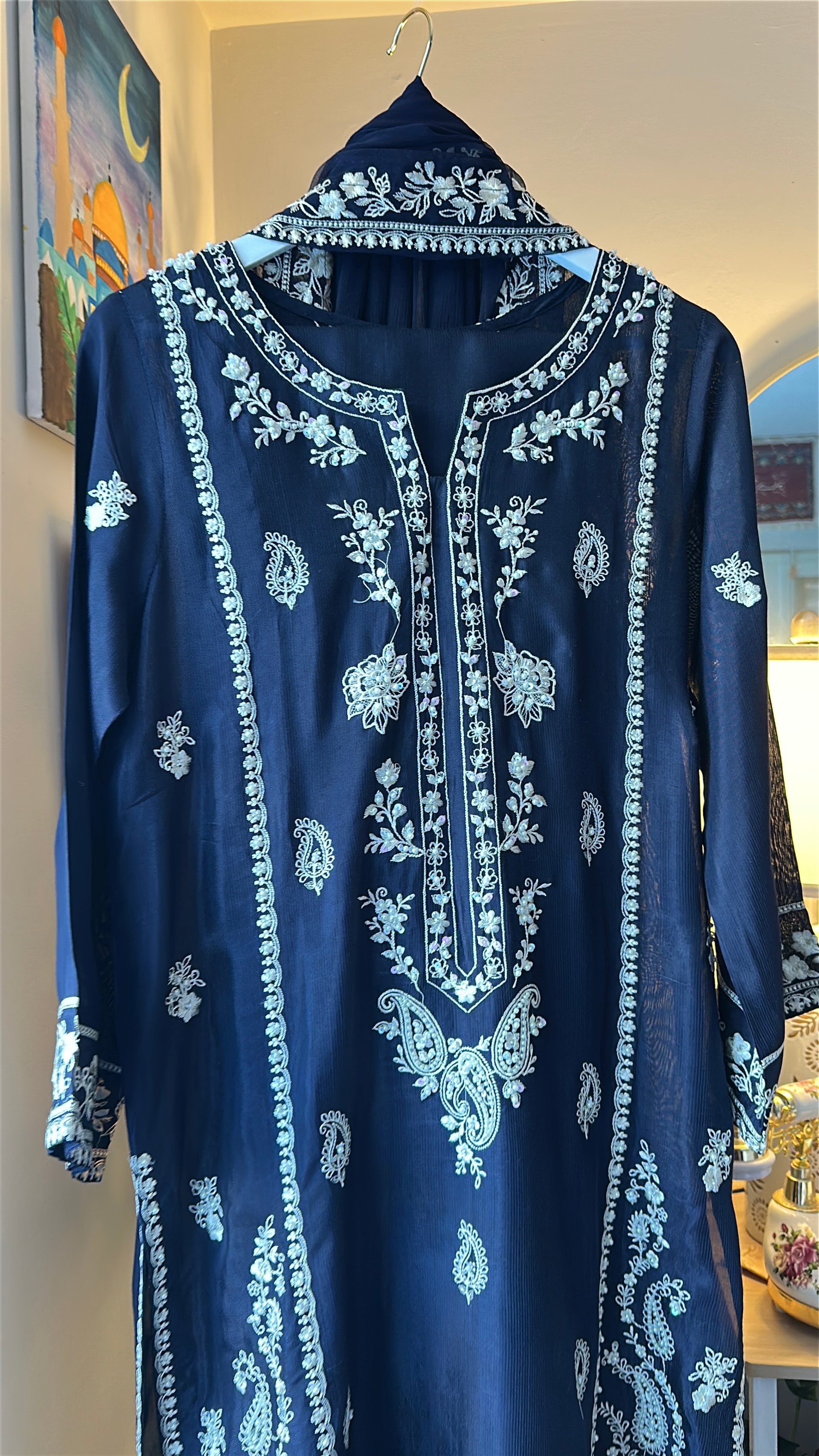 The shirt features full front-and-back embroidery with delicate pearl, sitara, and resham work in soft ivory tones, creating luminous contrast against the rich blue base. Paired with matching stitched raw silk pants and a lightweight chiffon dupatta finished with intricately embroidered borders, the silhouette feels polished, regal, and effortlessly timeless.