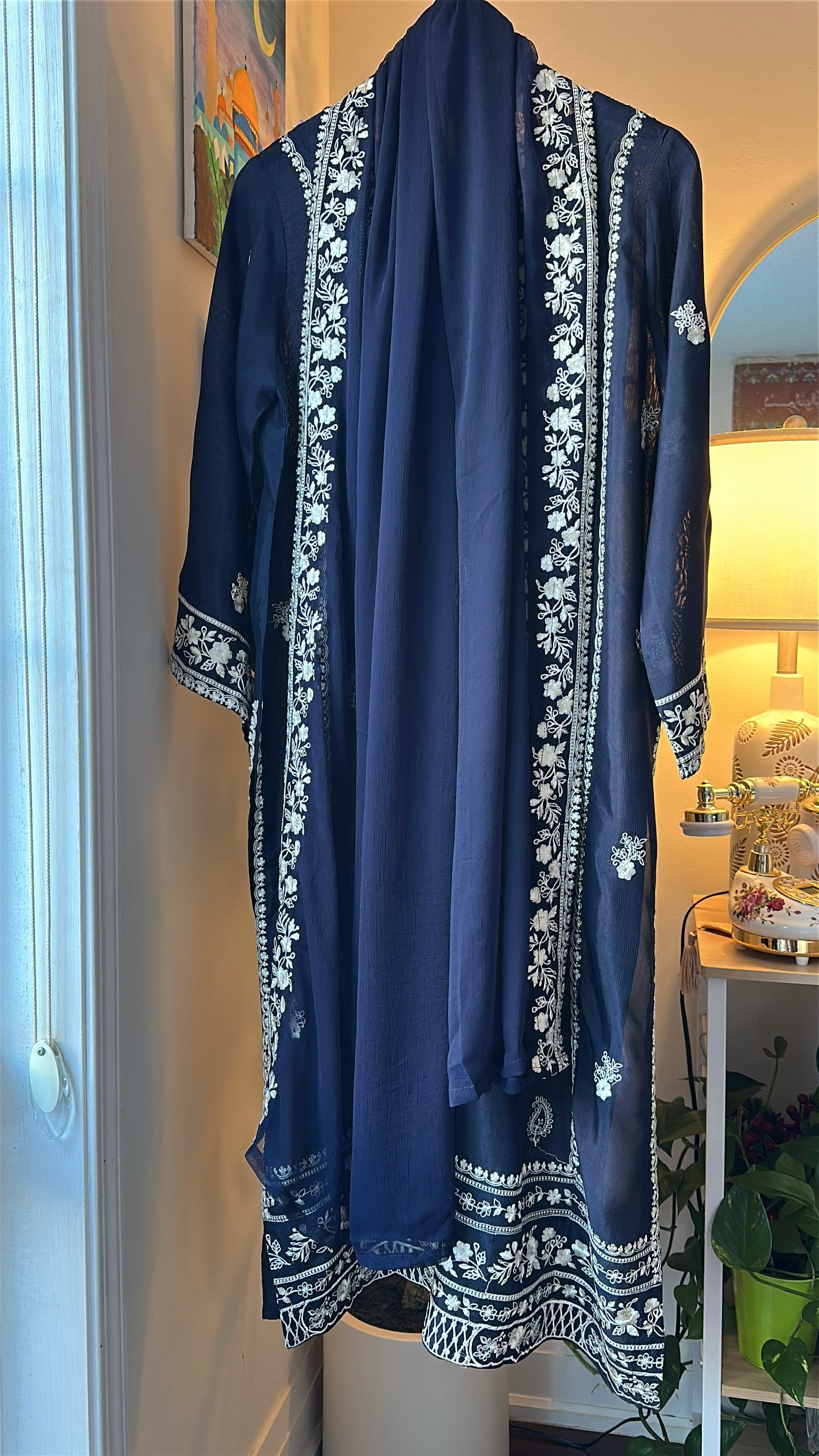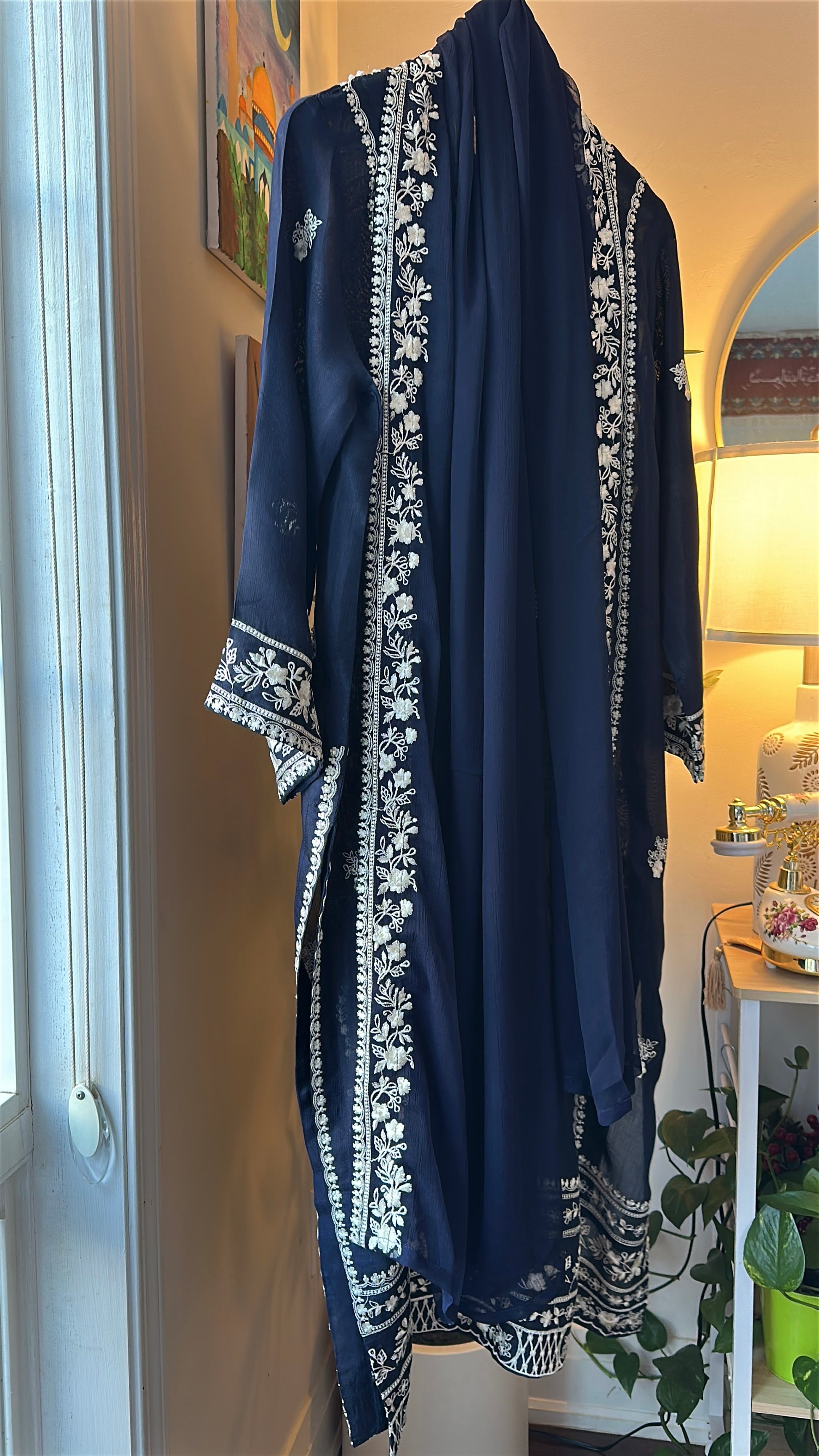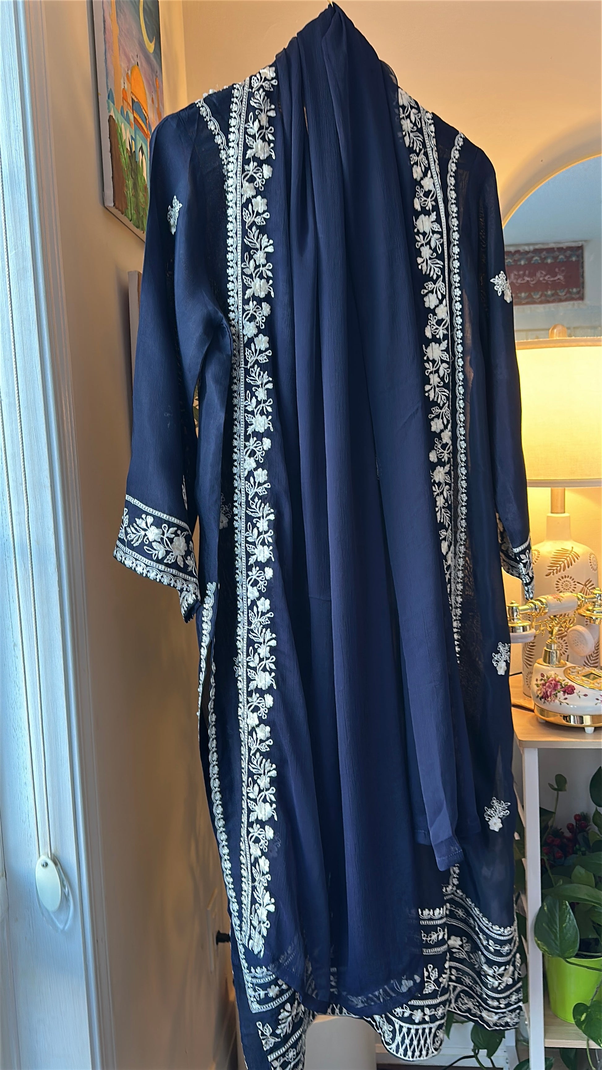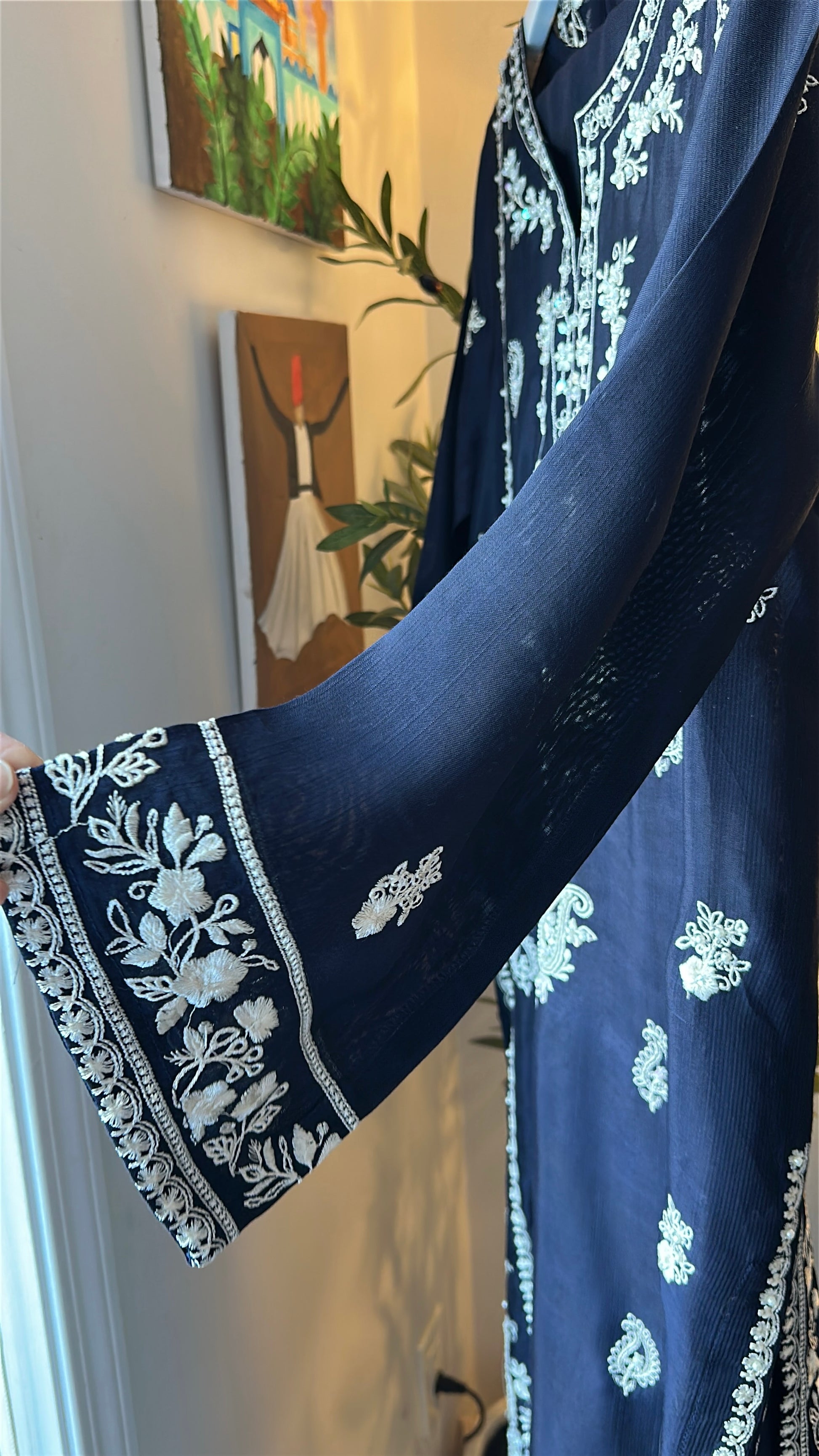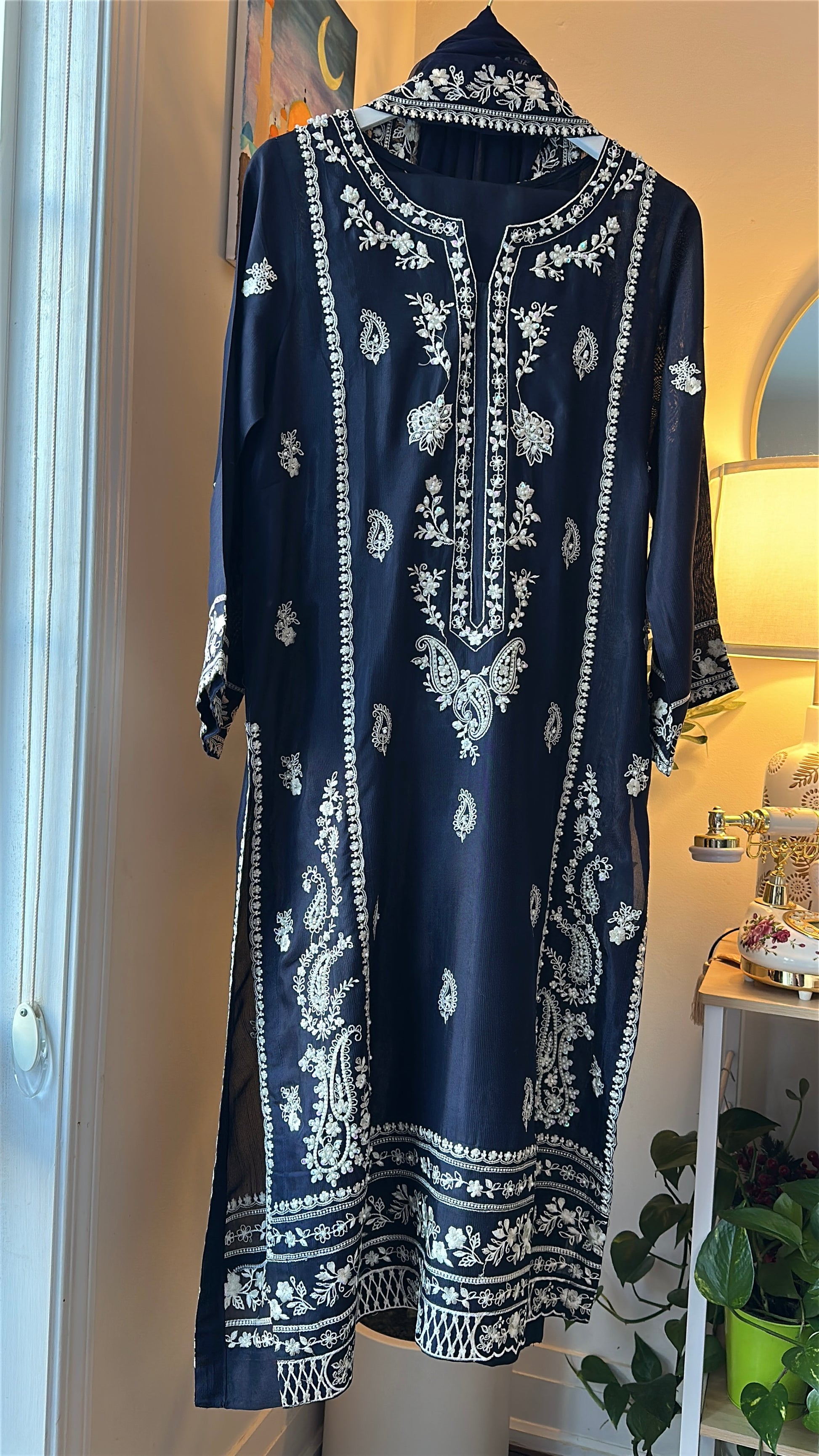 The shirt features full front-and-back embroidery with delicate pearl, sitara, and resham work in soft ivory tones, creating luminous contrast against the rich blue base. Paired with matching stitched raw silk pants and a lightweight chiffon dupatta finished with intricately embroidered borders, the silhouette feels polished, regal, and effortlessly timeless.
