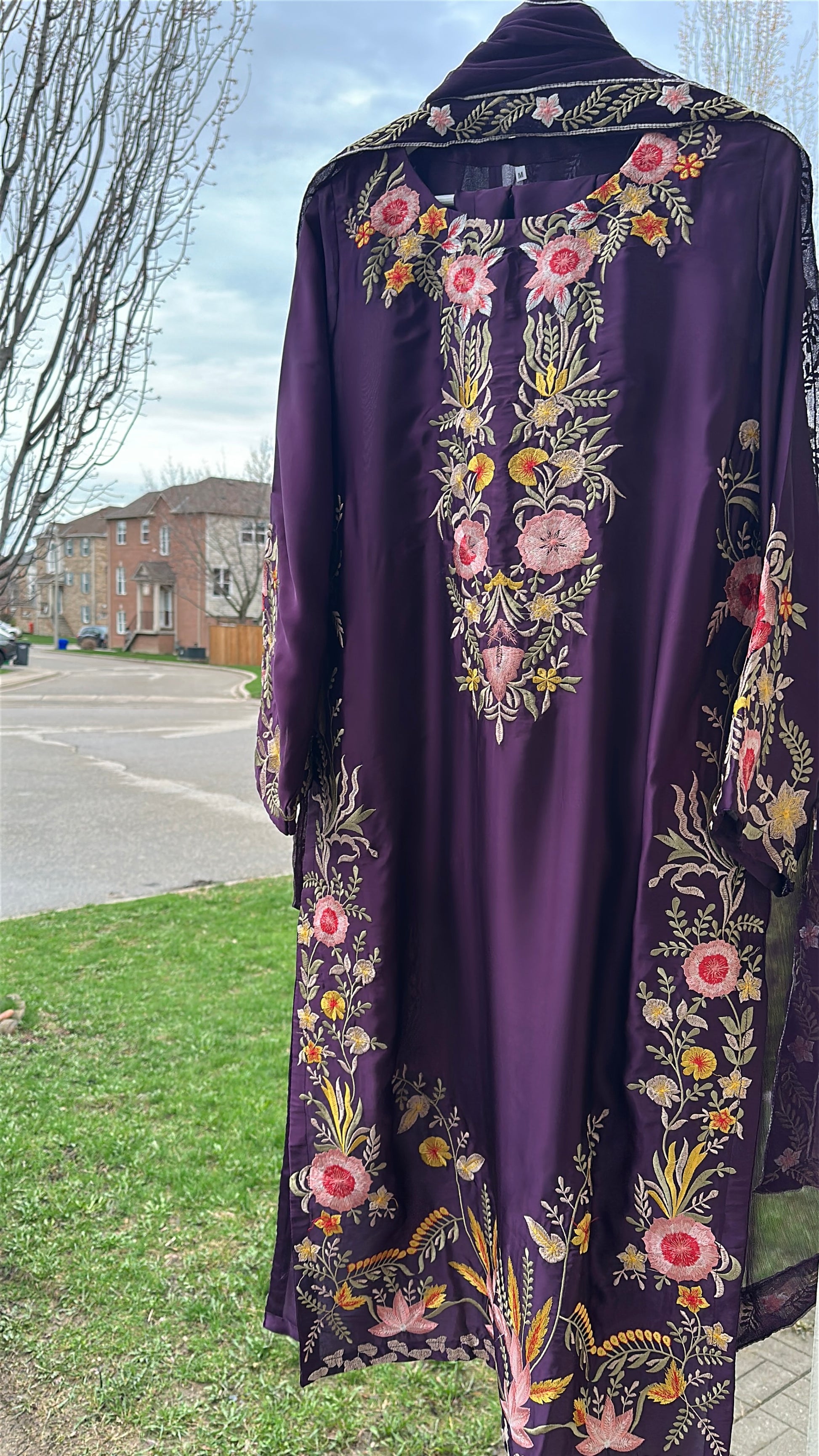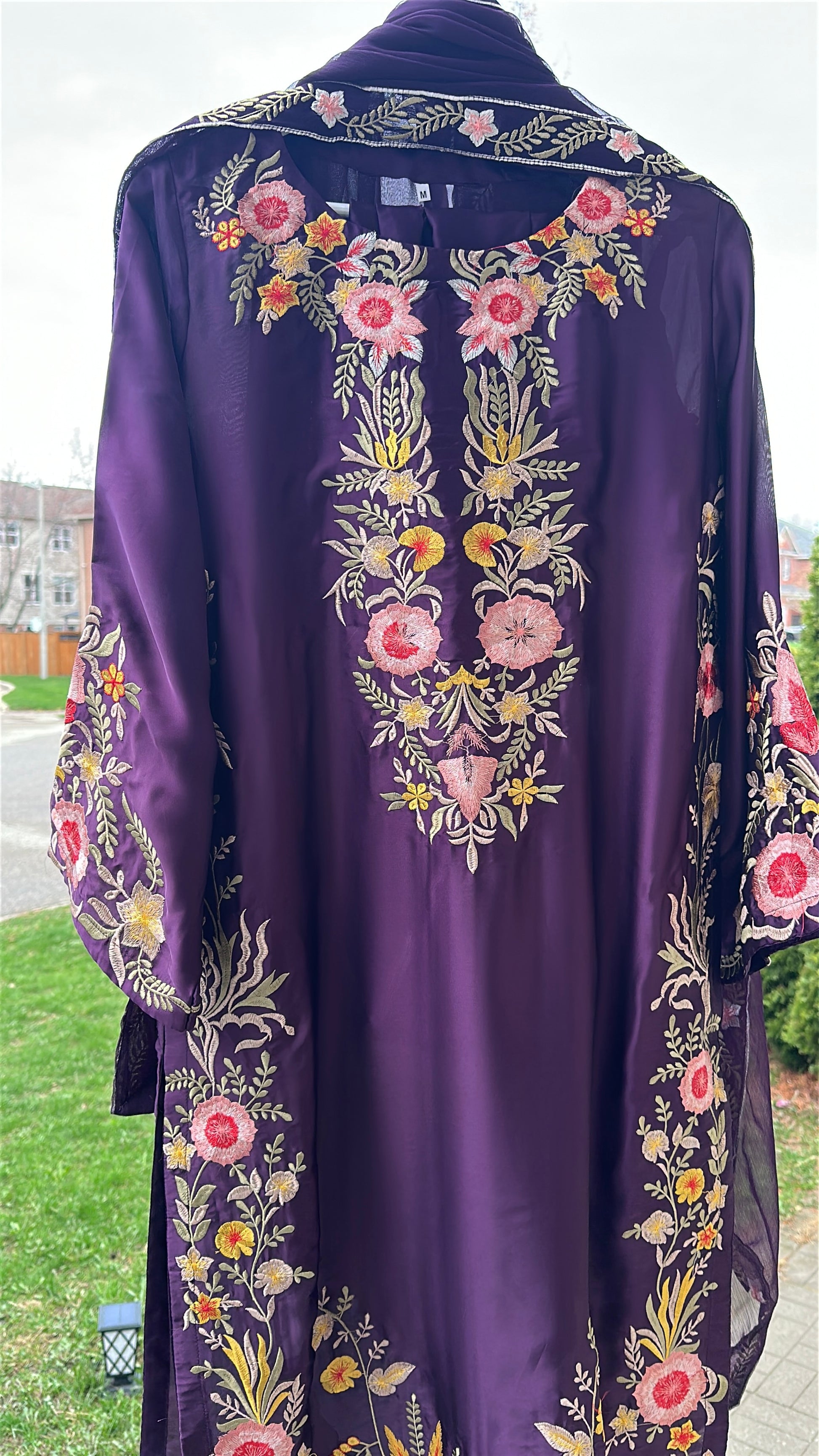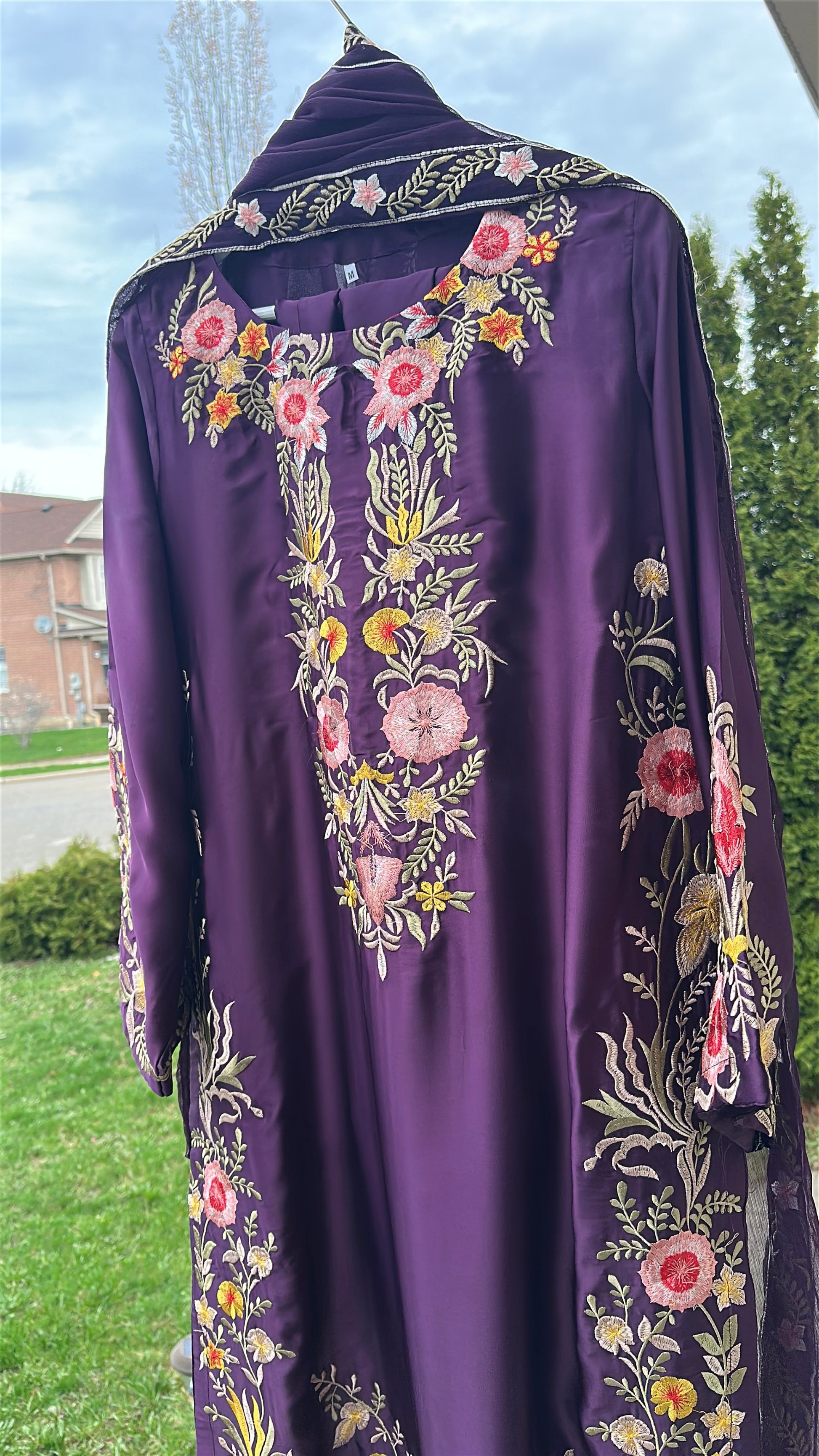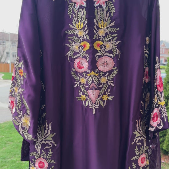 A 3-piece ensemble crafted from rich raw silk, Midnight Gulnaar Élan captures the depth of deep plum tones, brought to life with intricate, hand-inspired floral embroidery. Designed in a graceful kaftan-style silhouette, it blends tradition with a modern, flowy elegance that feels effortlessly regal.
