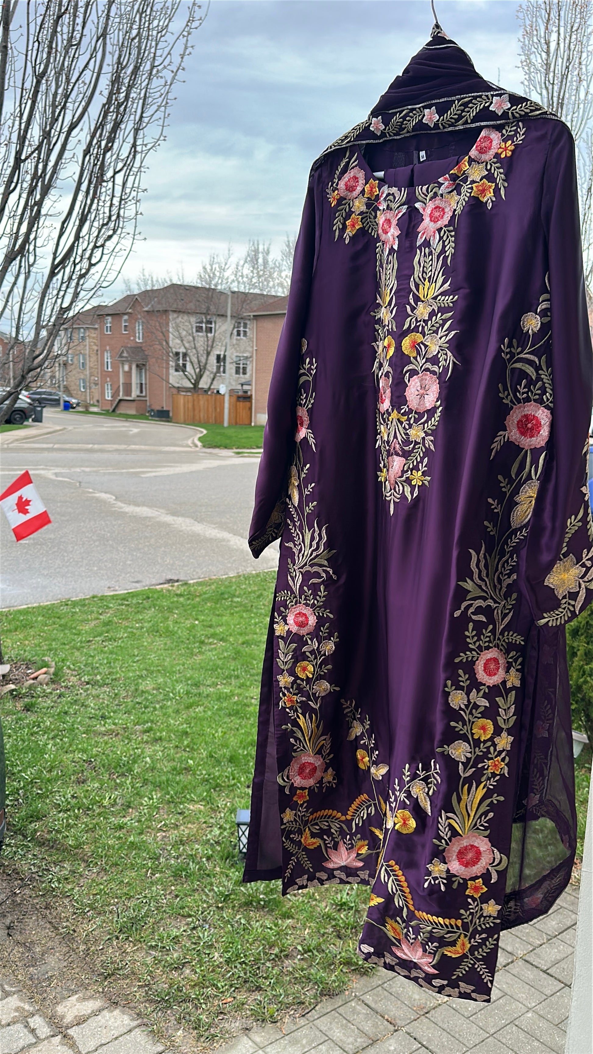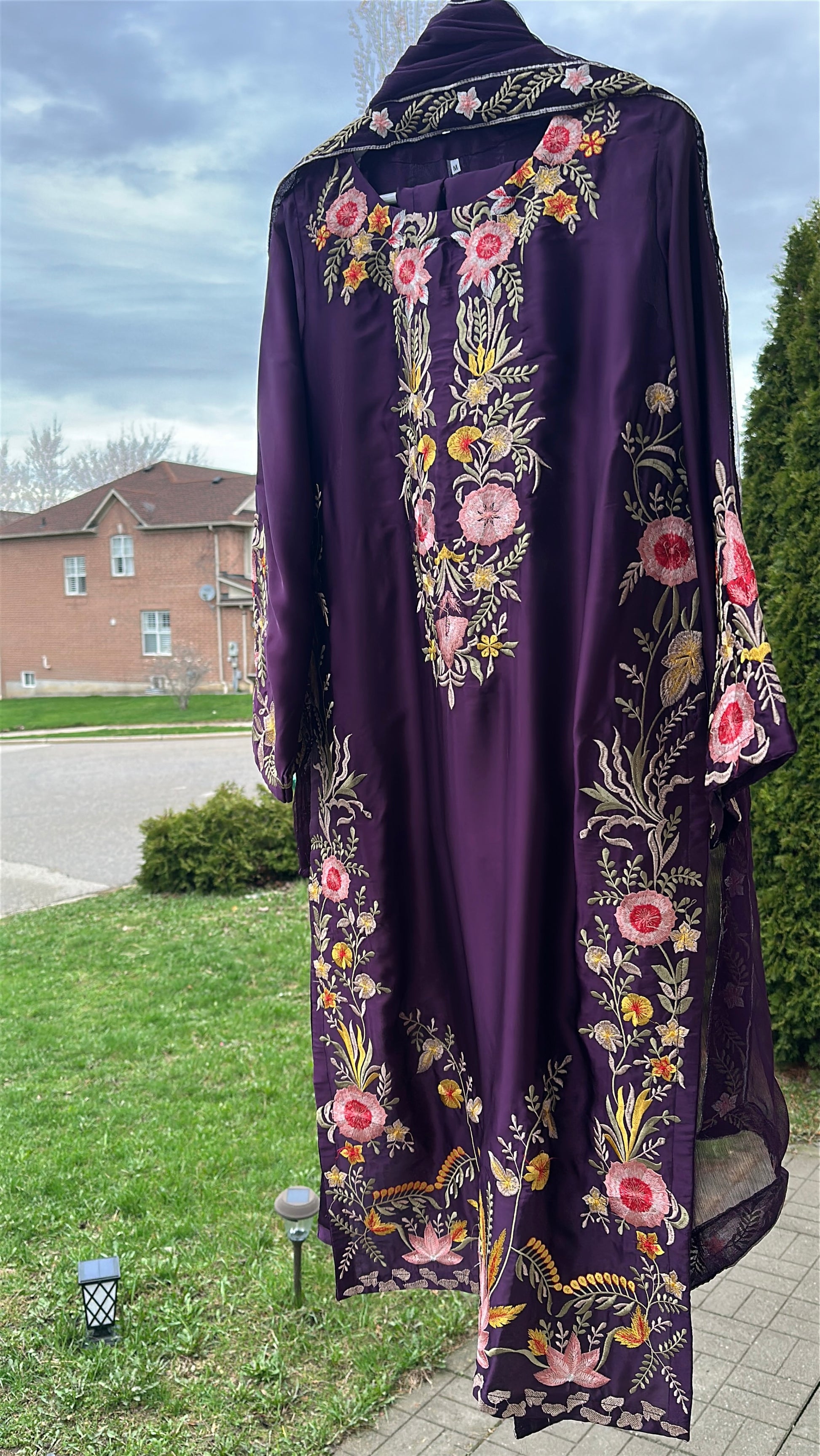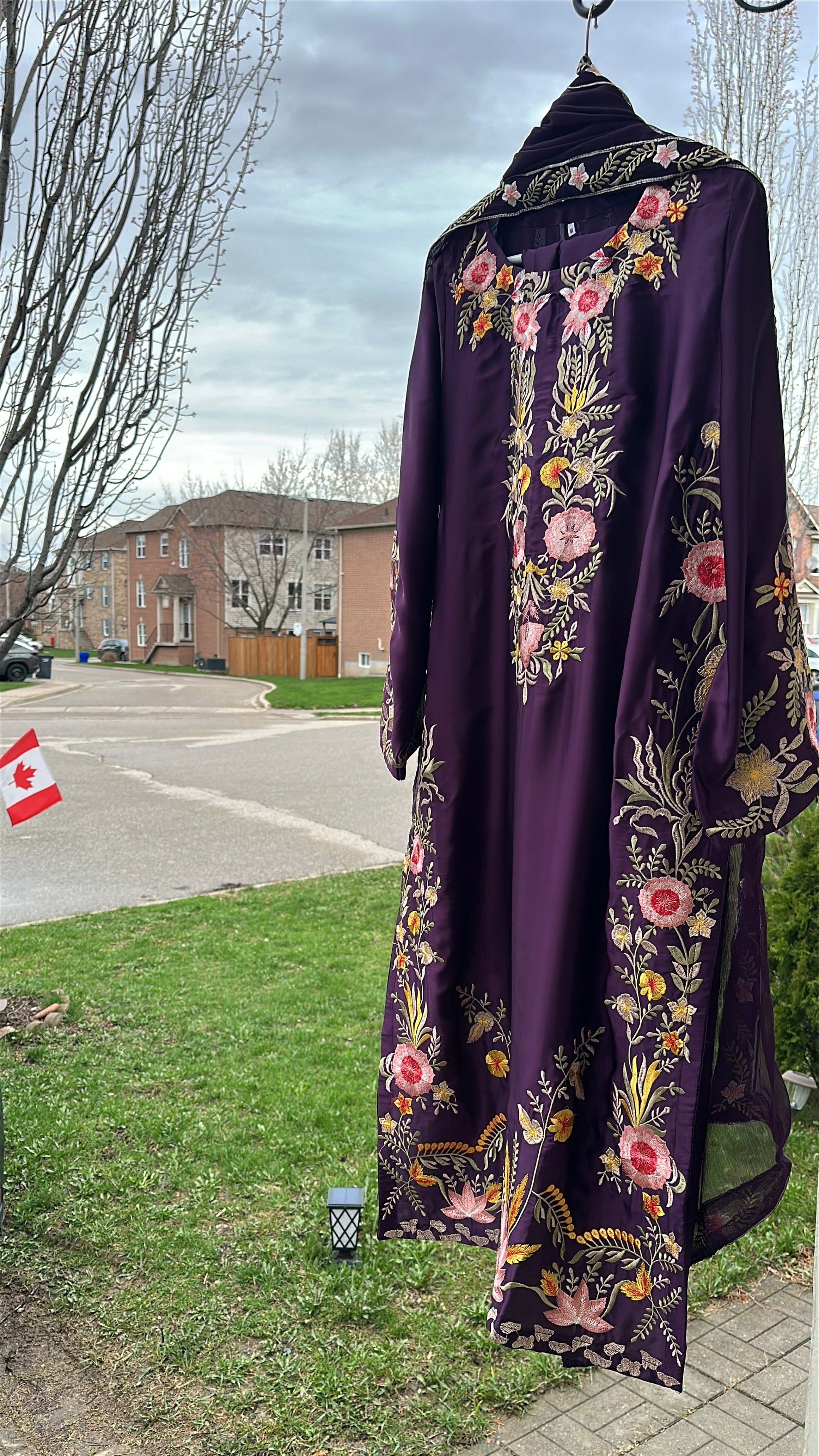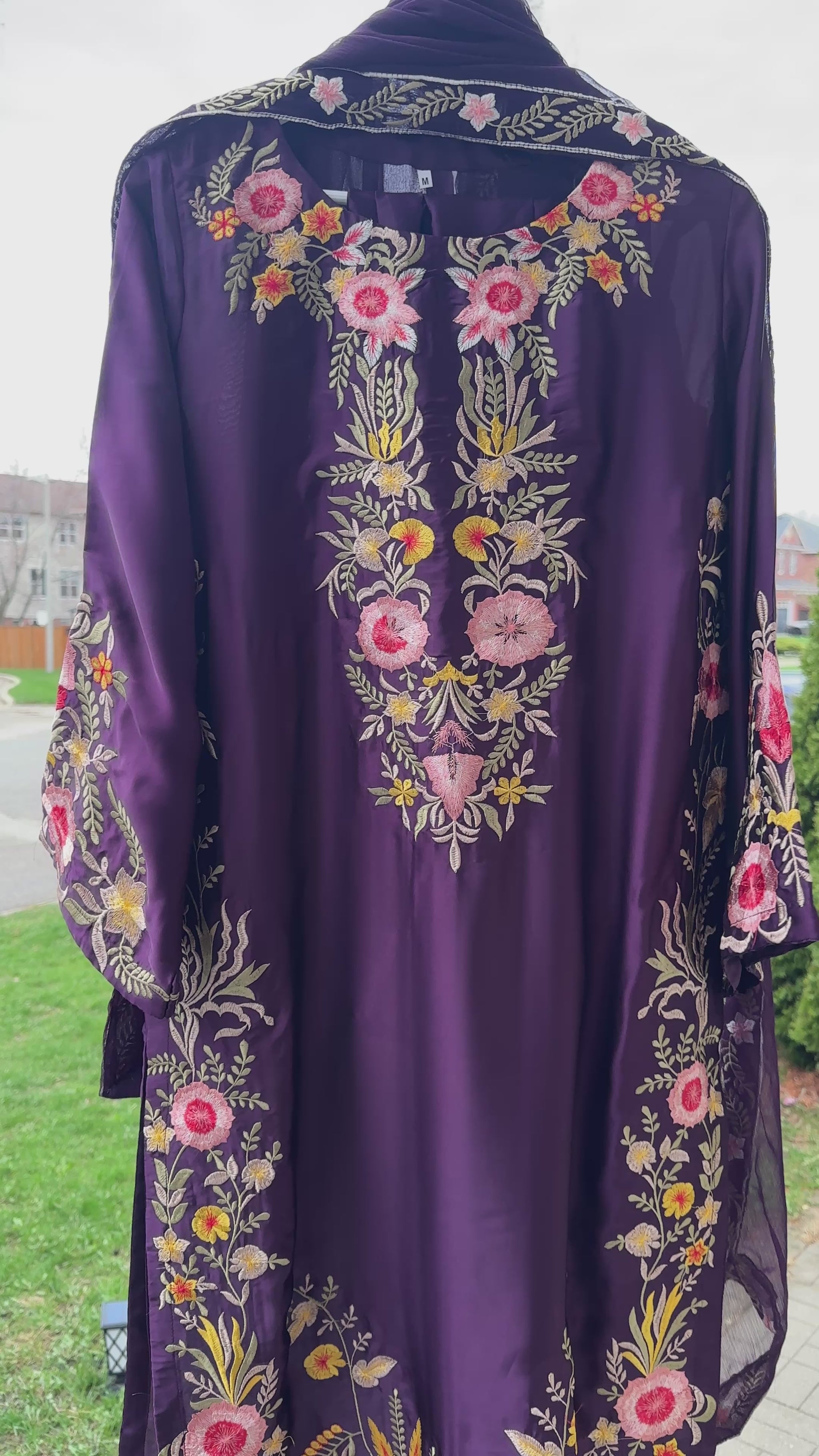 A 3-piece ensemble crafted from rich raw silk, Midnight Gulnaar Élan captures the depth of deep plum tones, brought to life with intricate, hand-inspired floral embroidery. Designed in a graceful kaftan-style silhouette, it blends tradition with a modern, flowy elegance that feels effortlessly regal.