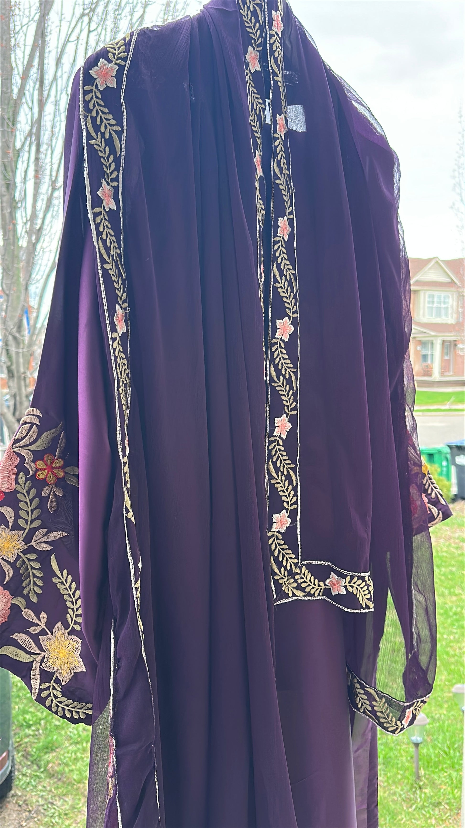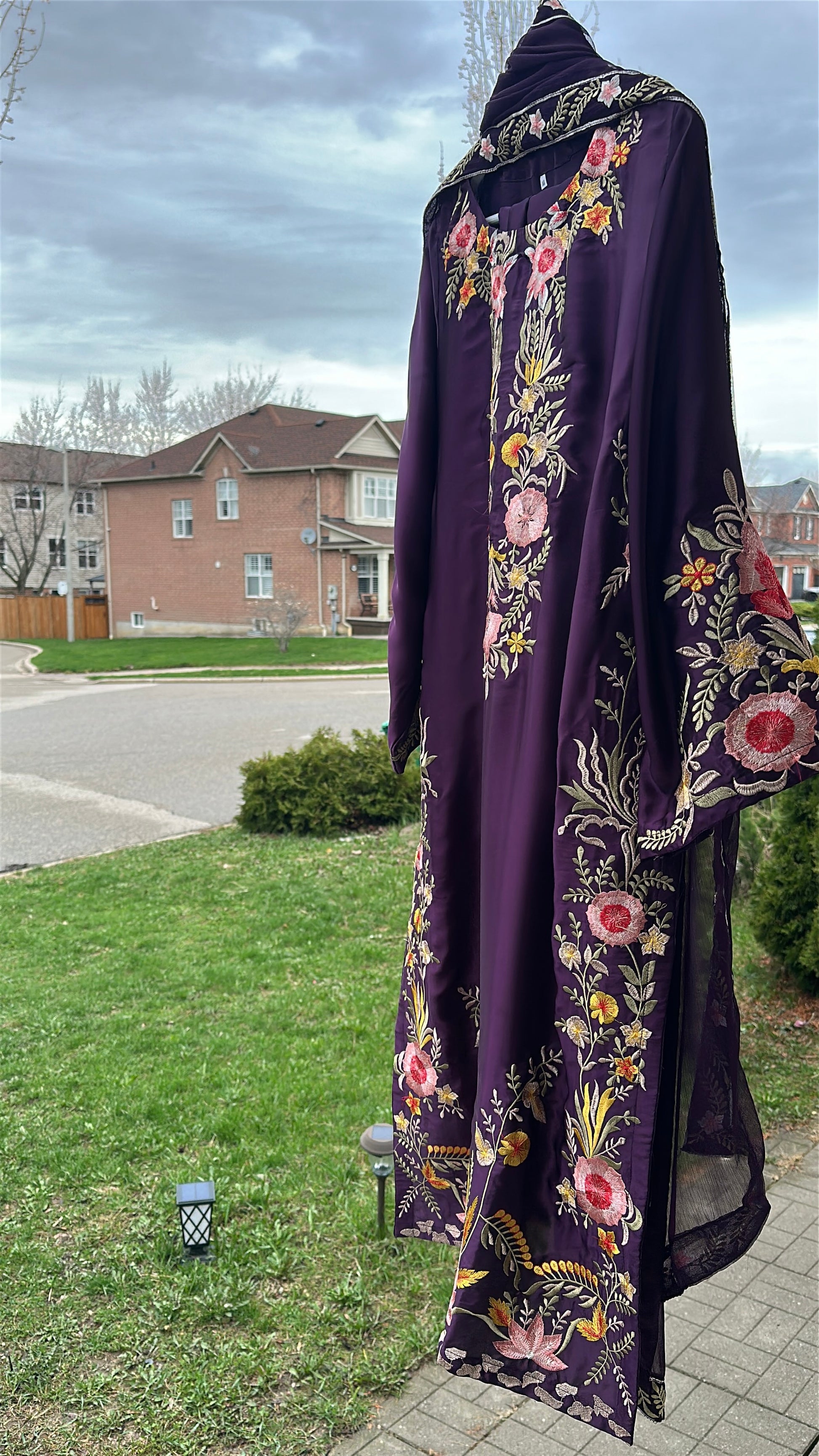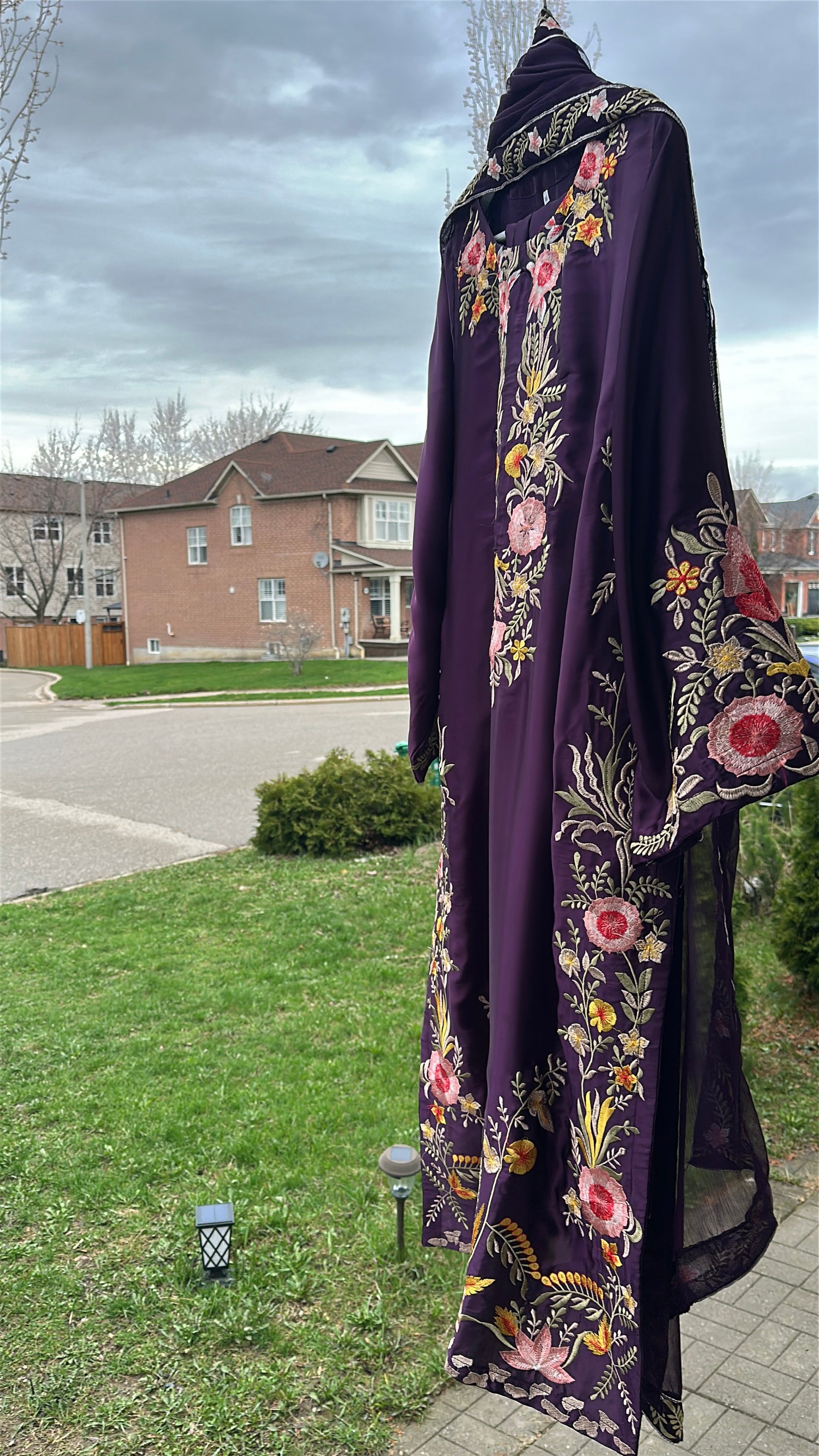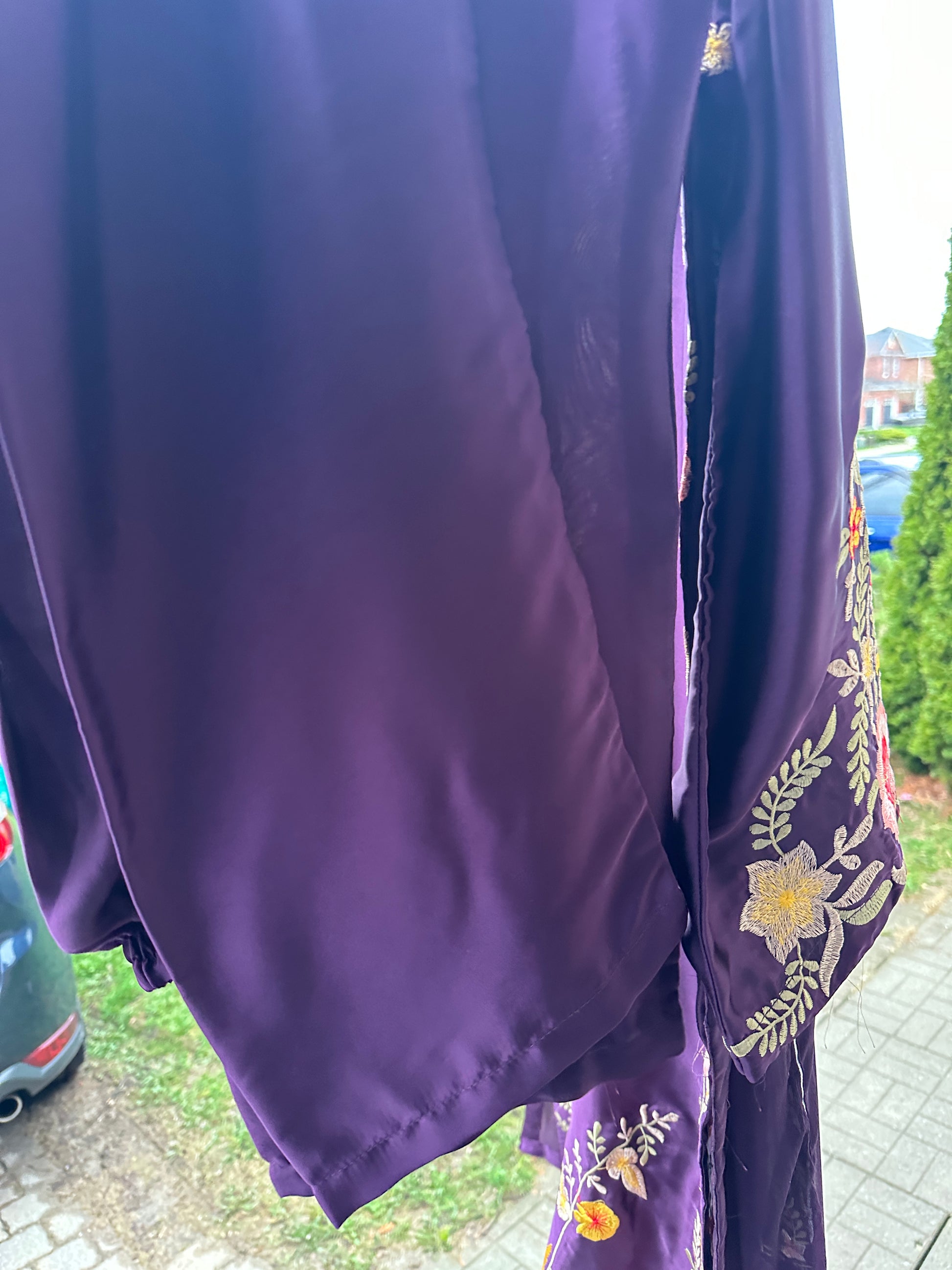 A 3-piece ensemble crafted from rich raw silk, Midnight Gulnaar Élan captures the depth of deep plum tones, brought to life with intricate, hand-inspired floral embroidery. Designed in a graceful kaftan-style silhouette, it blends tradition with a modern, flowy elegance that feels effortlessly regal.
