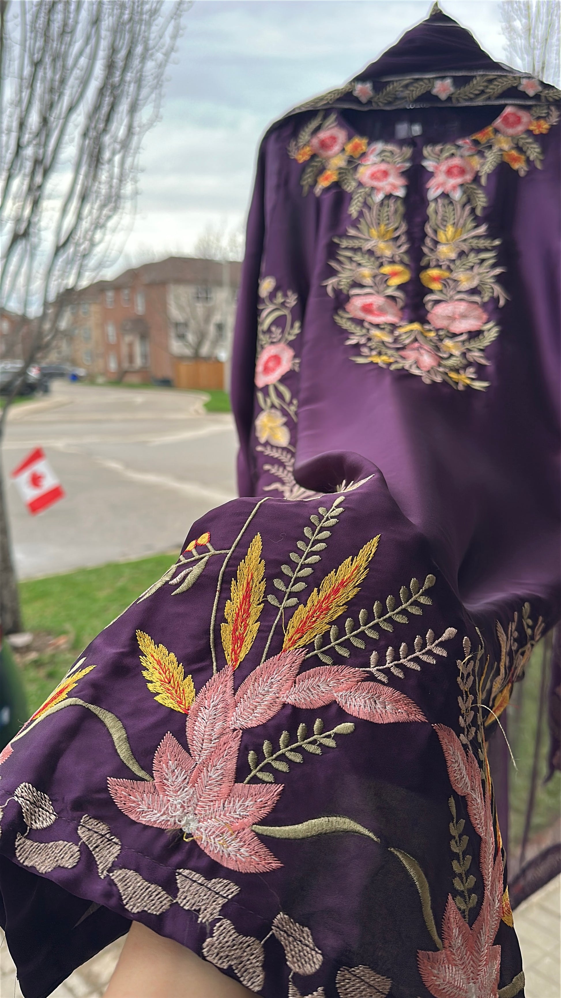 The deep base is adorned with vibrant multi-tonal embroidery in rose pink, ivory, soft gold, and hints of yellow and sage. The neckline flows beautifully into the front panel, while the sleeves and hem are finished with detailed botanical motifs — creating a look that feels timeless, rich, and quietly statement-making.