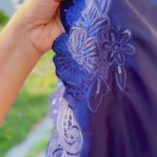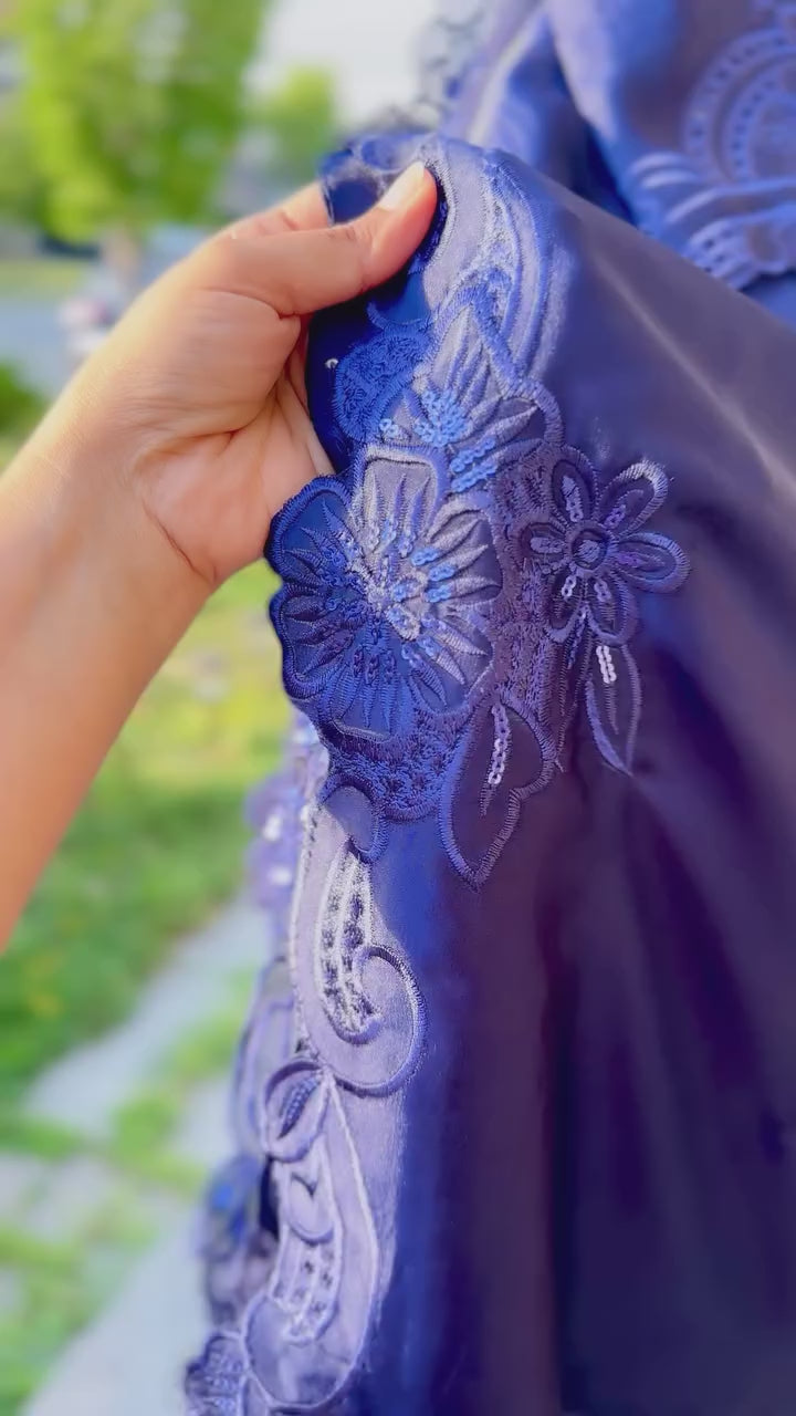 Crafted from rich zinc blue satin silk, Midnight Muse features exquisite cutwork detailing and hand-placed sequins that subtly shimmer from neckline to hem. The matching straight pants are finished with coordinating cutwork borders, while the dupatta completes the look with intricate detailing for a regal, effortless, and timeless ensemble.