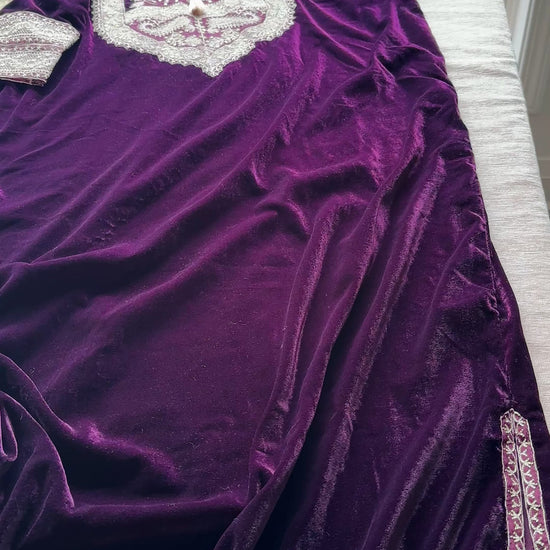 A one-piece kaftan crafted from luxurious micro velvet, Mulberry Plum Kaftan captures the richness of deep plum tones with timeless Eastern elegance. The velvet carries a soft, luminous sheen that instantly elevates the look while remaining effortlessly graceful.