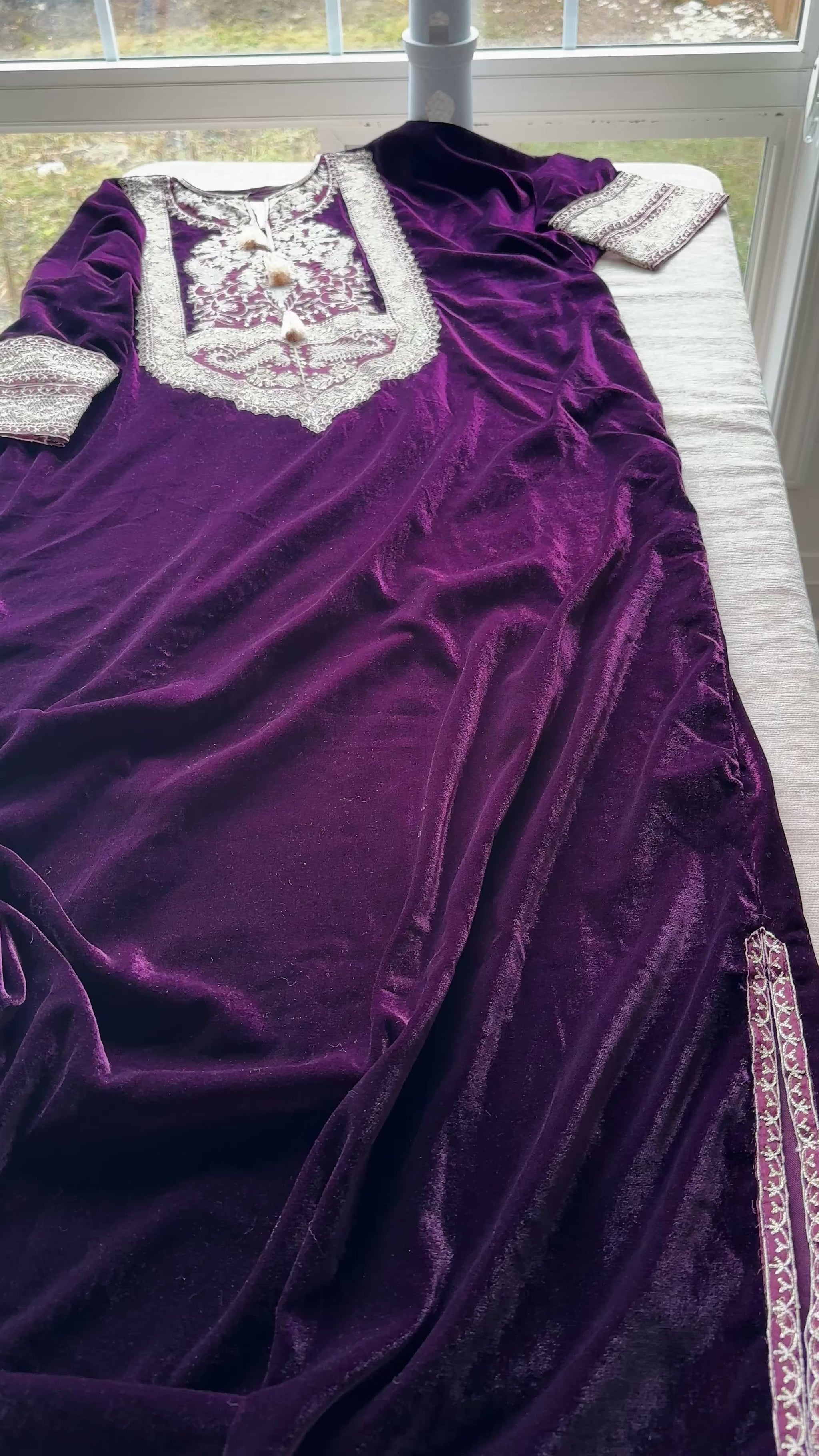 The kaftan features intricate ivory embroidery along the neckline, sleeves, and hem, creating a striking contrast against the rich mulberry plum base. The embroidered neckline panel adds a traditional handcrafted feel, while the detailed borders on the sleeves and bottom bring refined sophistication to the silhouette.