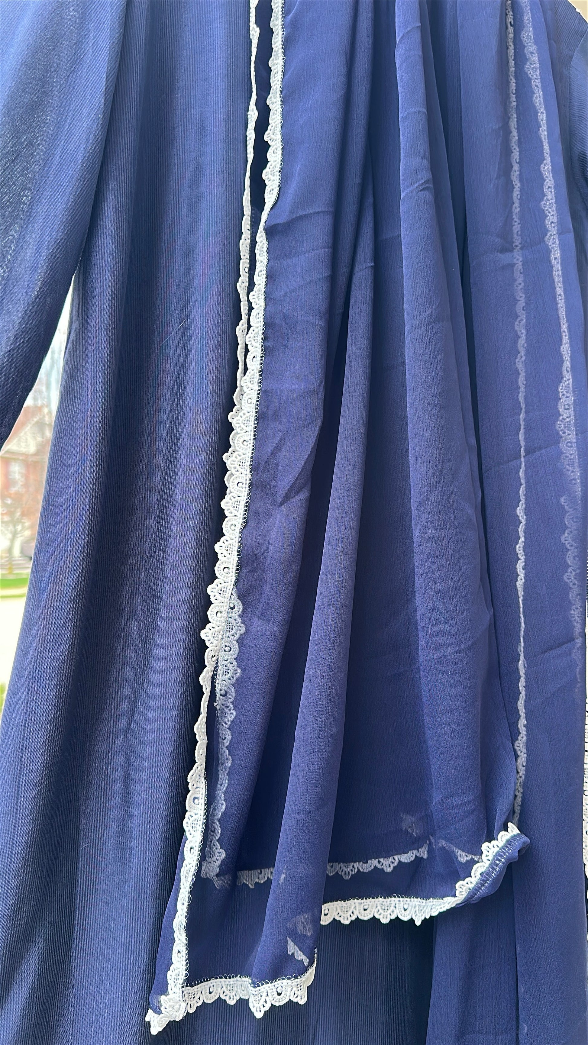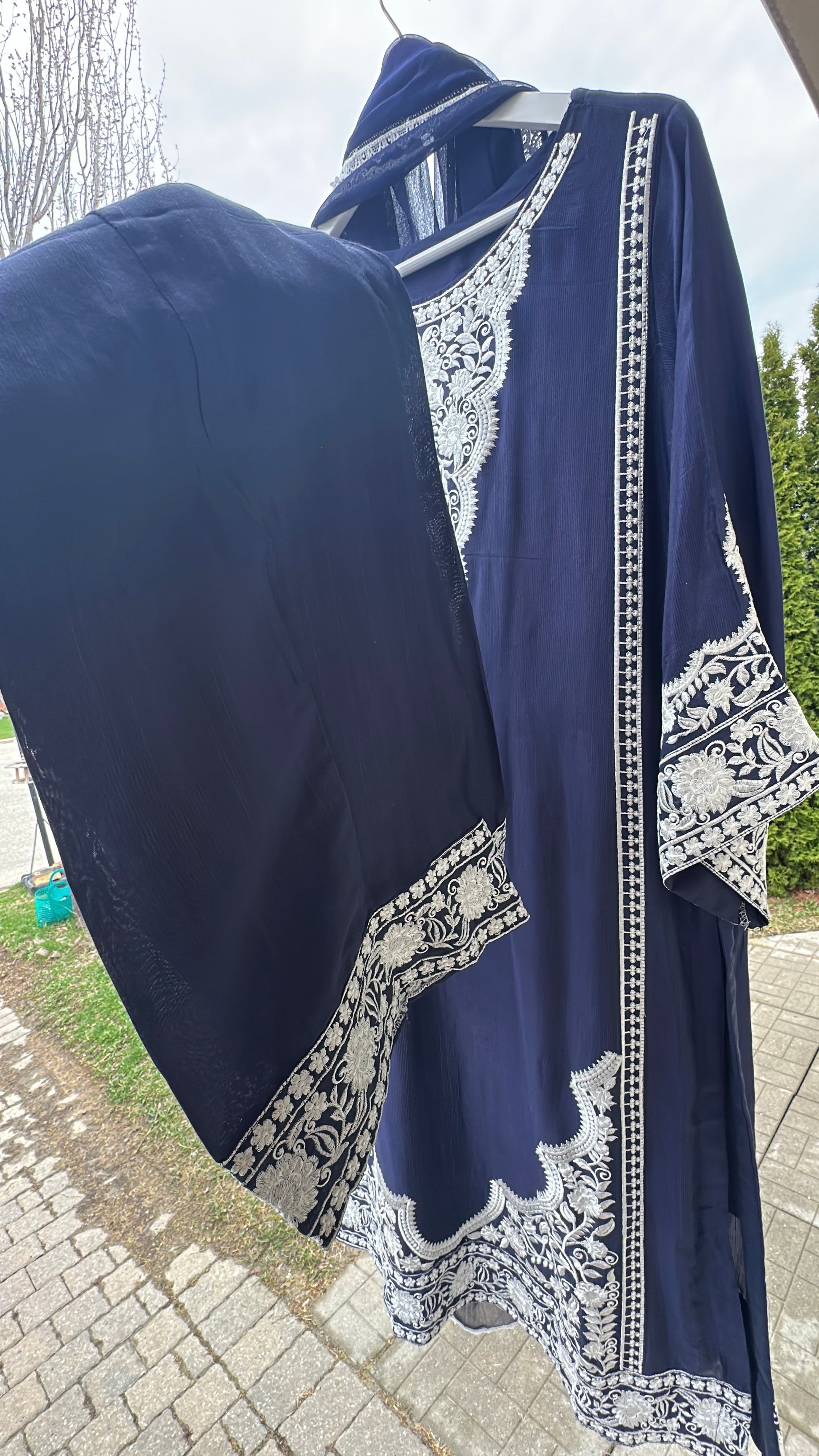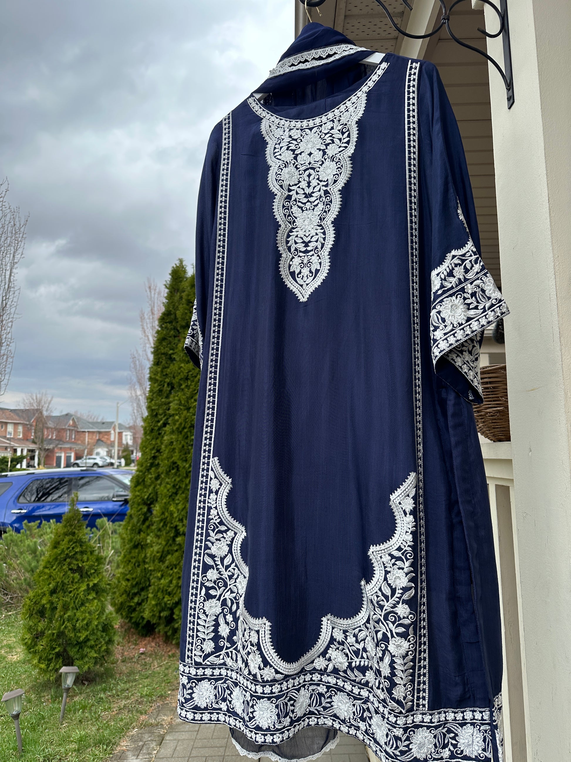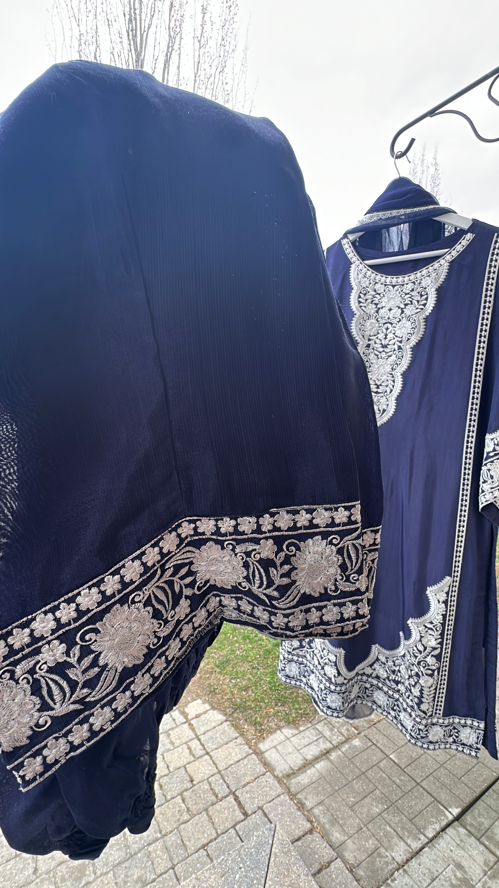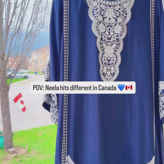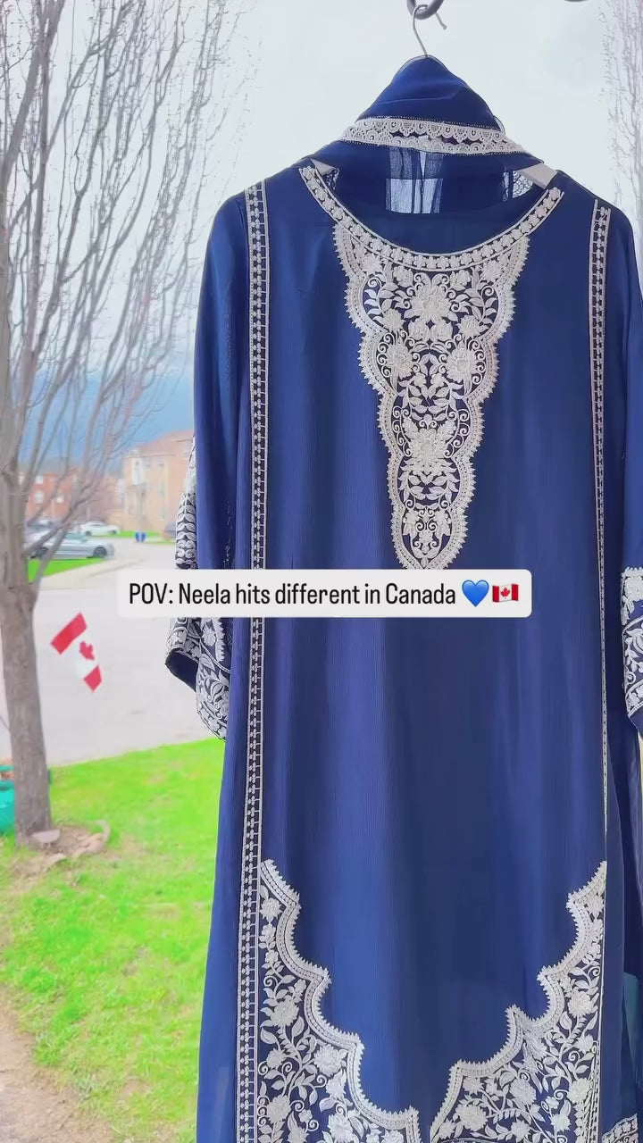 A 3-piece ensemble crafted from luxurious cotton silk, Neela Noor Élan captures the depth of rich navy tones with timeless sophistication. The shirt features intricate ivory embroidery across the neckline, sleeves, and hem, creating a regal contrast that feels both refined and effortlessly graceful. Paired with sleek straight pants and a lightweight chiffon dupatta, this look flows with understated elegance — perfect for moments when you want to feel elevated without trying too hard.