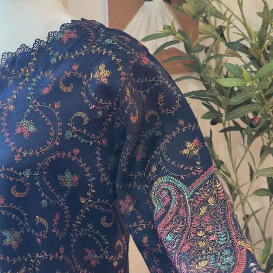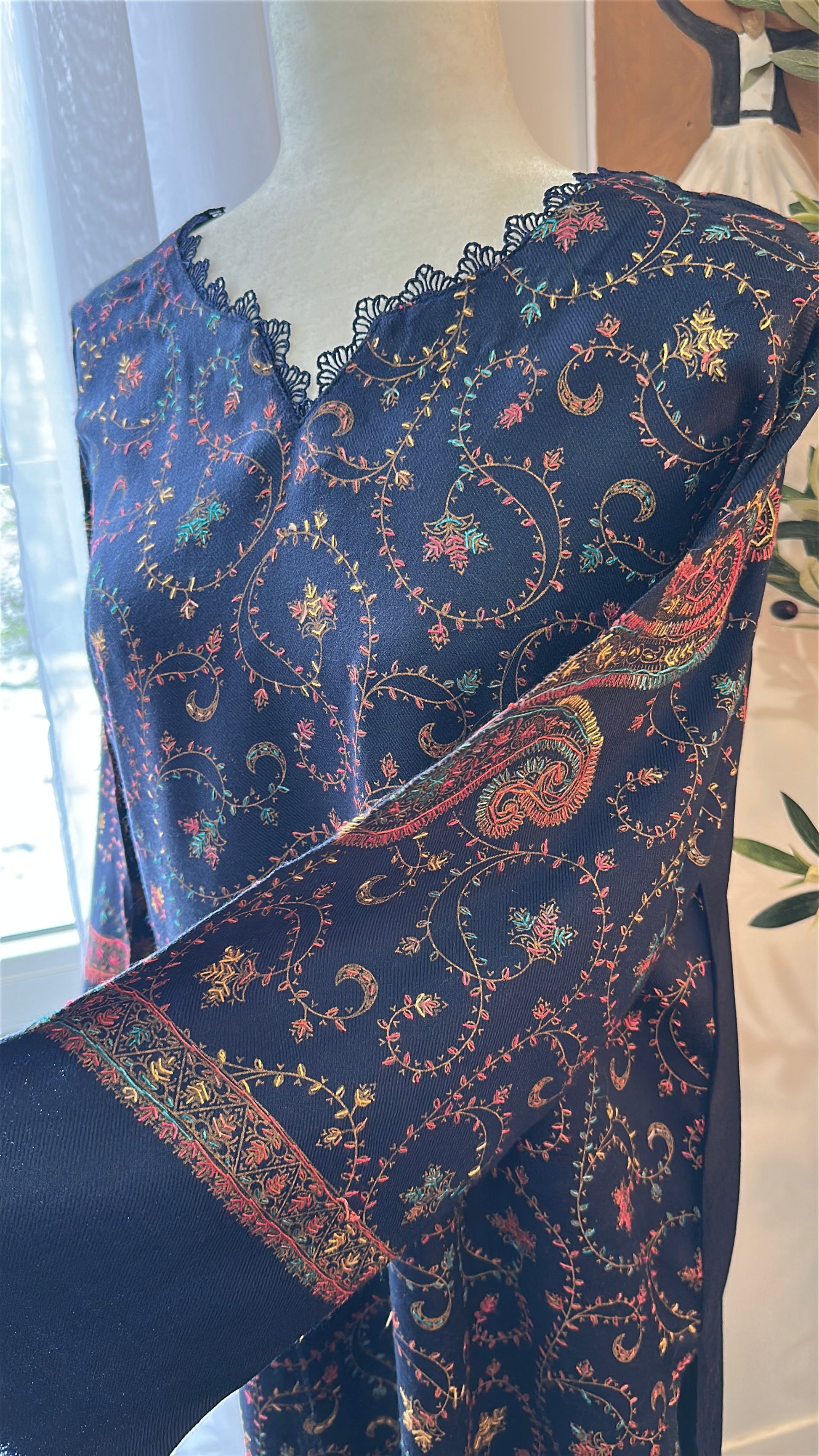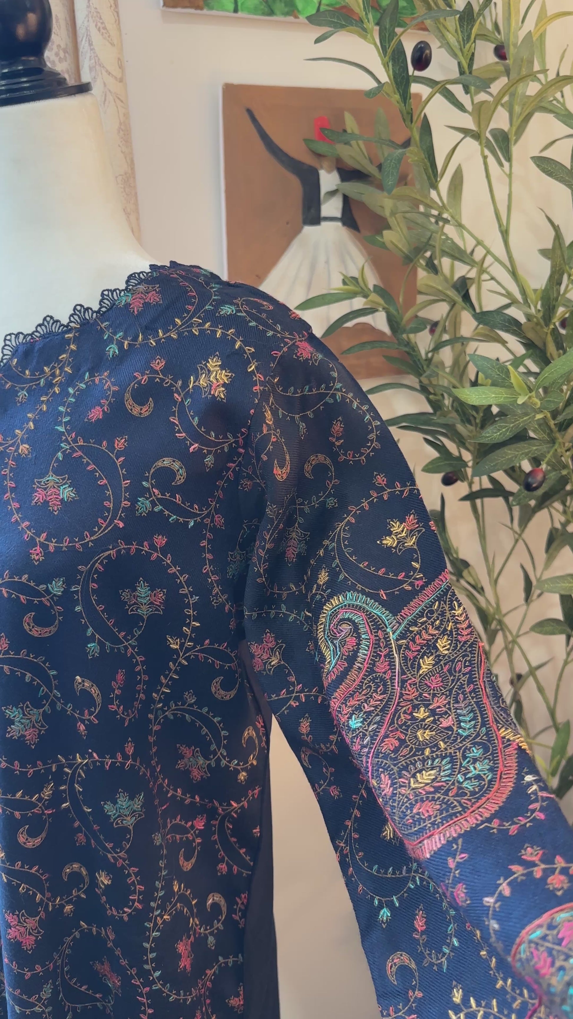 A one-piece stitched Kalamkari Pashmina Shawl Shirt, Noor-e-Neelam embodies the elegance of deep navy tones adorned with multicolored Kashmiri embroidery. Each vine and motif is delicately hand-detailed on soft Pashmina, creating a timeless piece that feels both regal and cozy. The back is plain Marina, adding comfort and simplicity to its luxurious front.