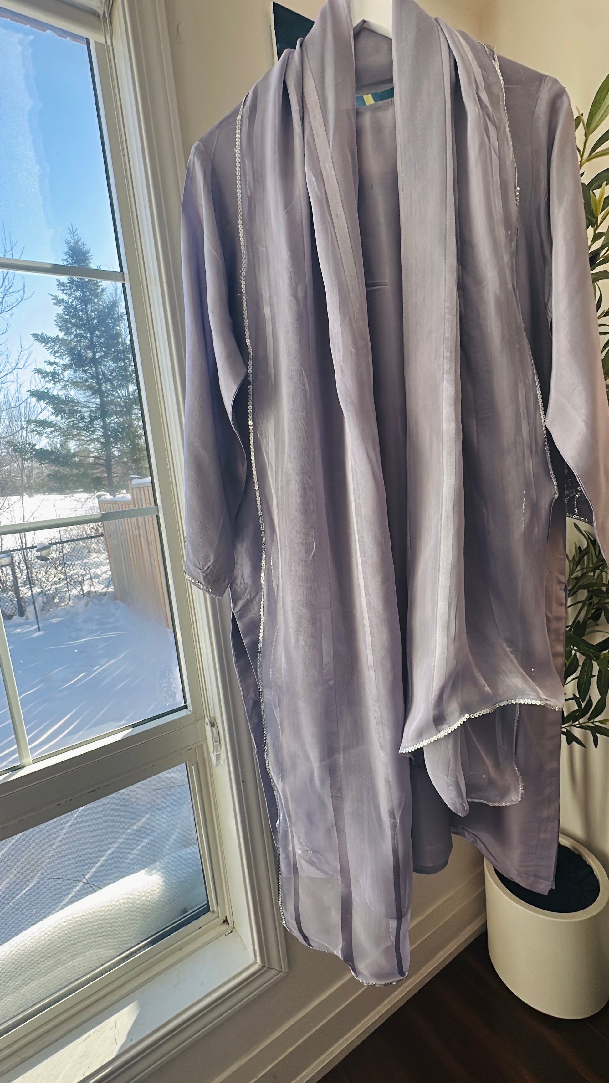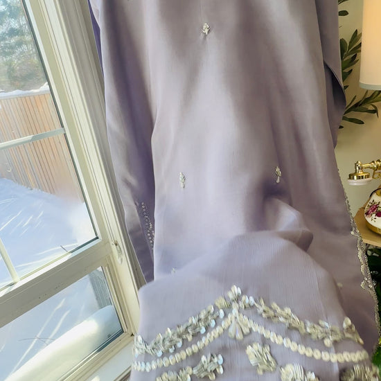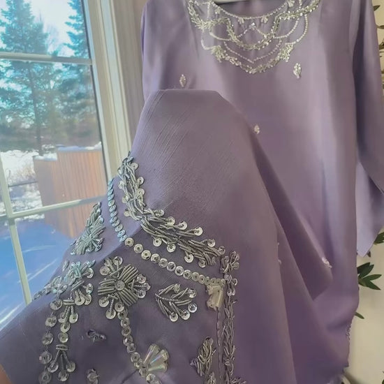 A graceful 3-piece ensemble crafted from premium silk, Noor-e-Sukoon embodies quiet elegance and timeless composure. Rendered in a soft dusky lavender hue with cool grey undertones, this shade feels calm, sophisticated, and effortlessly refined—subtly luminous under natural light.