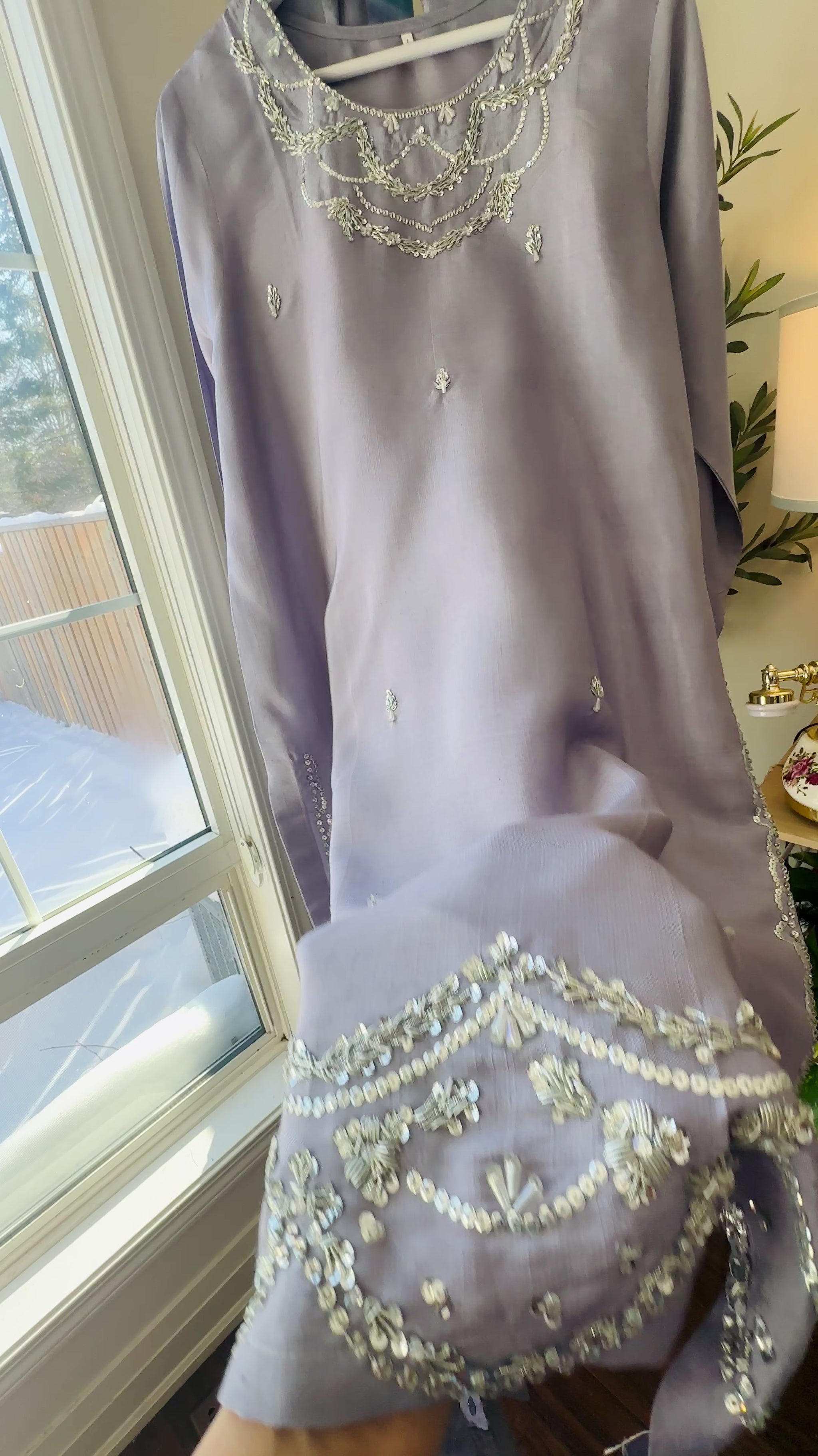 The silk shirt features delicate hand embroidery and subtle sequin embellishments, with an intricately embroidered neckline, sleeves, and hem that add a gentle shimmer without overpowering the look. Finished at a 45-inch length, the silhouette is fluid, modest, and gracefully flattering.