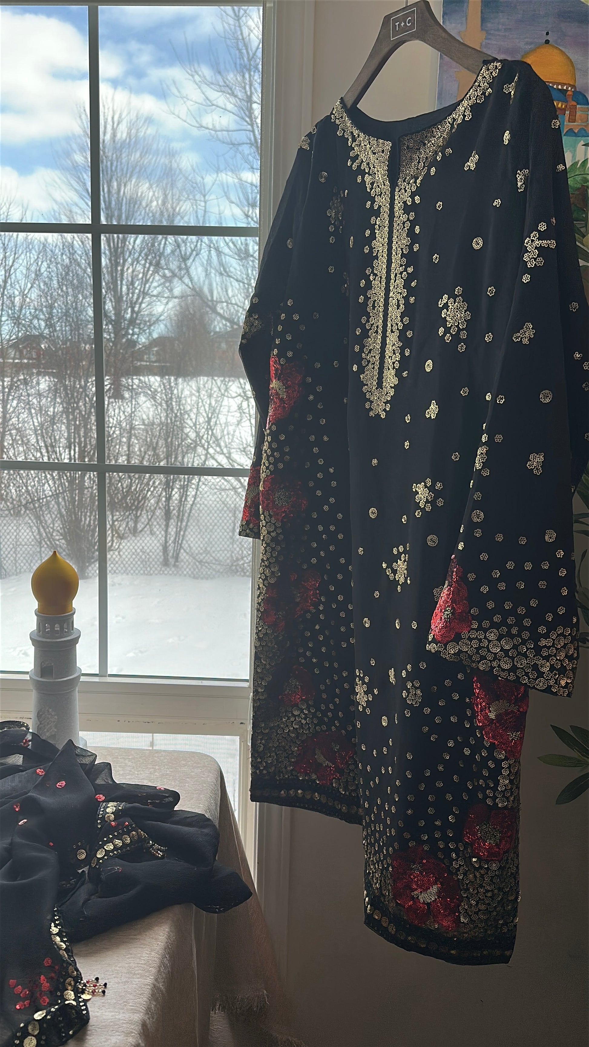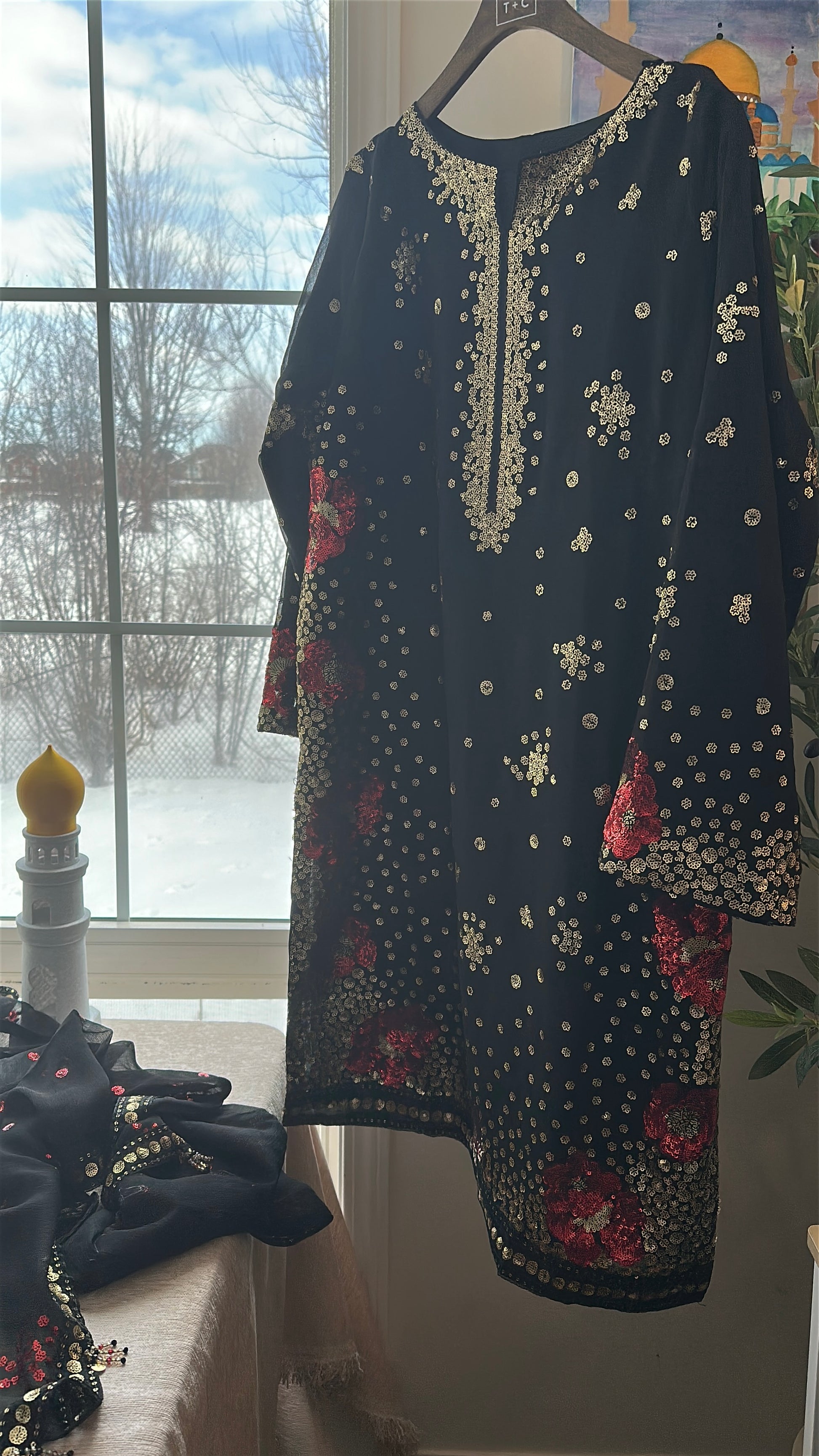 A 3-piece ensemble crafted on premium chiffon, Obsidian Rose blends dramatic winter luxury with timeless shaadi elegance. The shirt features heavy sequins & sitara embroidery in rich black, red, and gold tones, paired with a silk shalwar for a regal finish. The look is completed with a flowy chiffon dupatta adorned with delicate tassels — fiery, graceful, unforgettable.