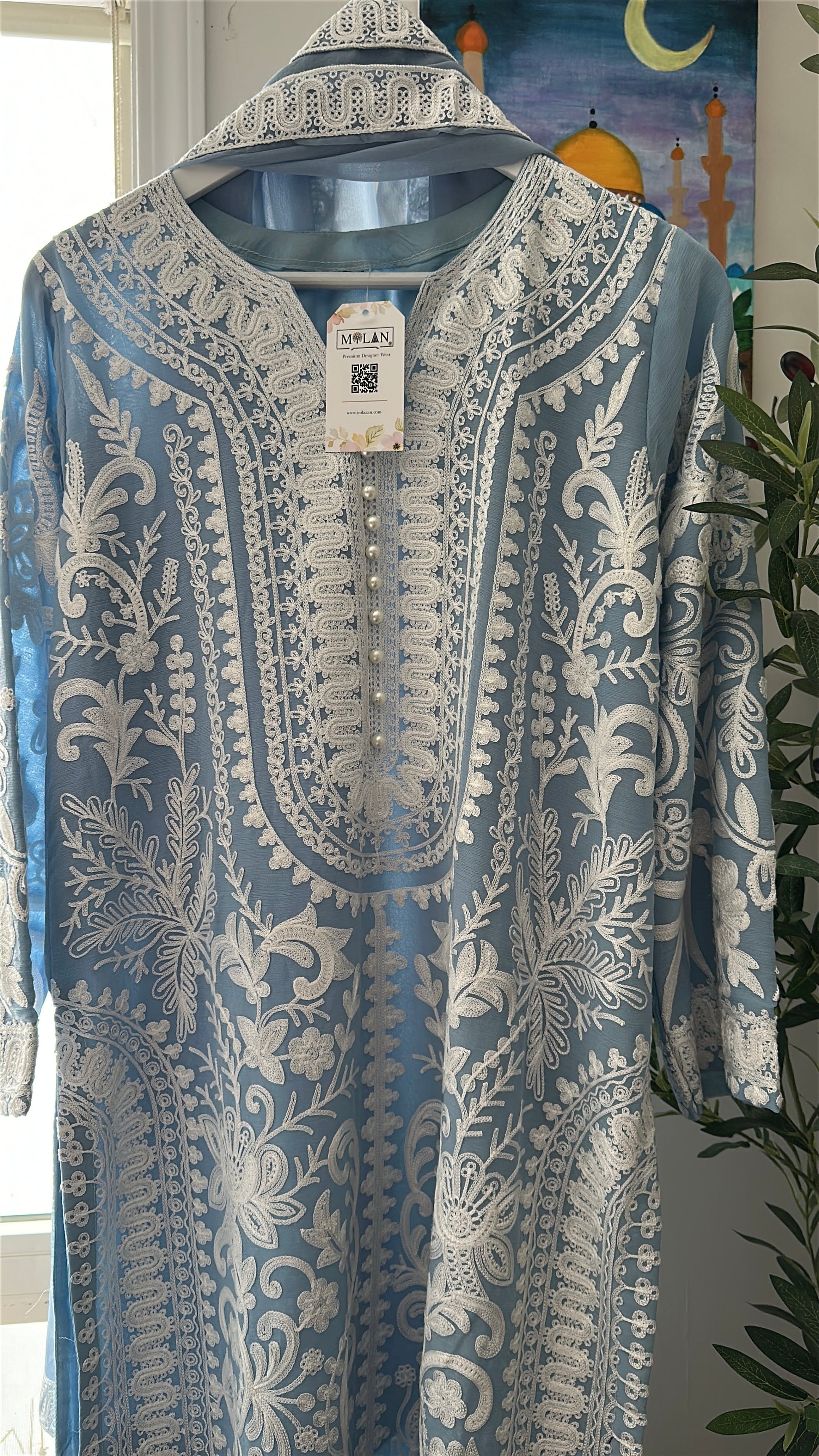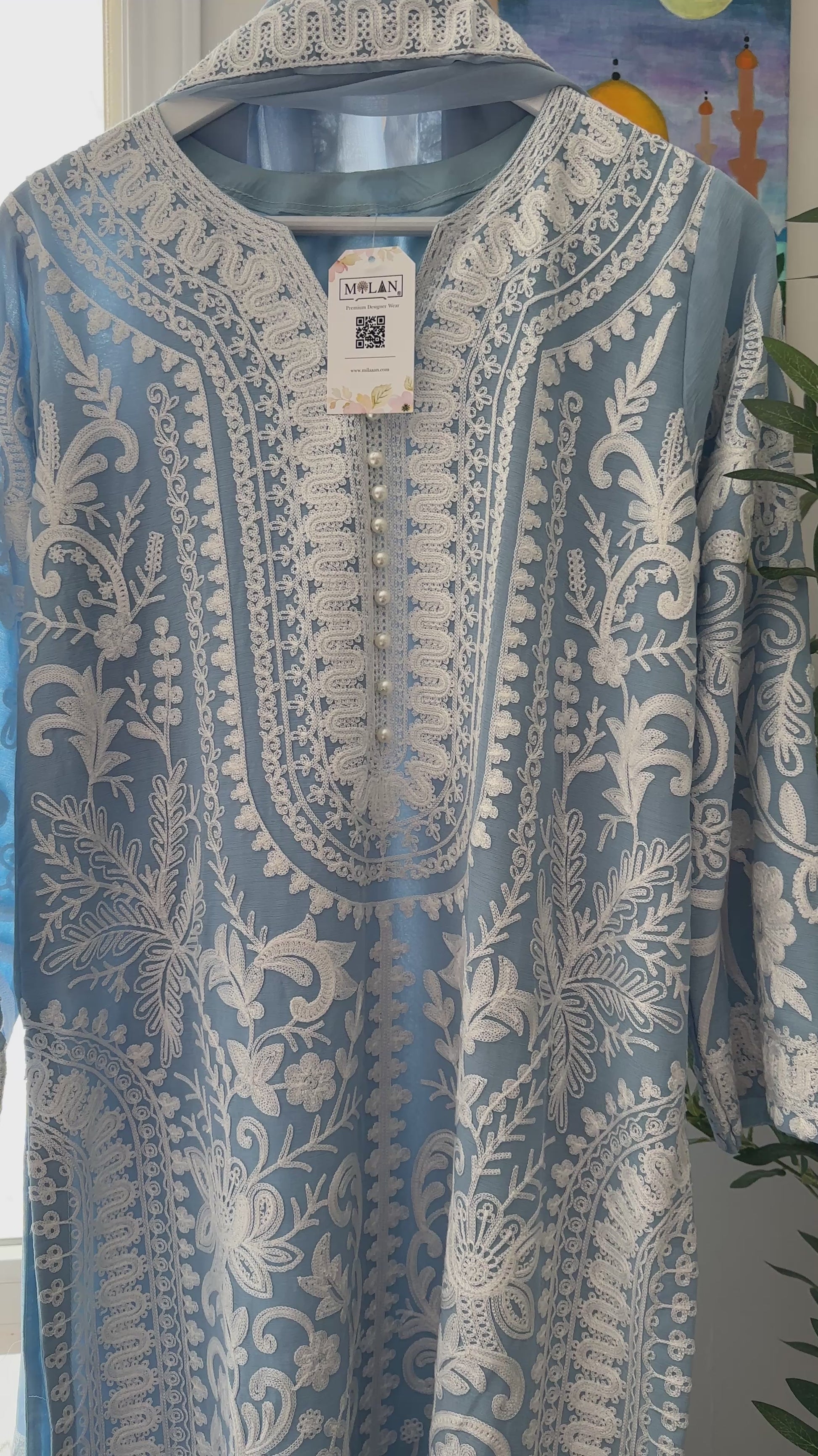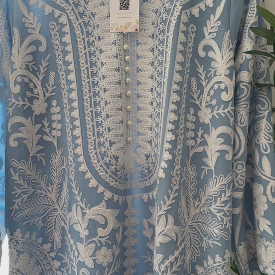 A 3-piece ensemble crafted from premium chiffon, Powder Sky Élan captures the serenity of soft powder-blue tones paired with intricate ivory aari embroidery, creating a look that feels airy, graceful, and effortlessly refined. The shirt showcases elaborate traditional aari craftsmanship flowing across the neckline, front panels, sleeves, and hem, forming a striking contrast against the delicate powder sky base. The neckline is beautifully finished with pearl embellishments, adding a subtle shimmer that enhances the elegance of the ensemble.