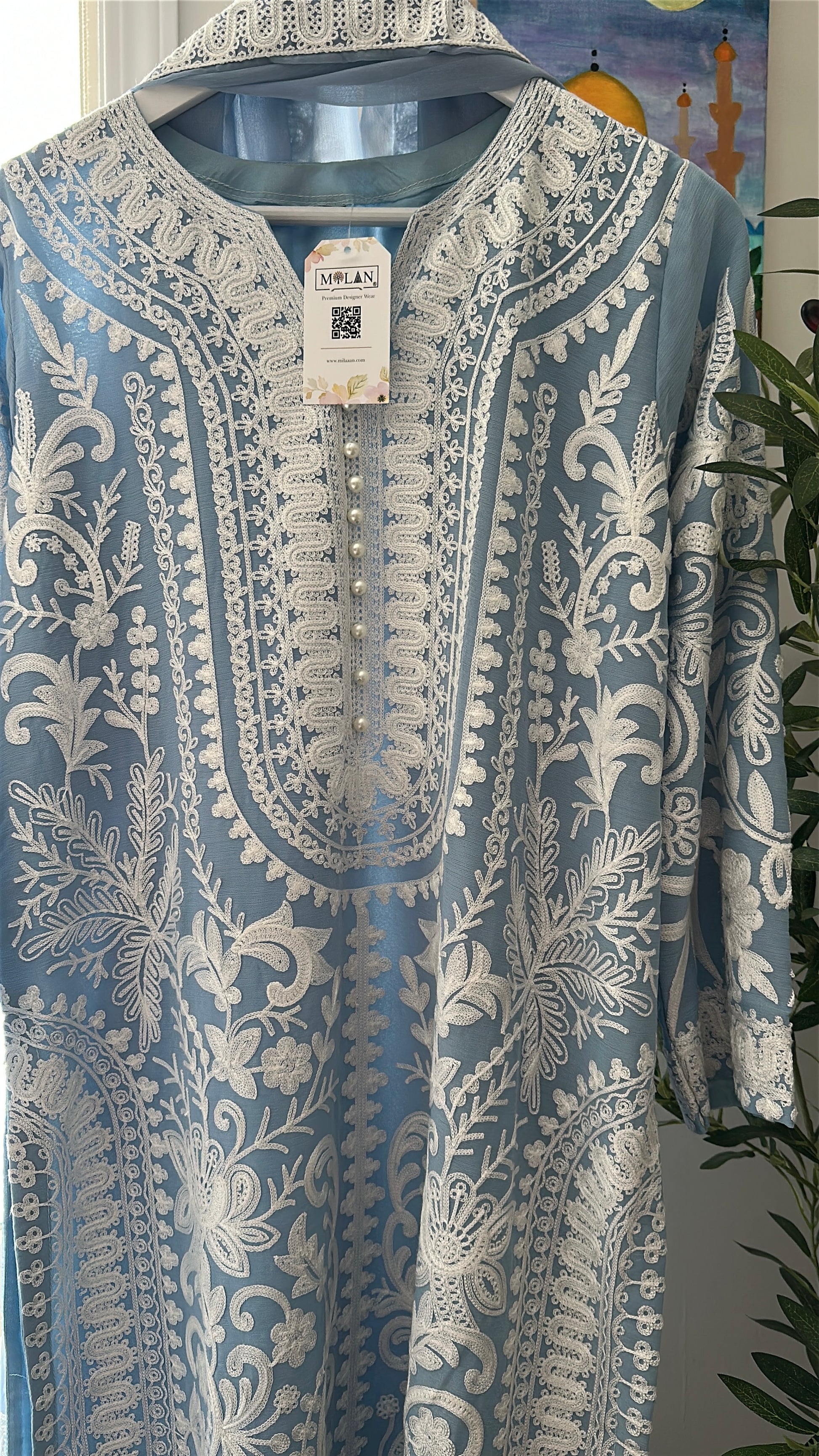 • 🧵 Premium chiffon shirt with intricate ivory aari embroidery