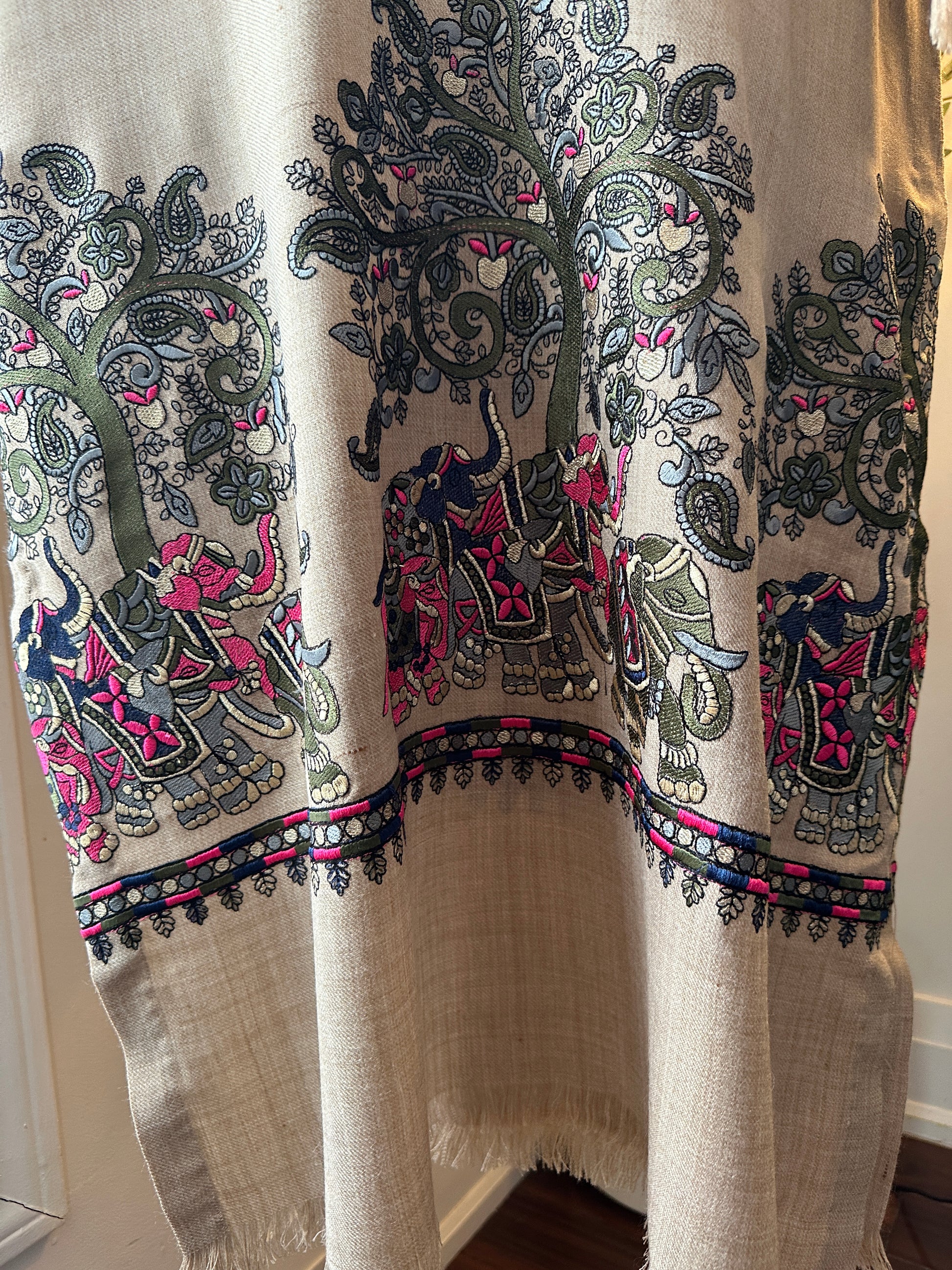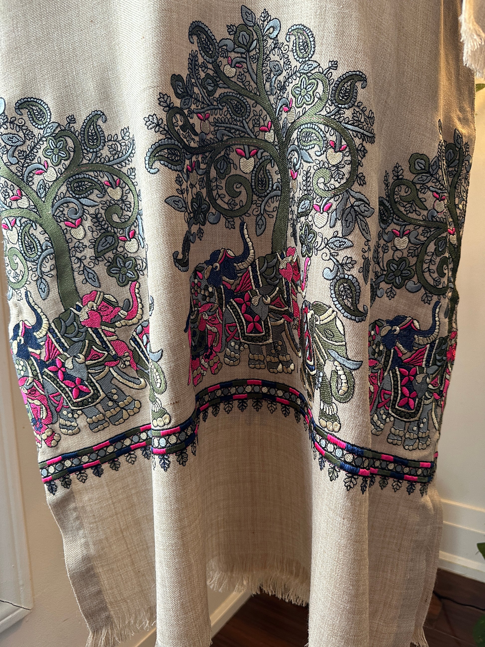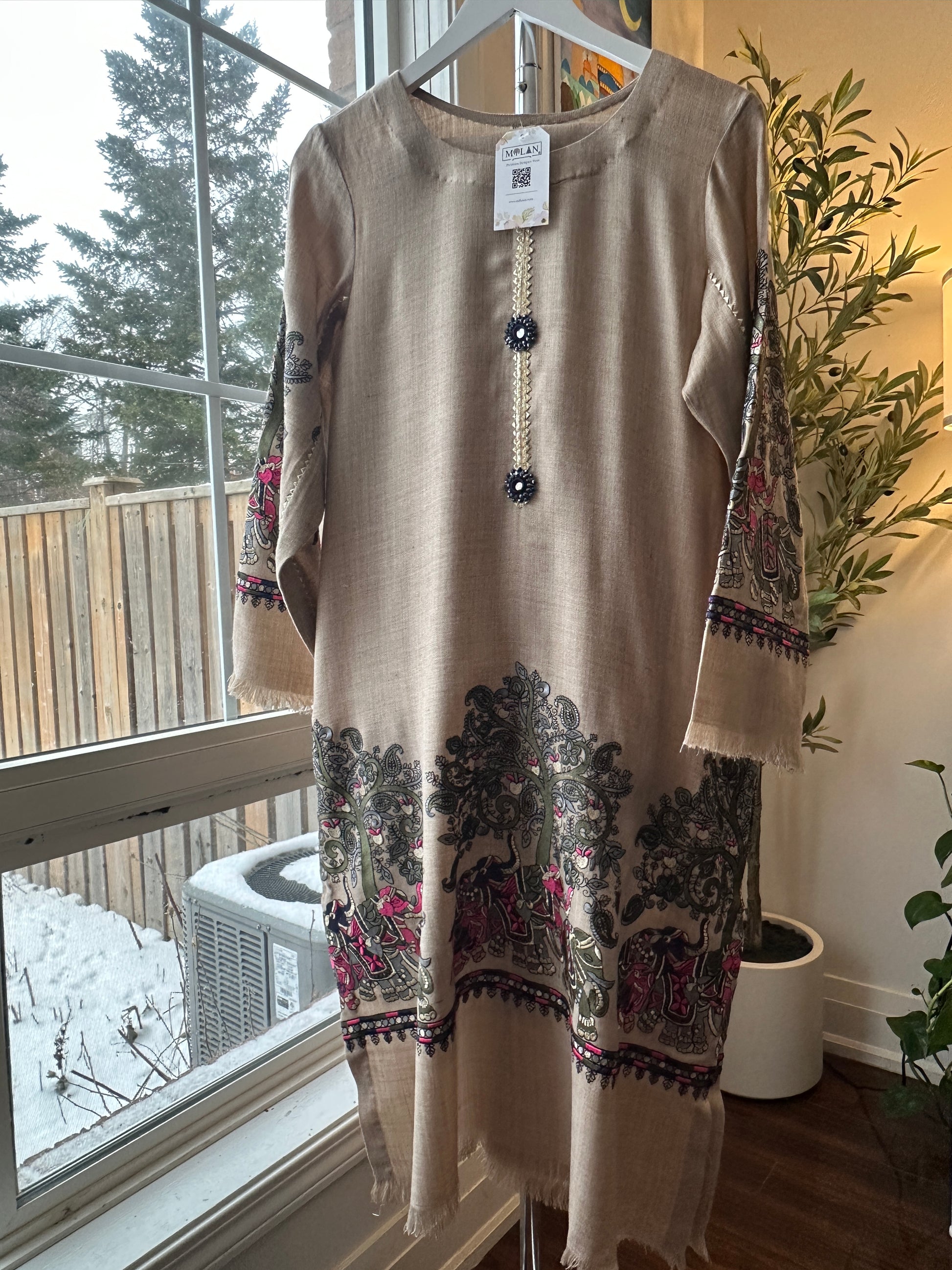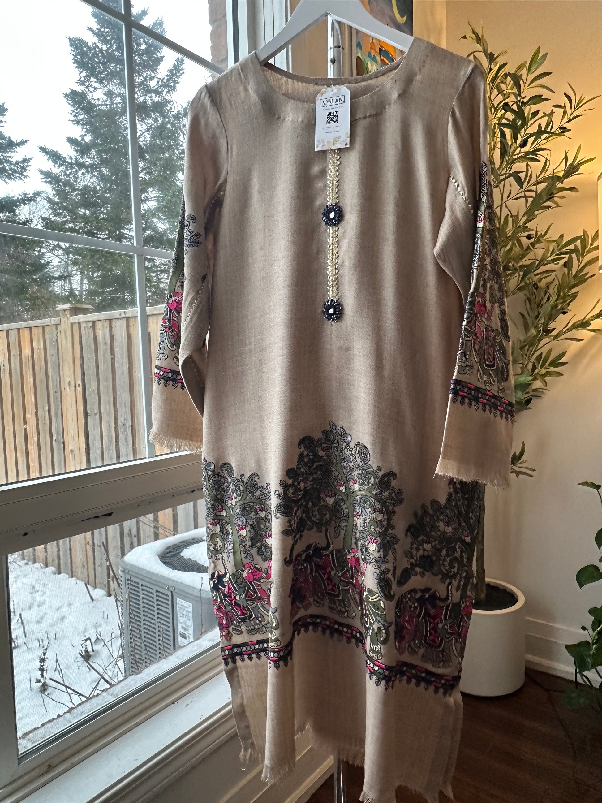 A two-piece ensemble crafted from luxurious Pashmina, Noor-e-Jungle belongs to the signature RaksayJungle series, inspired by the soulful artistry and storytelling traditions of Lahore. Set on a timeless beige base, this cord set features full embroidery on both front and back, illustrating a poetic jungle scene of dancing elephants and magical, flowing trees.