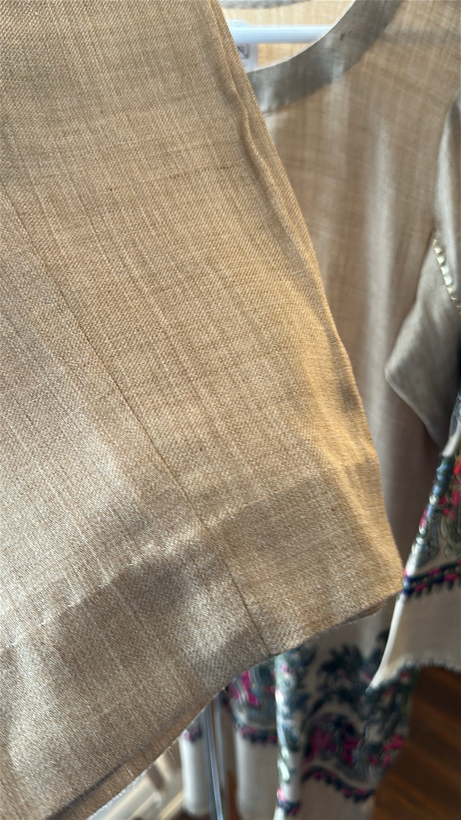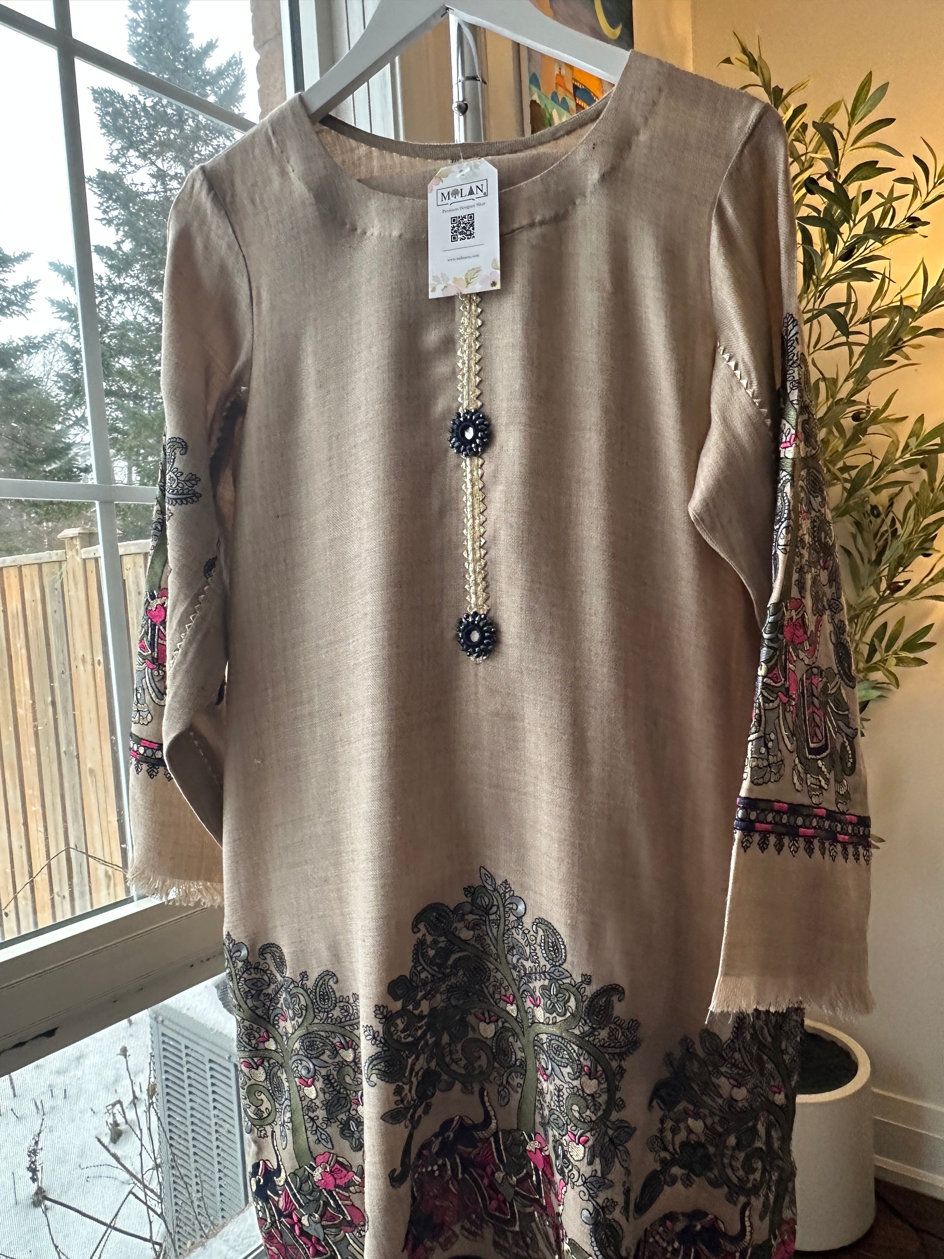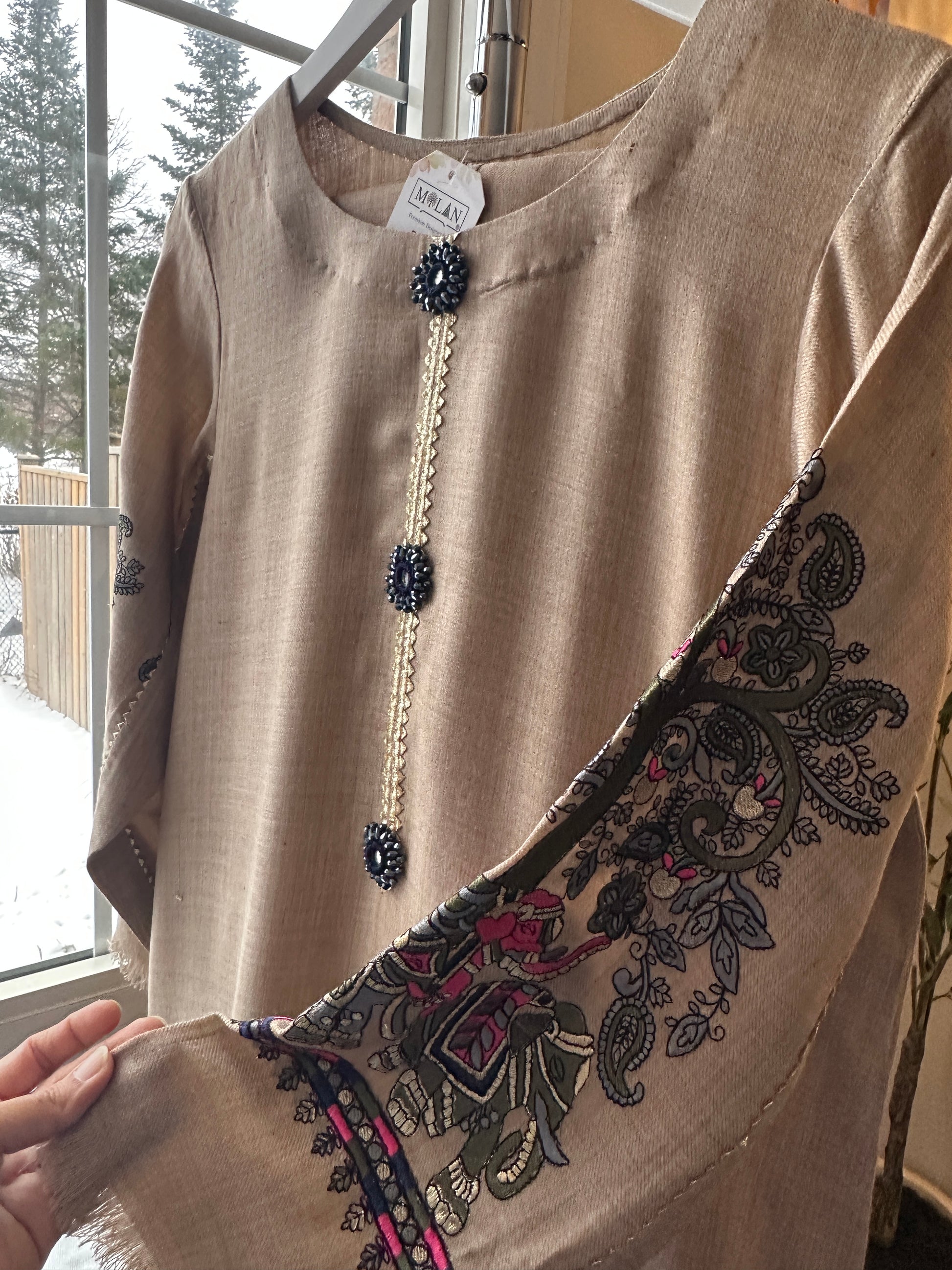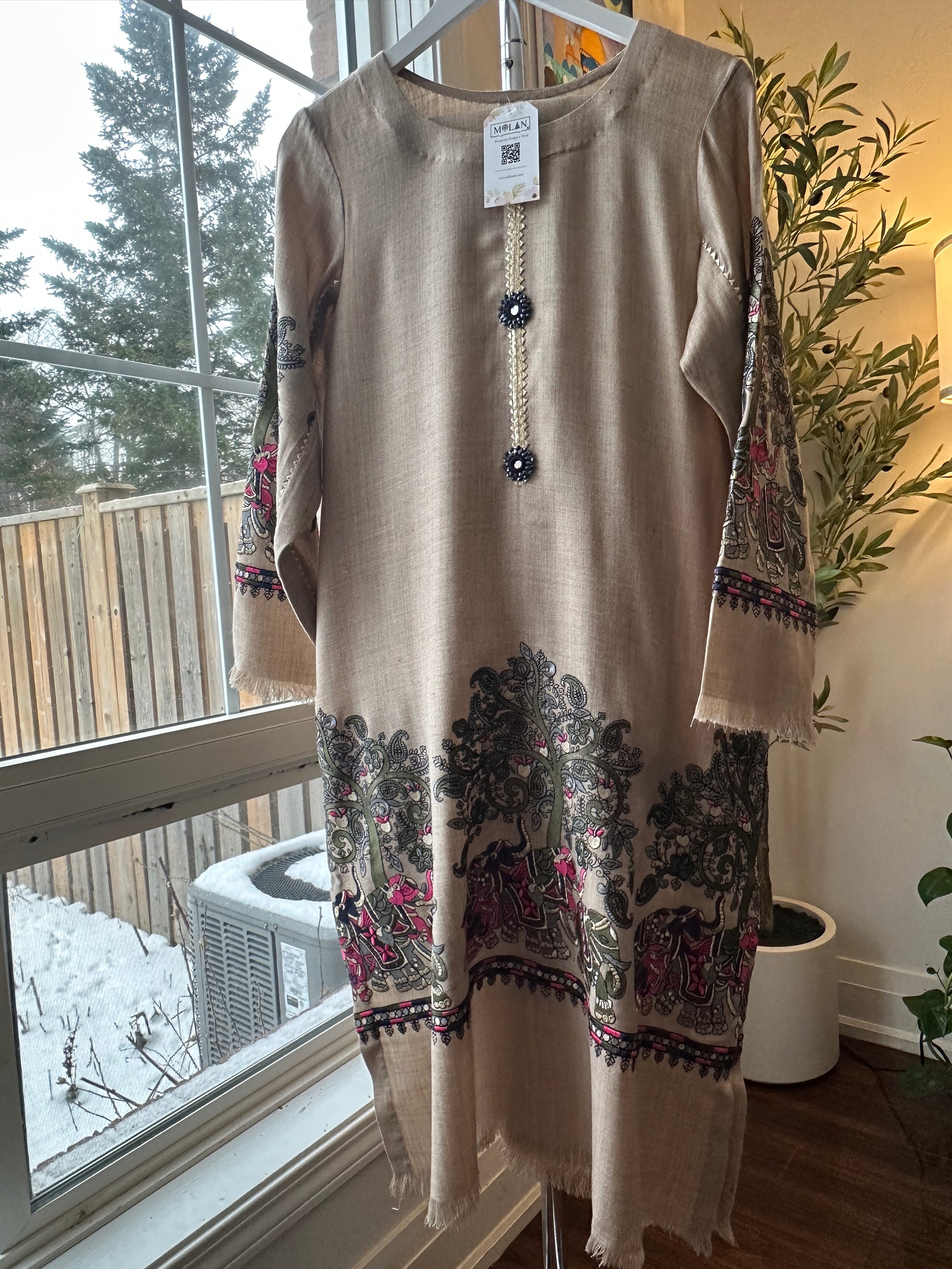 A two-piece ensemble crafted from luxurious Pashmina, Noor-e-Jungle belongs to the signature RaksayJungle series, inspired by the soulful artistry and storytelling traditions of Lahore. Set on a timeless beige base, this cord set features full embroidery on both front and back, illustrating a poetic jungle scene of dancing elephants and magical, flowing trees.