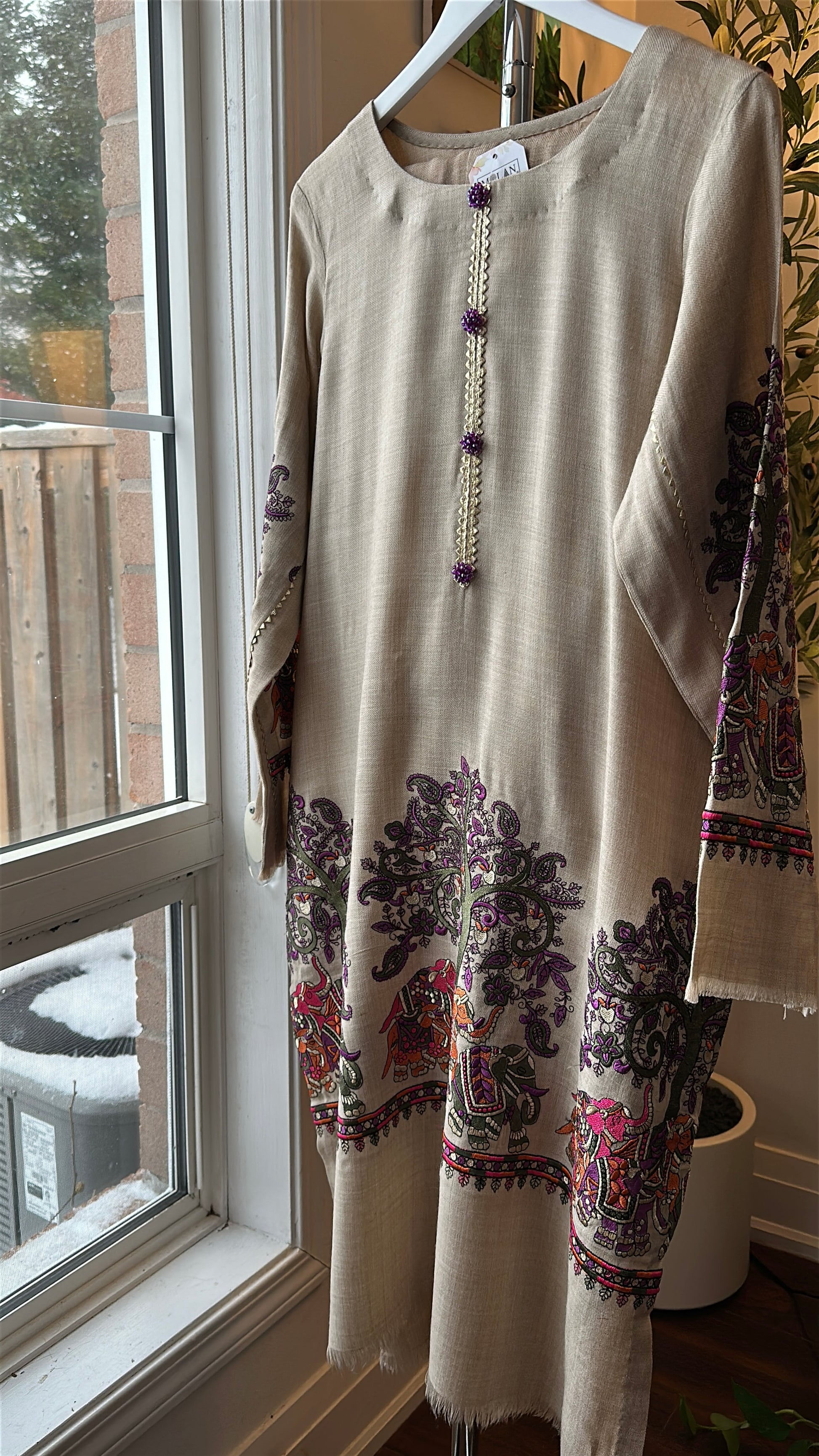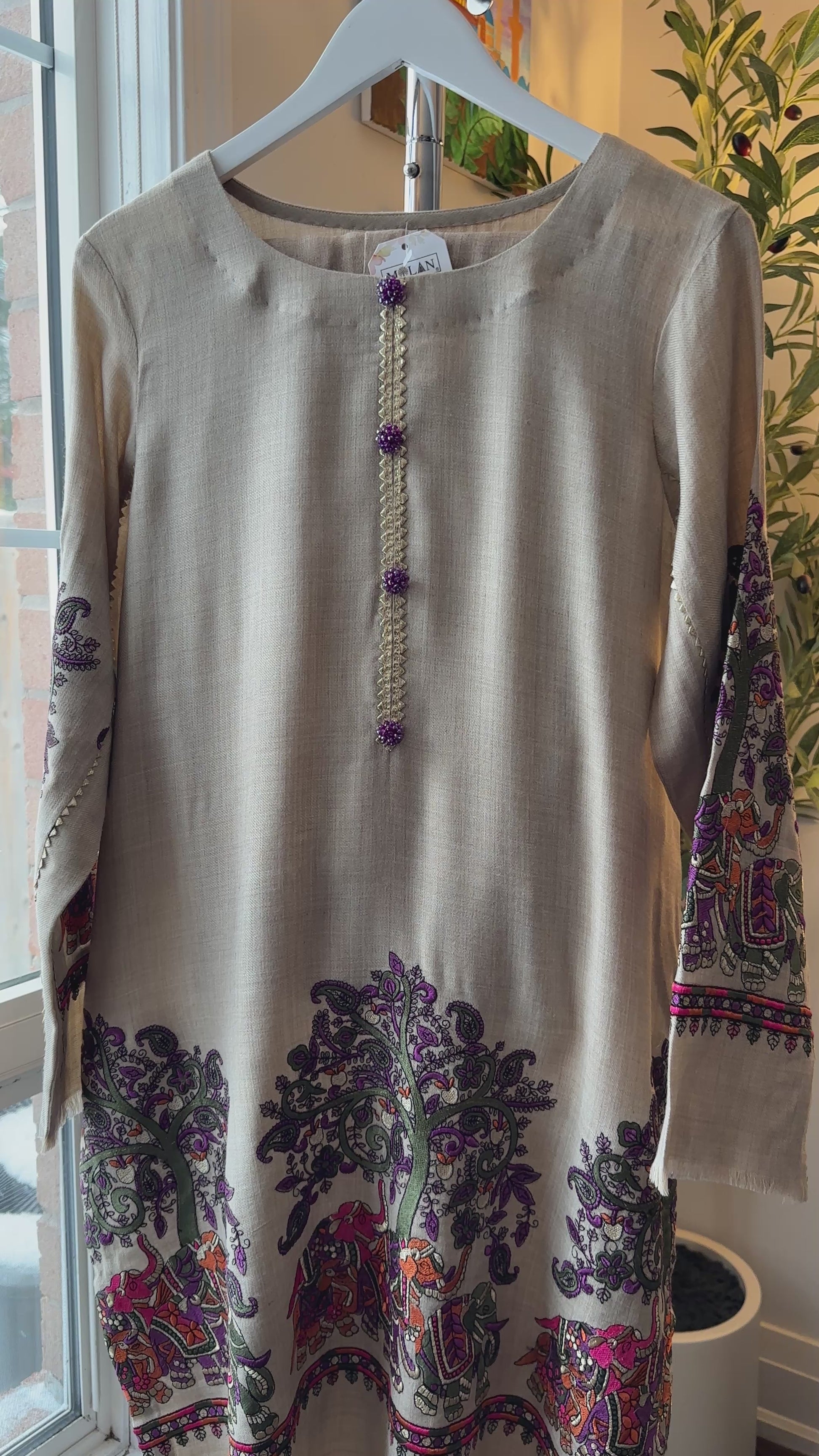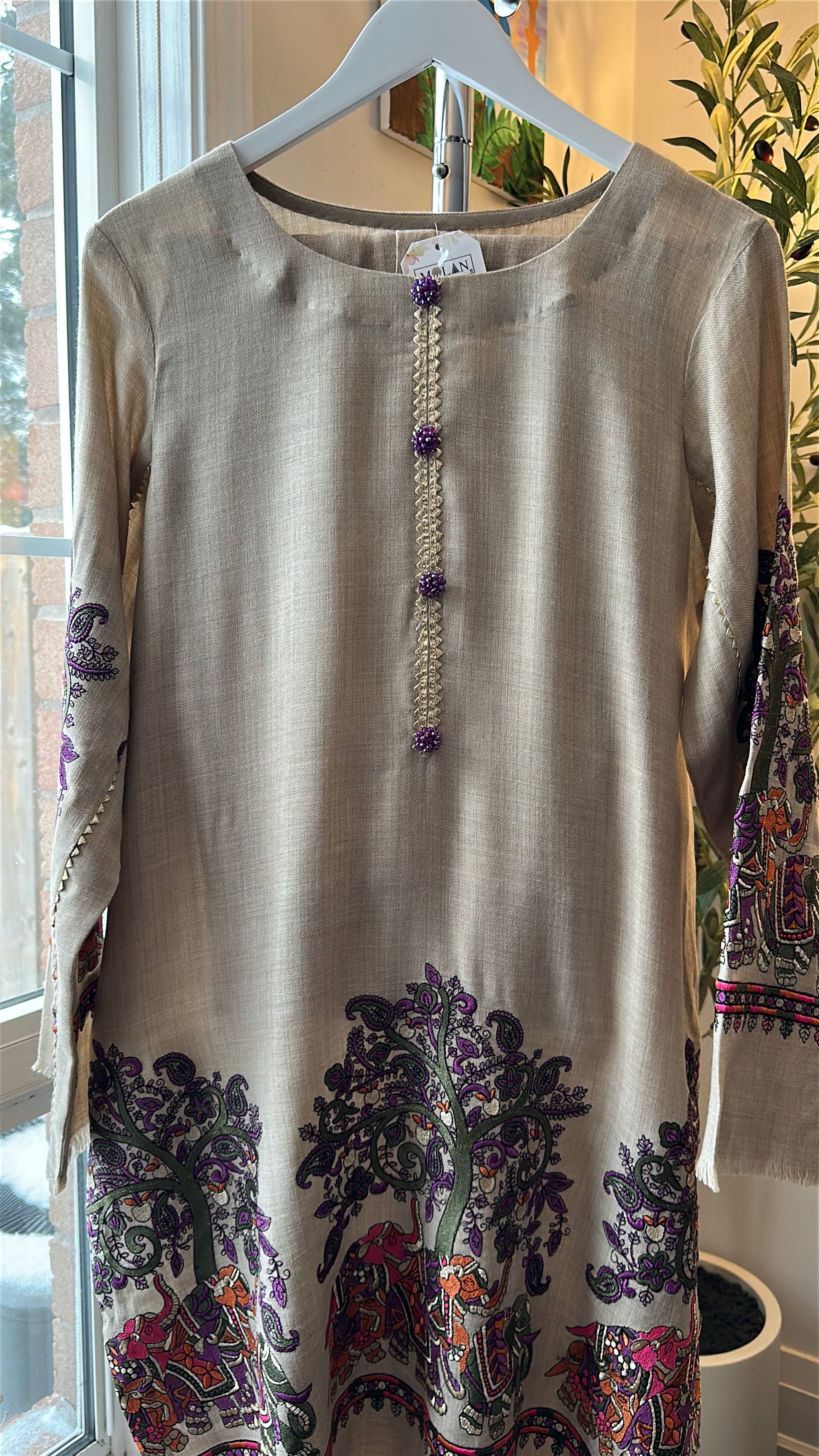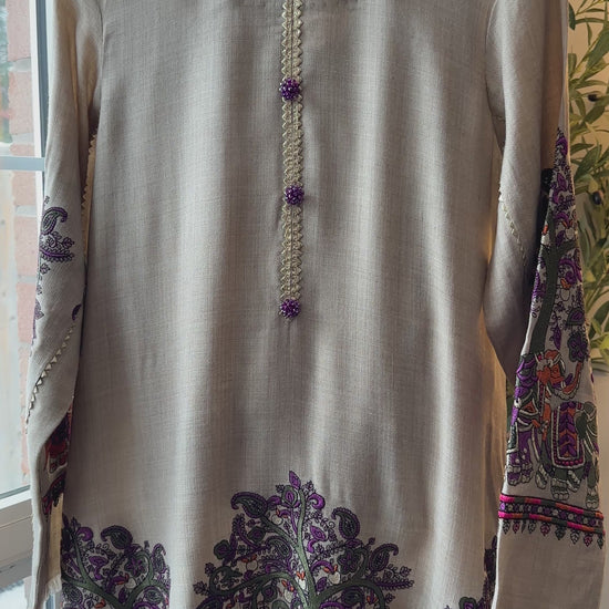 A two-piece ensemble crafted from soft, breathable textured fabric, Sandstone Whisper brings the poetry of nature into wearable art. Set on a warm sandstone-beige base, the long shirt is adorned with Kalamkari-inspired storytelling — majestic elephants, flowing jungle vibes, and intricate motifs in rich purples, greens, and earthy rust tones. The neckline is finished with delicate handcrafted loop detailing, accented with subtle purple embellishments that add a refined, regal touch. Paired with matching straight pants, this cord set balances heritage artistry with effortless everyday elegance.