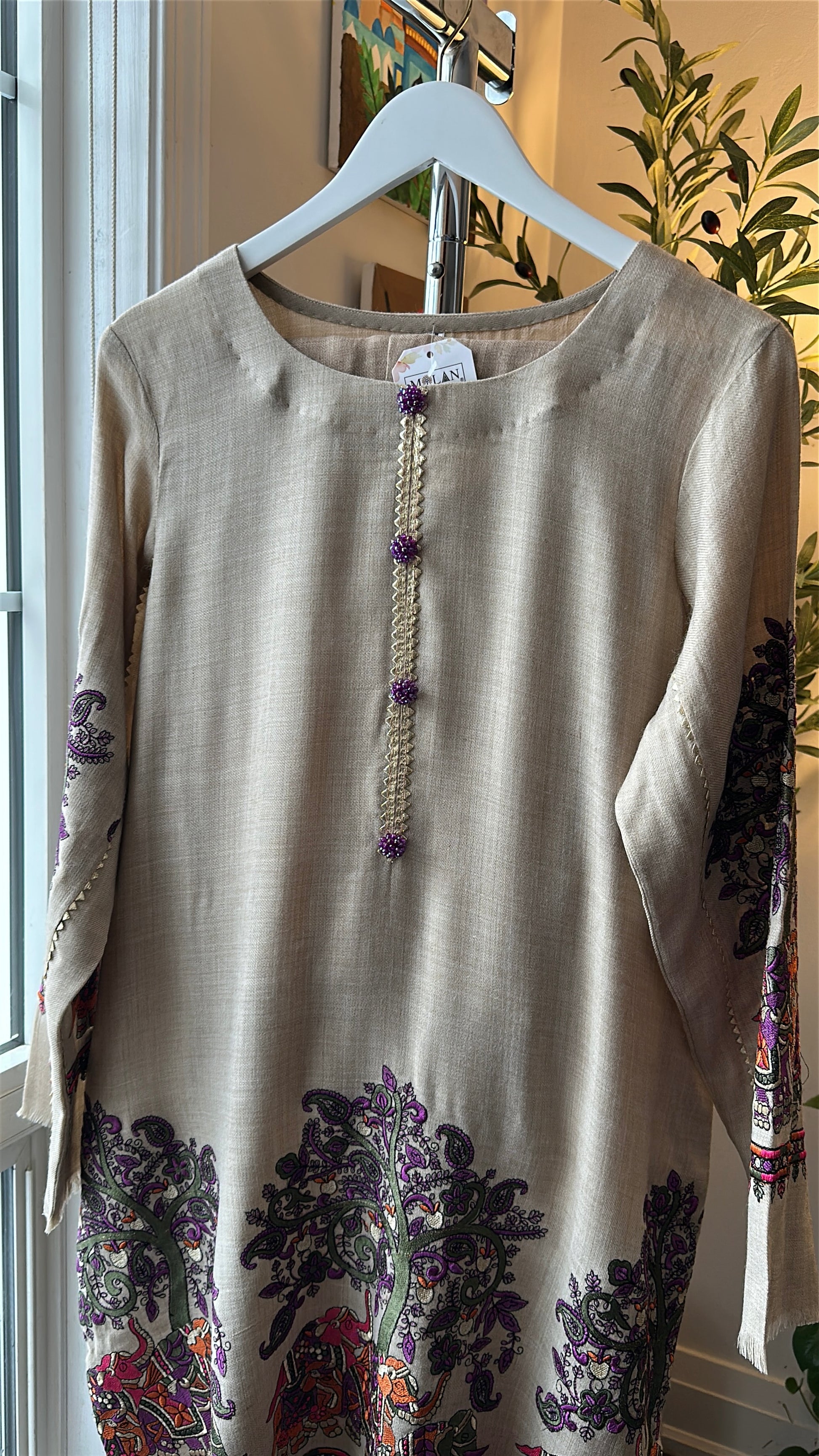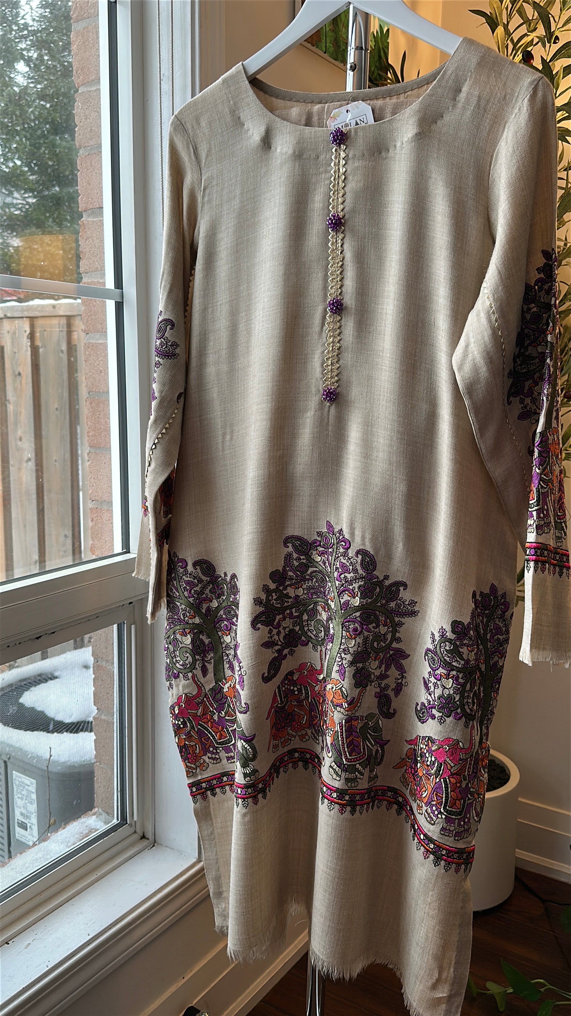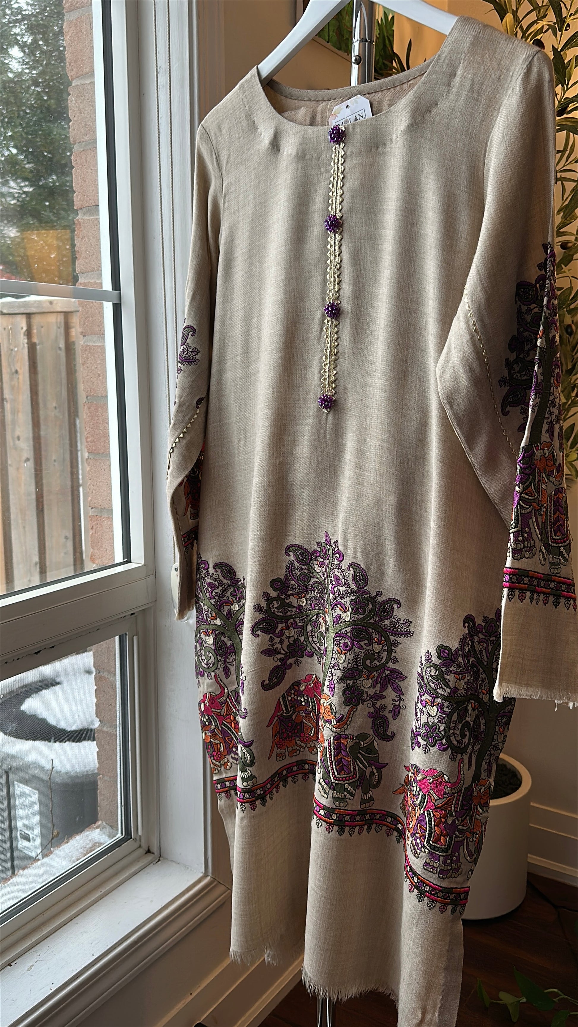 A two-piece ensemble crafted from soft, breathable textured fabric, Sandstone Whisper brings the poetry of nature into wearable art. Set on a warm sandstone-beige base, the long shirt is adorned with Kalamkari-inspired storytelling — majestic elephants, flowing jungle vibes, and intricate motifs in rich purples, greens, and earthy rust tones. The neckline is finished with delicate handcrafted loop detailing, accented with subtle purple embellishments that add a refined, regal touch. Paired with matching straight pants, this cord set balances heritage artistry with effortless everyday elegance.