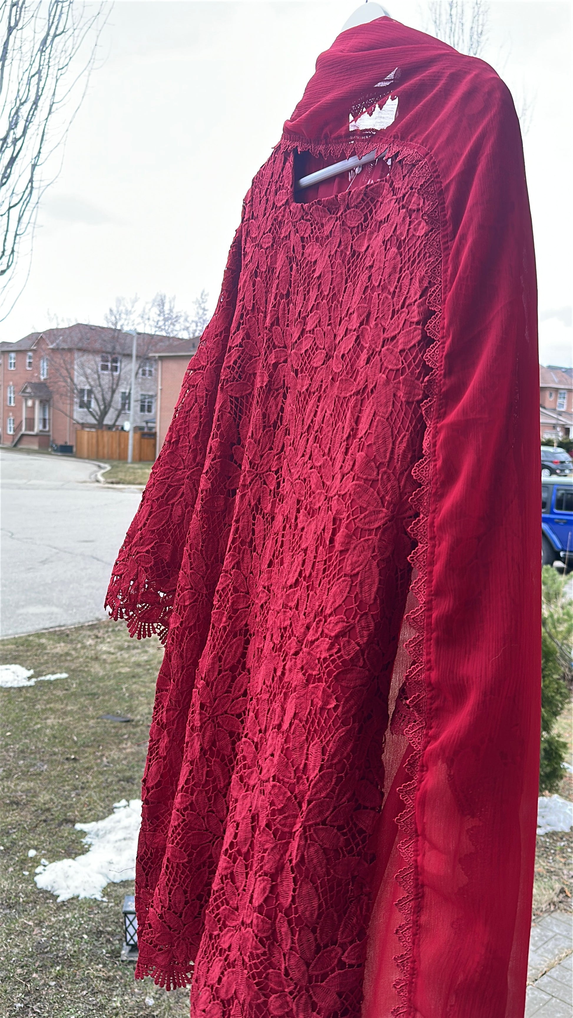 Paired with silk pants, the outfit maintains a graceful and structured silhouette that complements the intricate crochet design. Completing the look is a chiffon dupatta finished with crochet borders, adding softness and movement to the ensemble.