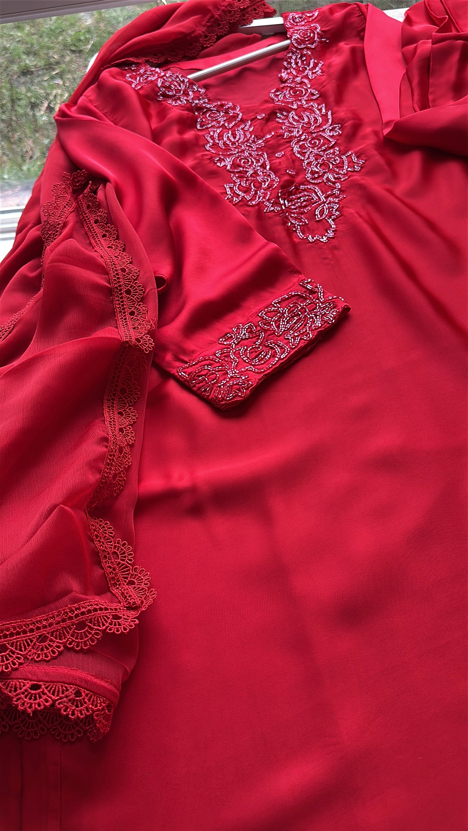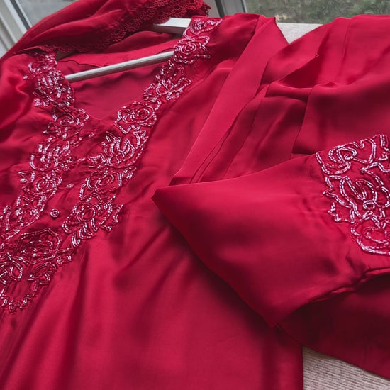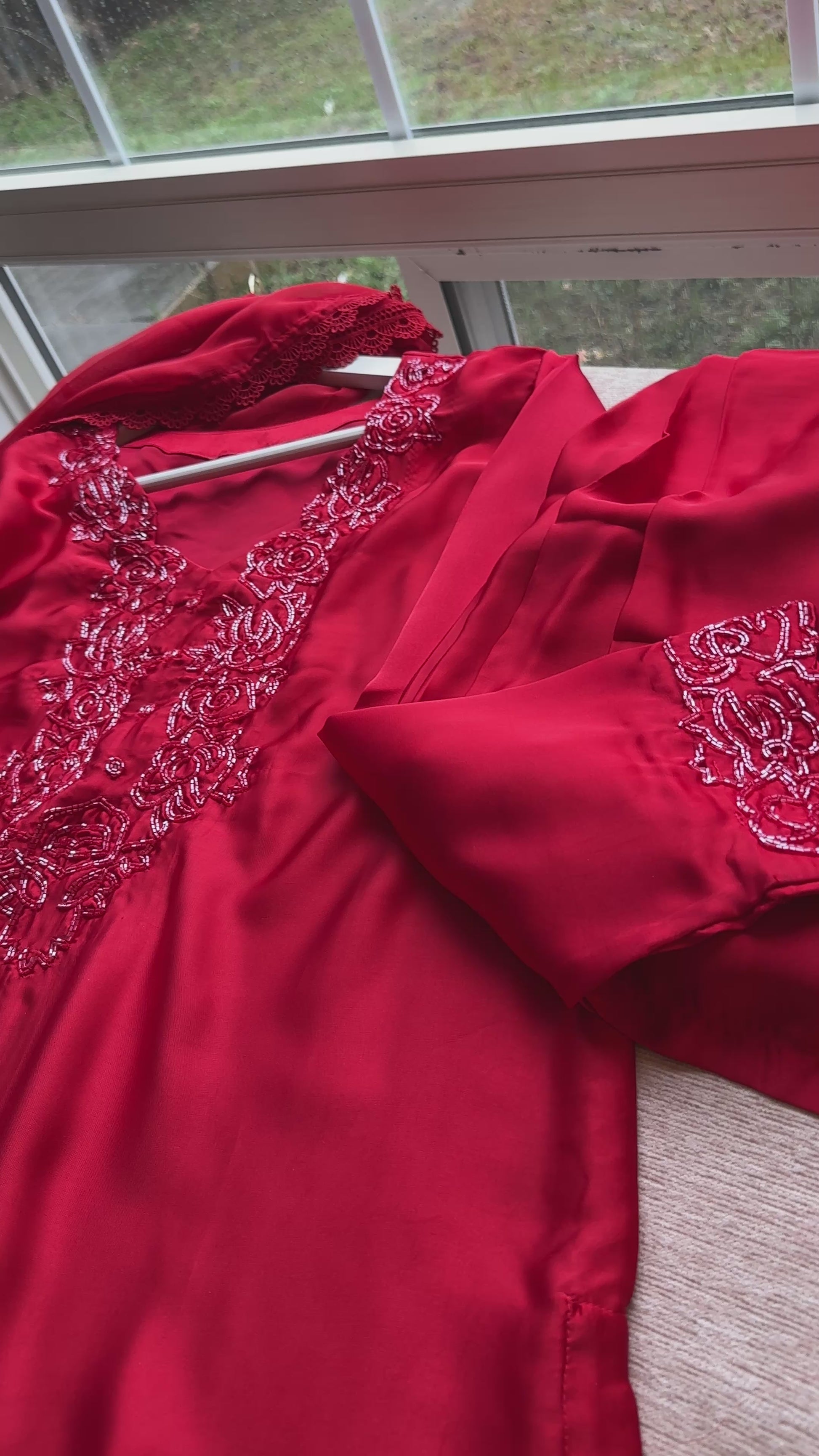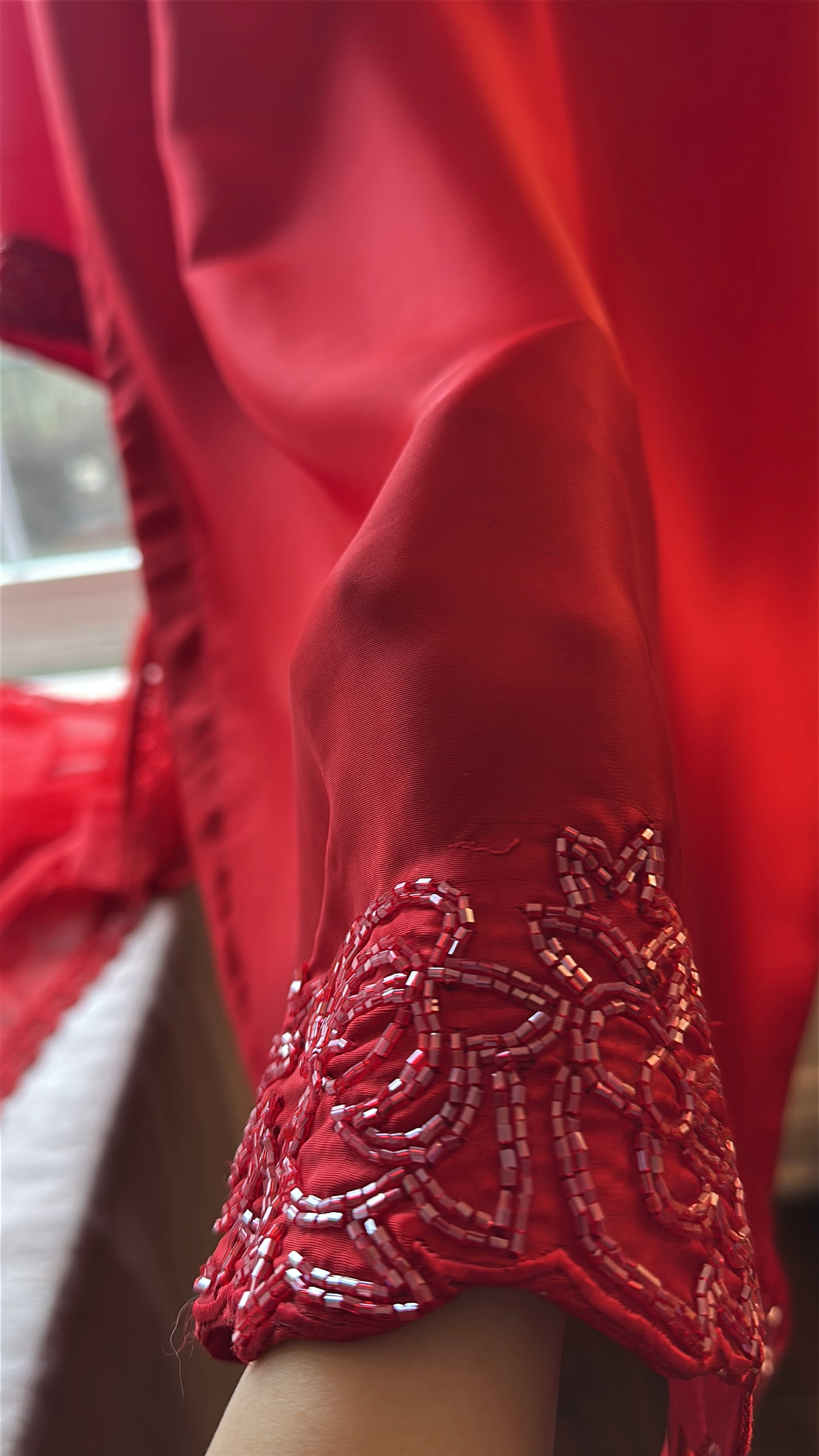 A 3-piece ensemble crafted from luxurious shimose silk, Scarlet Aura Élan captures the richness of deep scarlet tones with an effortlessly graceful presence. The shirt features intricate cut dana embroidery along the neckline, sleeves, and hem, adding a subtle shimmer that enhances the depth and beauty of the fabric. Paired with a soft, flowing chiffon dupatta, the ensemble feels elegant, fluid, and striking — perfect for moments that call for quiet confidence.