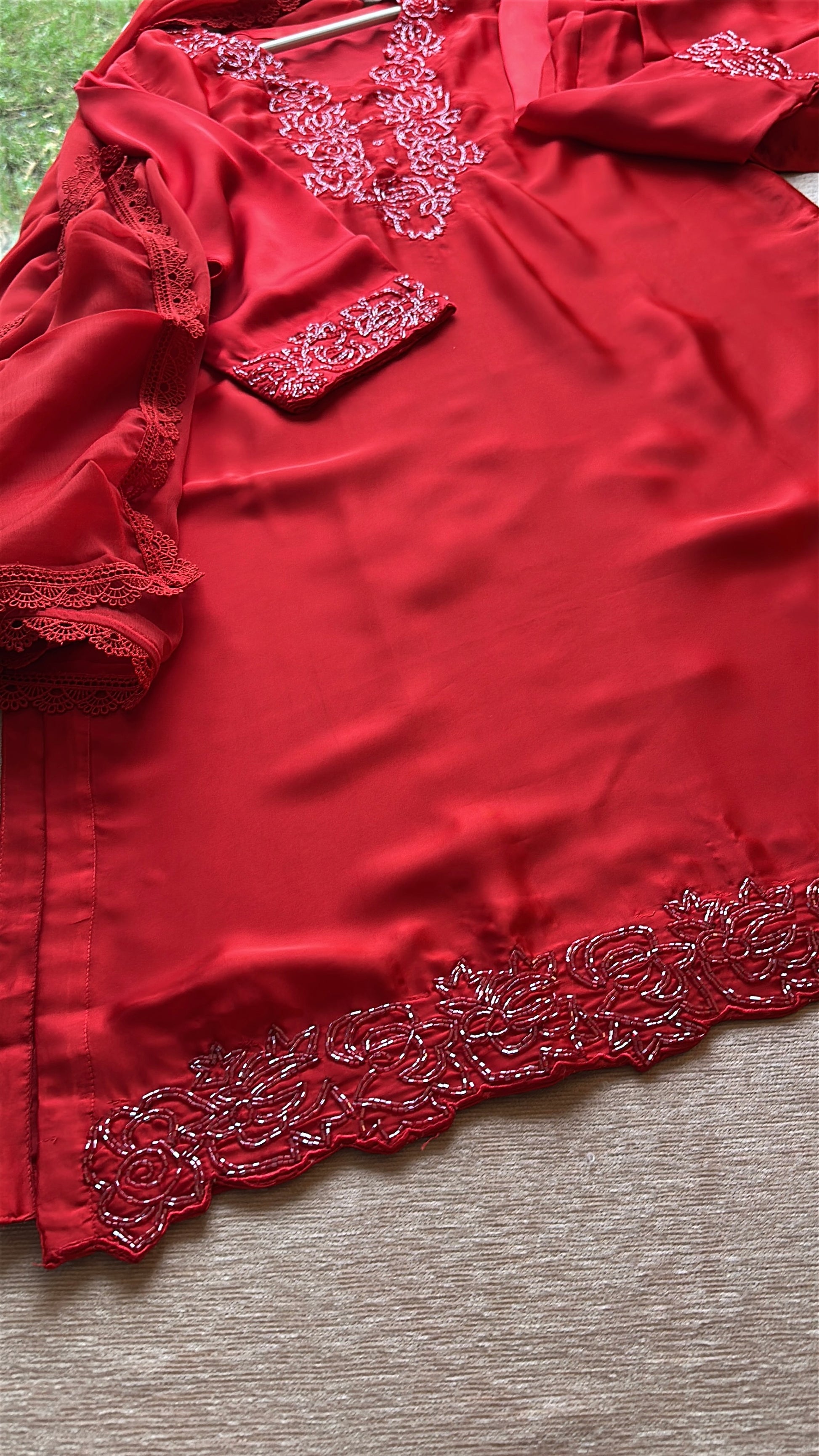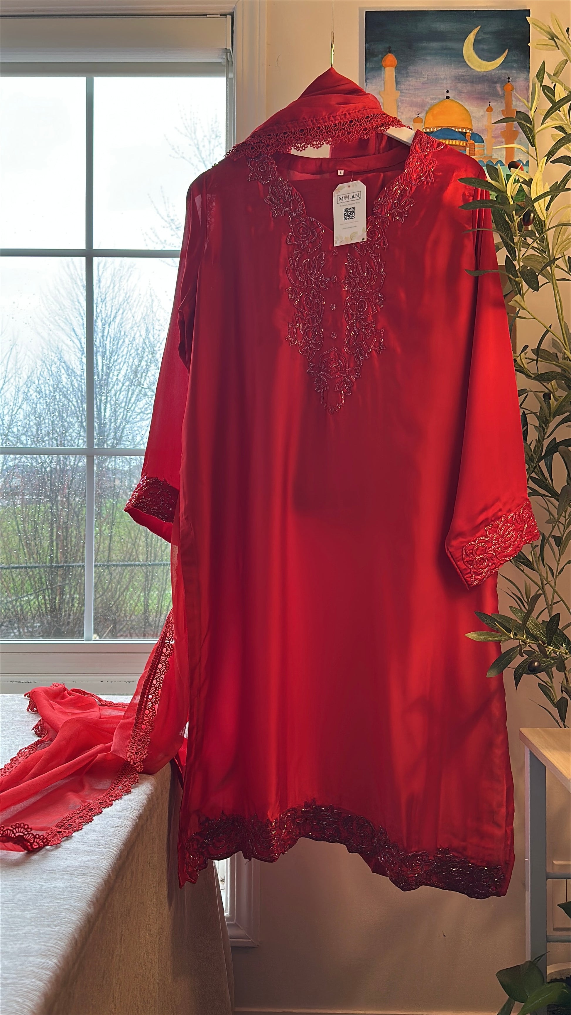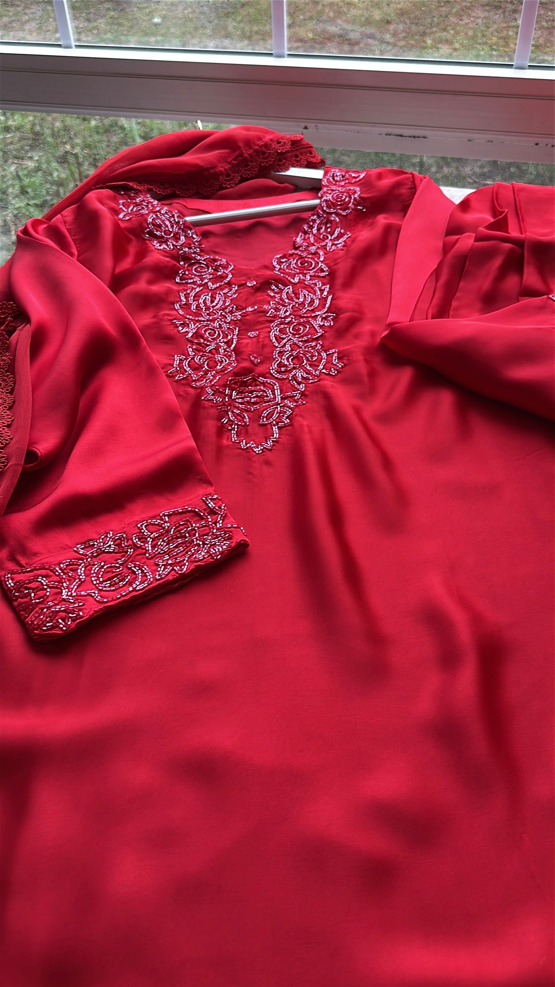 A 3-piece ensemble crafted from luxurious shimose silk, Scarlet Aura Élan captures the richness of deep scarlet tones with an effortlessly graceful presence. The shirt features intricate cut dana embroidery along the neckline, sleeves, and hem, adding a subtle shimmer that enhances the depth and beauty of the fabric. Paired with a soft, flowing chiffon dupatta, the ensemble feels elegant, fluid, and striking — perfect for moments that call for quiet confidence.