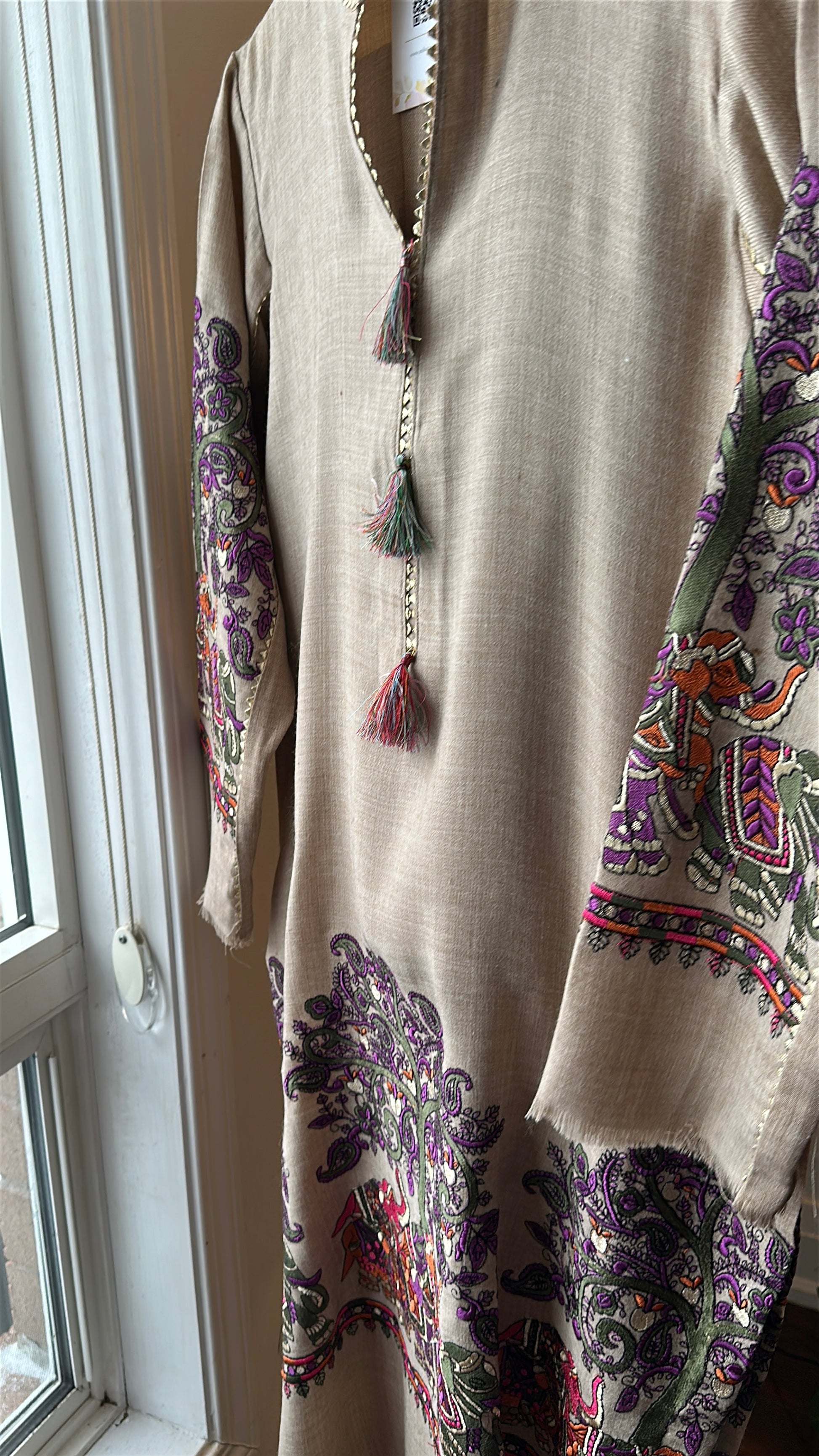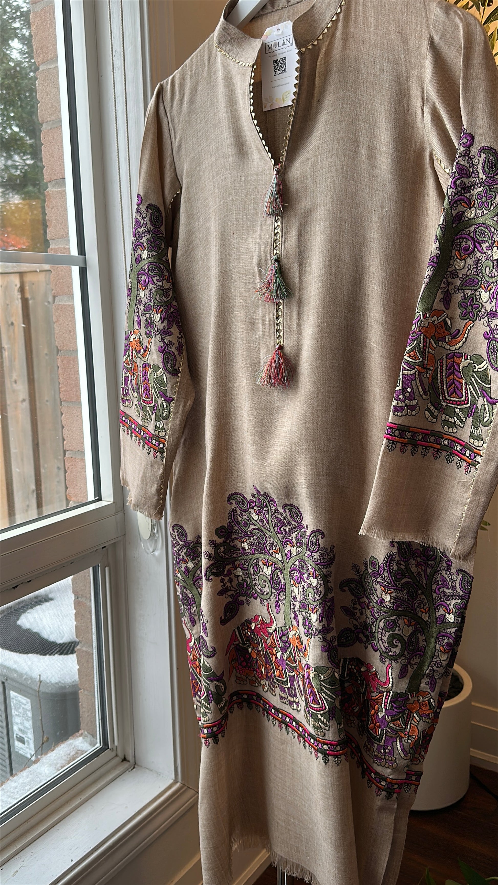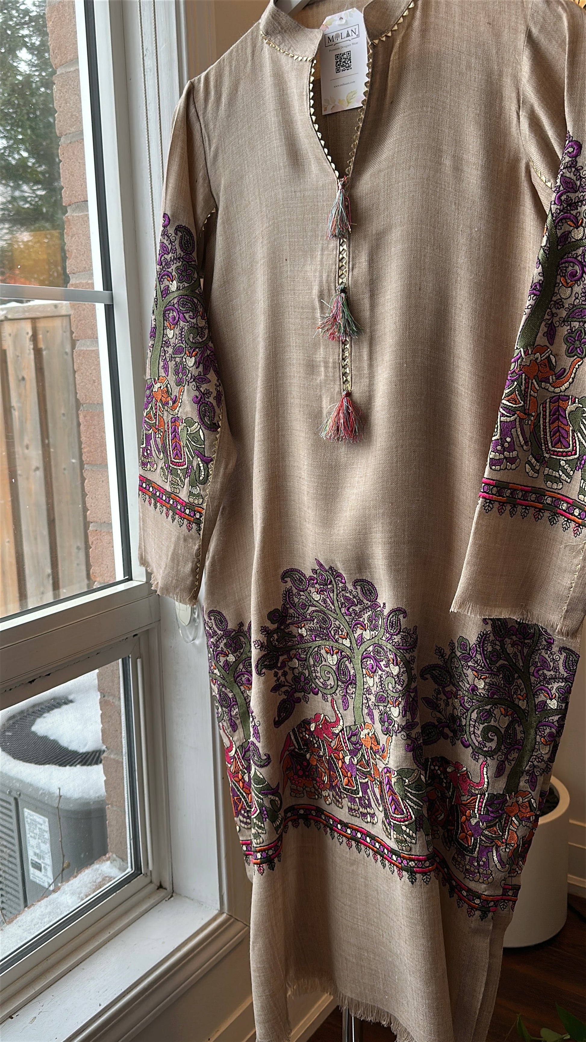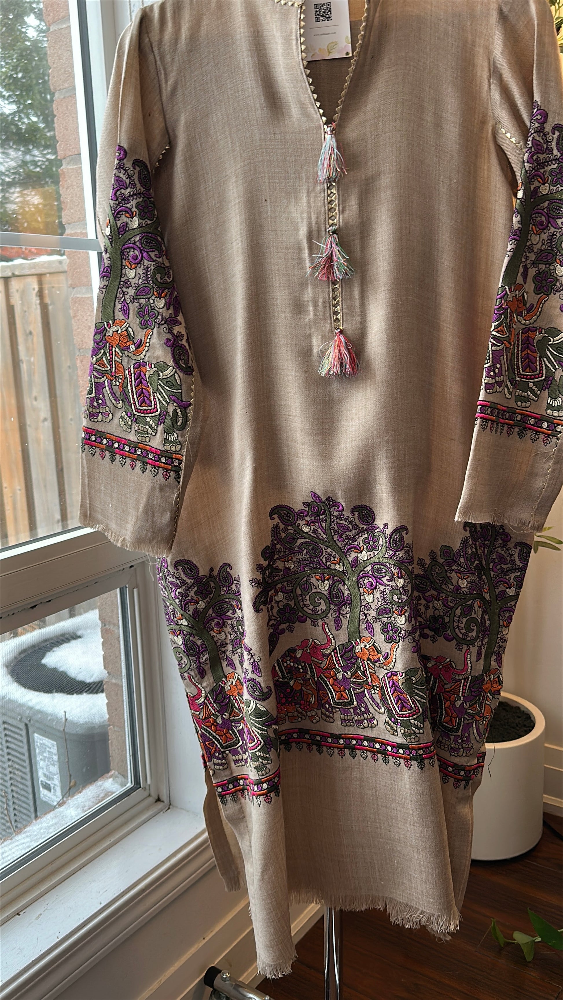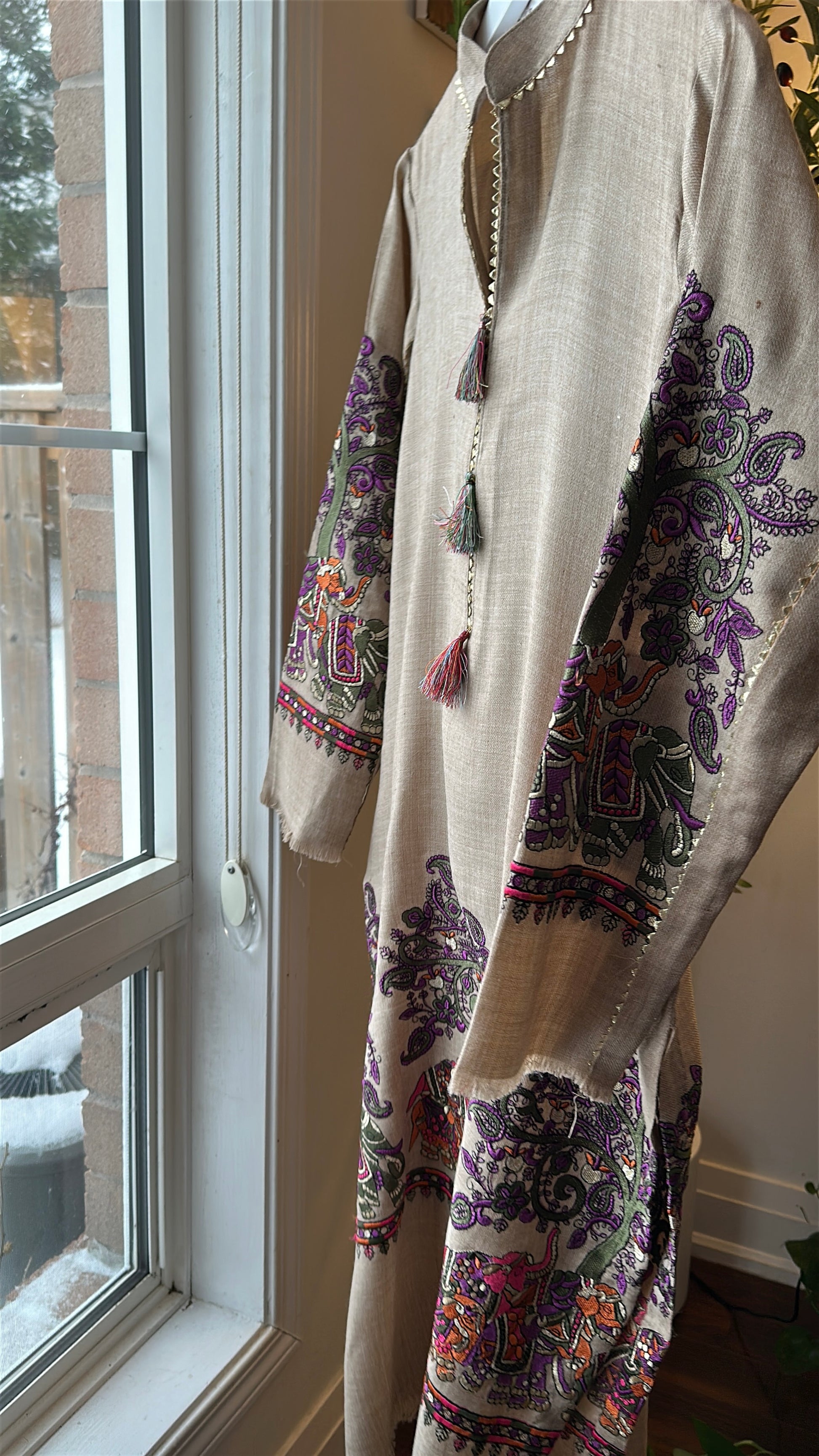 A statement two-piece cord set crafted from luxurious Pashmina, Raat-e-Banafsh is part of the signature Raqs-e-Jungle series, inspired by the poetic storytelling and heritage craftsmanship of Lahore. Set on a timeless beige base, this design features full embroidery on the front and back, showcasing dancing elephants and magical, flowing jungle treesrendered in rich banafsh (plum), olive, and jewel-toned accents.