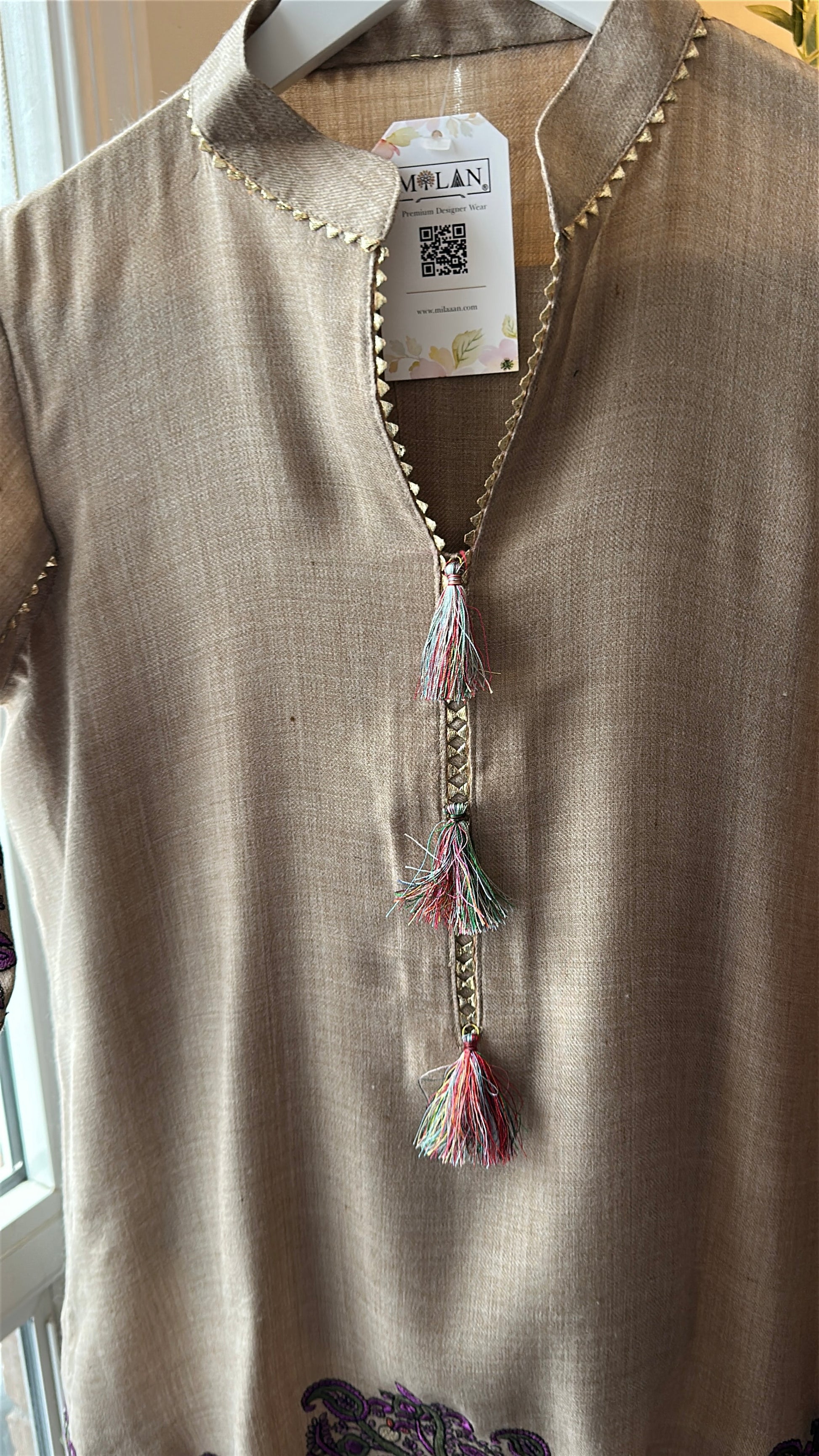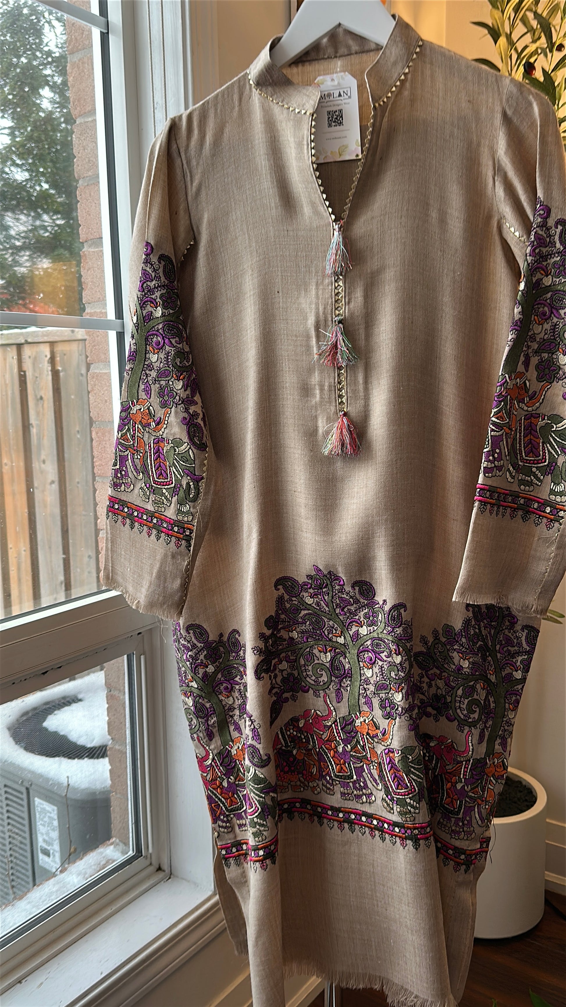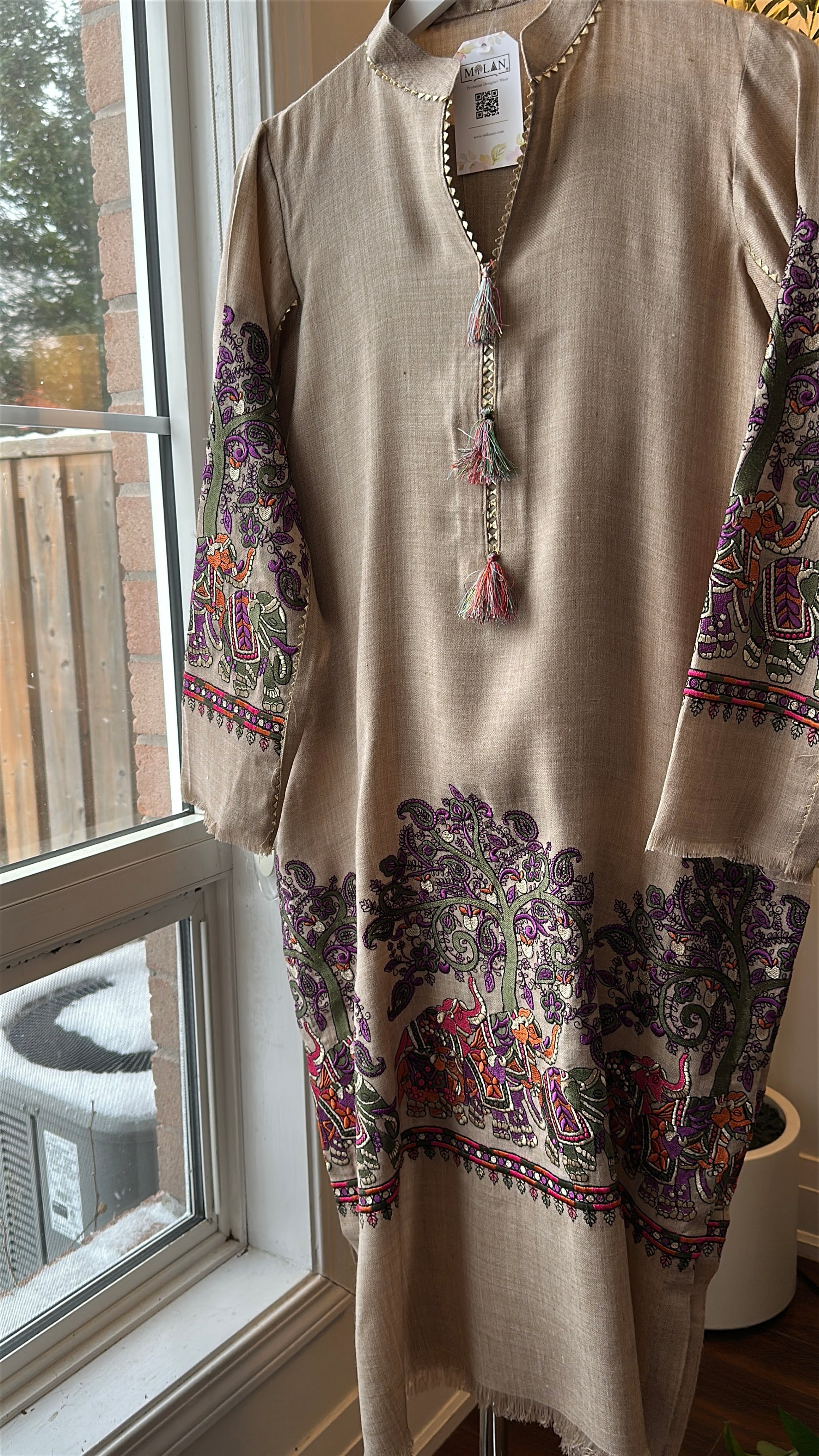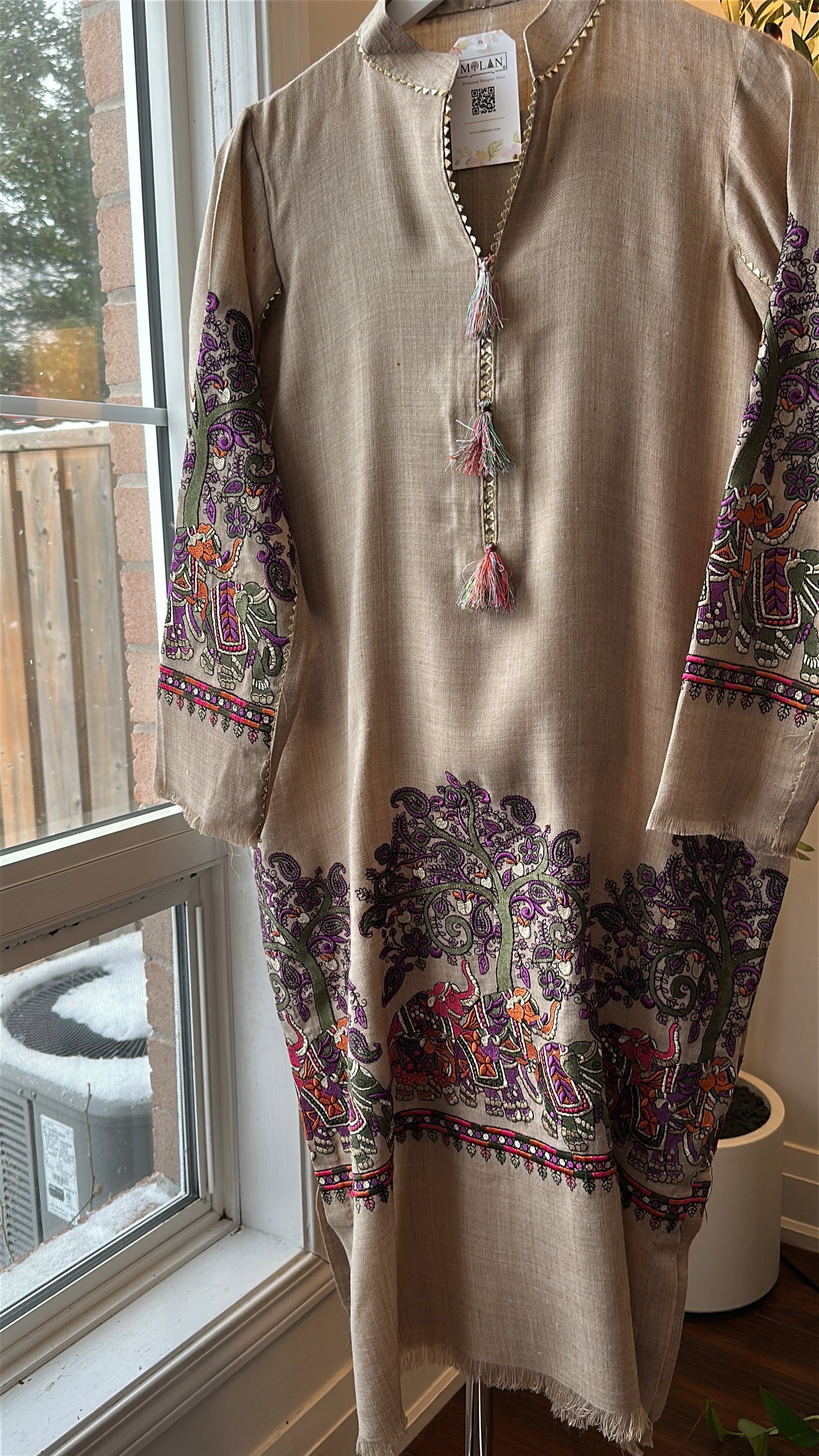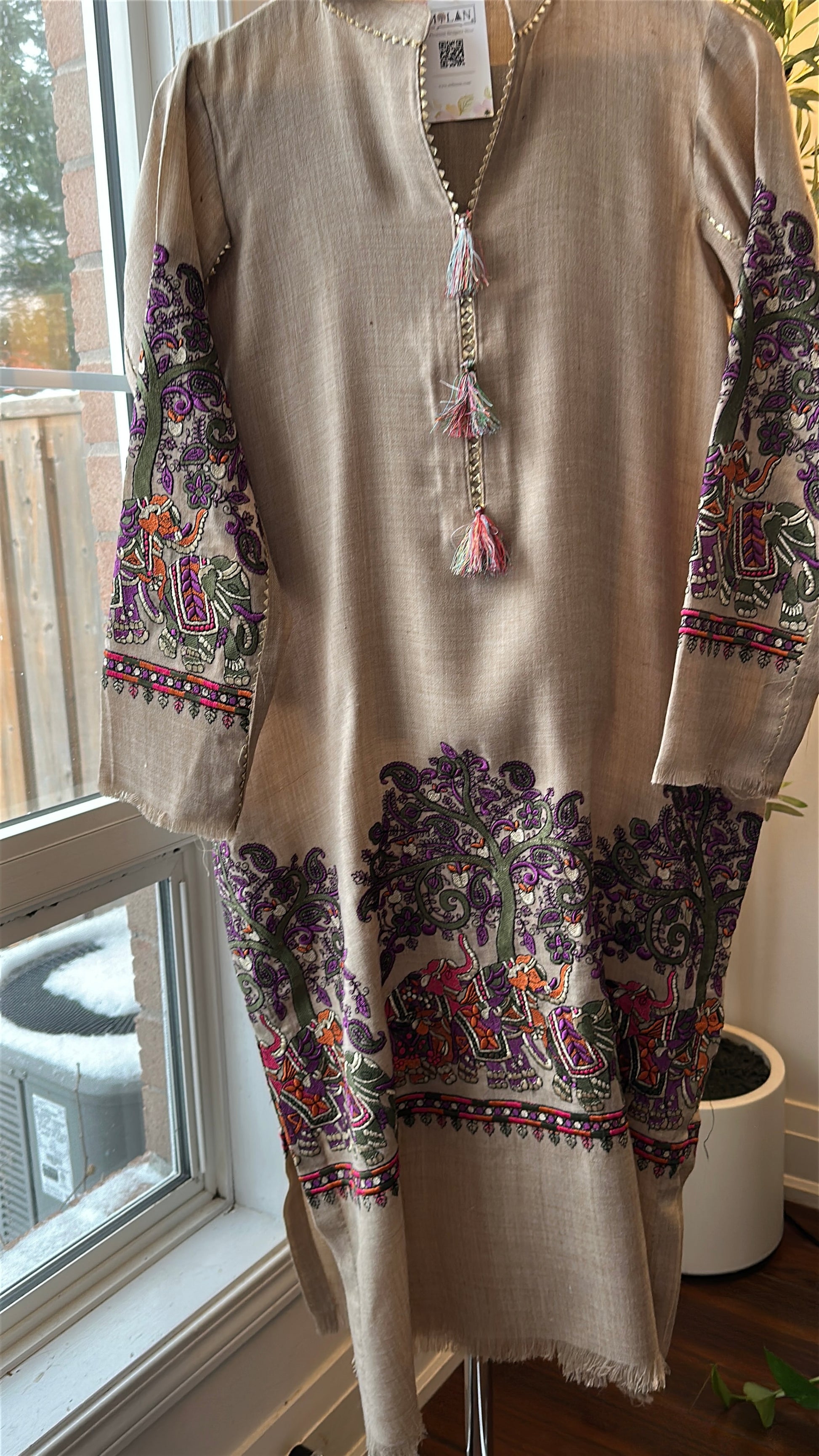A statement two-piece cord set crafted from luxurious Pashmina, Raat-e-Banafsh is part of the signature Raqs-e-Jungle series, inspired by the poetic storytelling and heritage craftsmanship of Lahore. Set on a timeless beige base, this design features full embroidery on the front and back, showcasing dancing elephants and magical, flowing jungle treesrendered in rich banafsh (plum), olive, and jewel-toned accents.