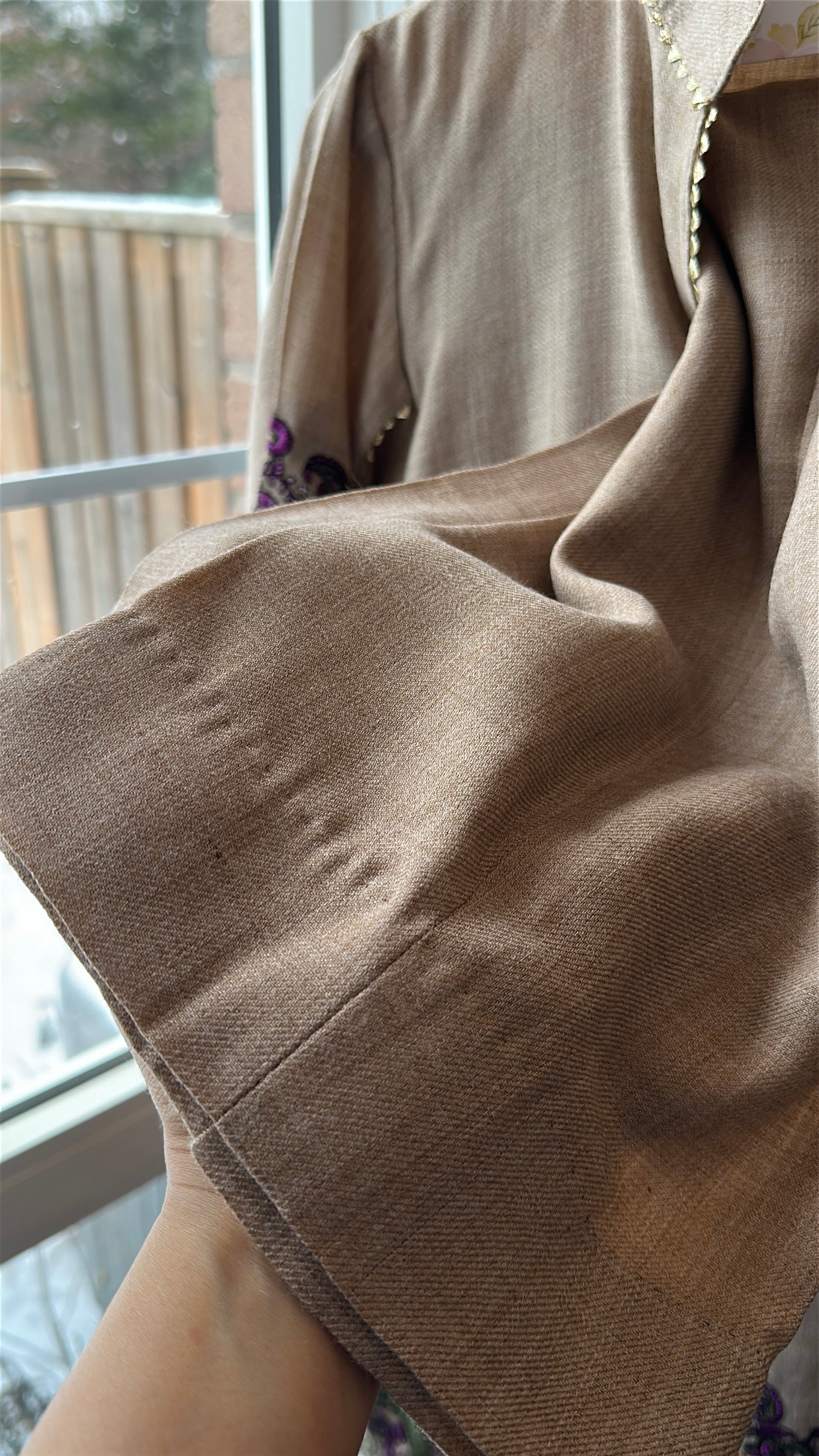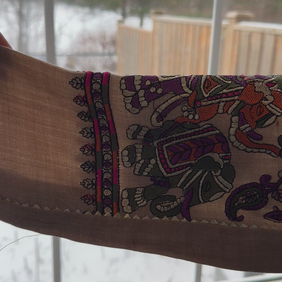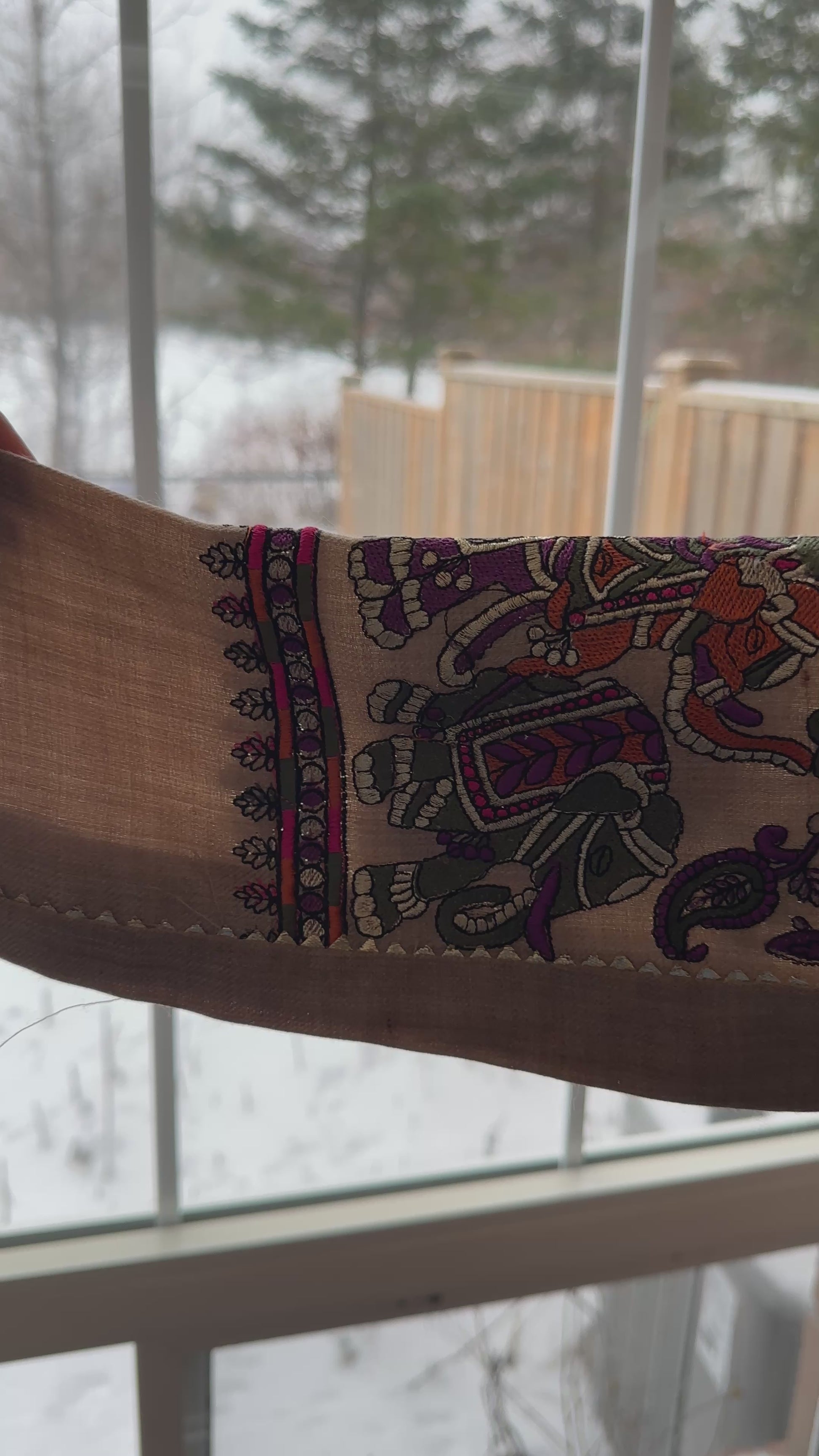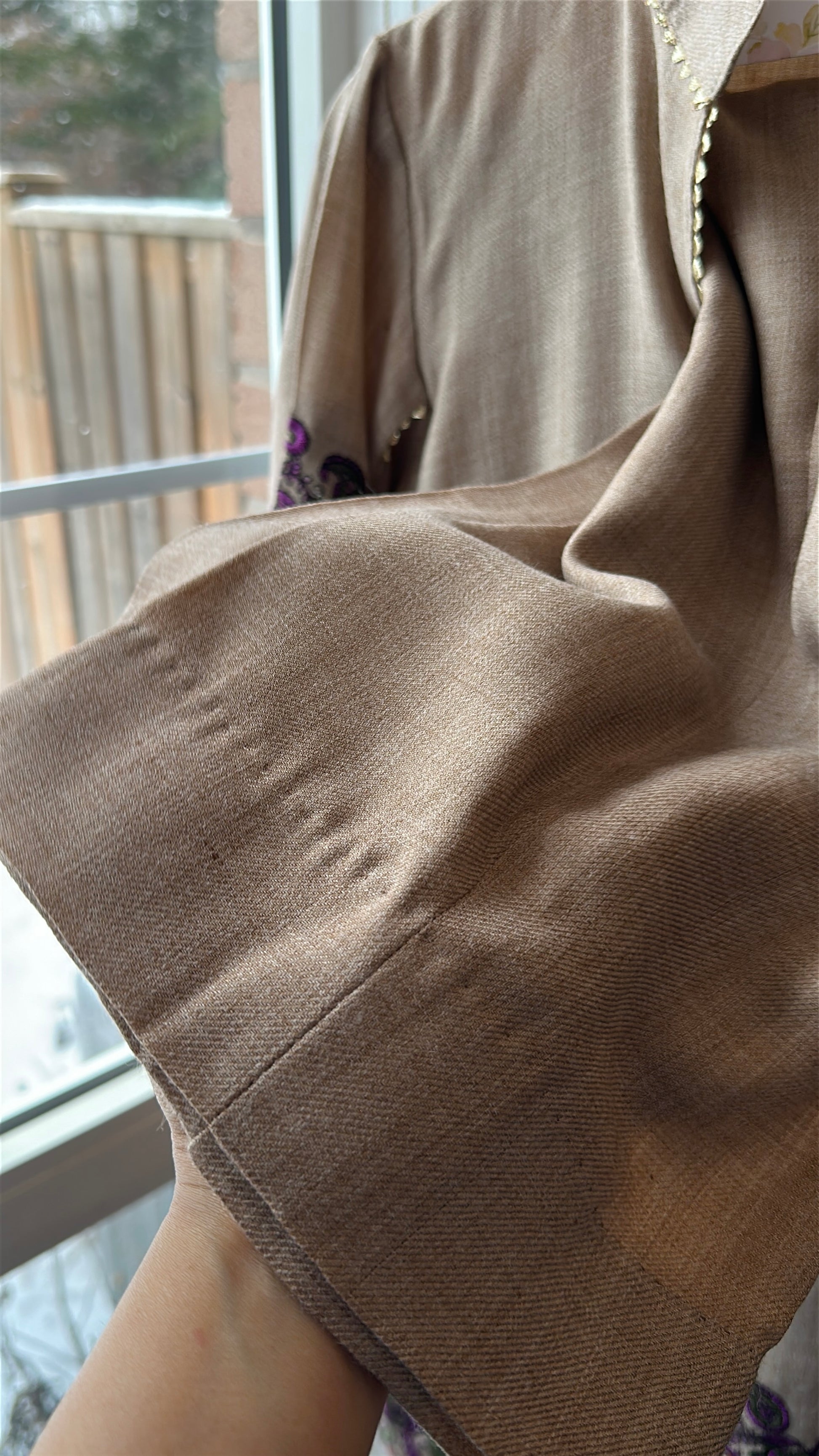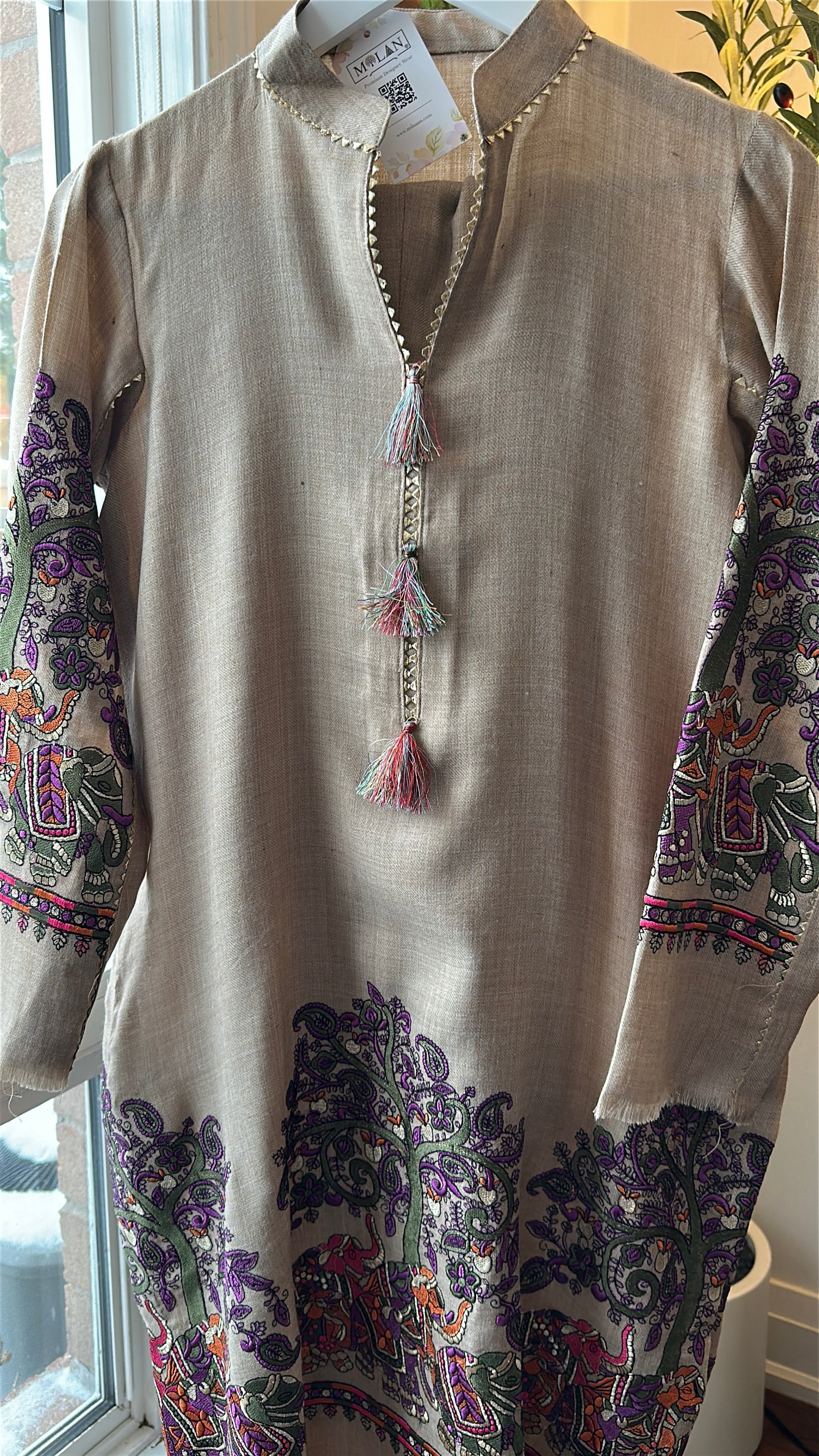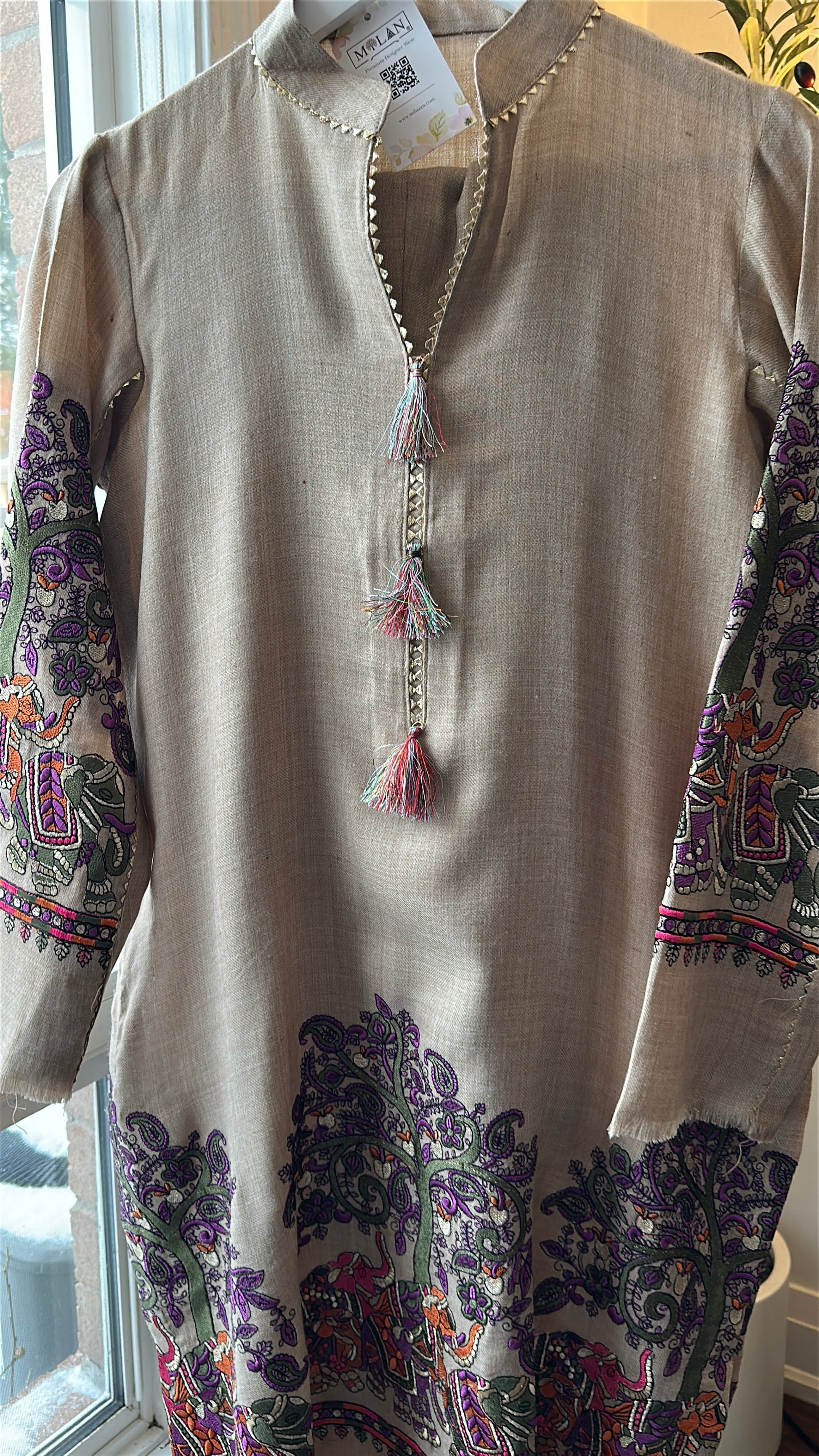 A statement two-piece cord set crafted from luxurious Pashmina, Raat-e-Banafsh is part of the signature Raqs-e-Jungle series, inspired by the poetic storytelling and heritage craftsmanship of Lahore. Set on a timeless beige base, this design features full embroidery on the front and back, showcasing dancing elephants and magical, flowing jungle treesrendered in rich banafsh (plum), olive, and jewel-toned accents.