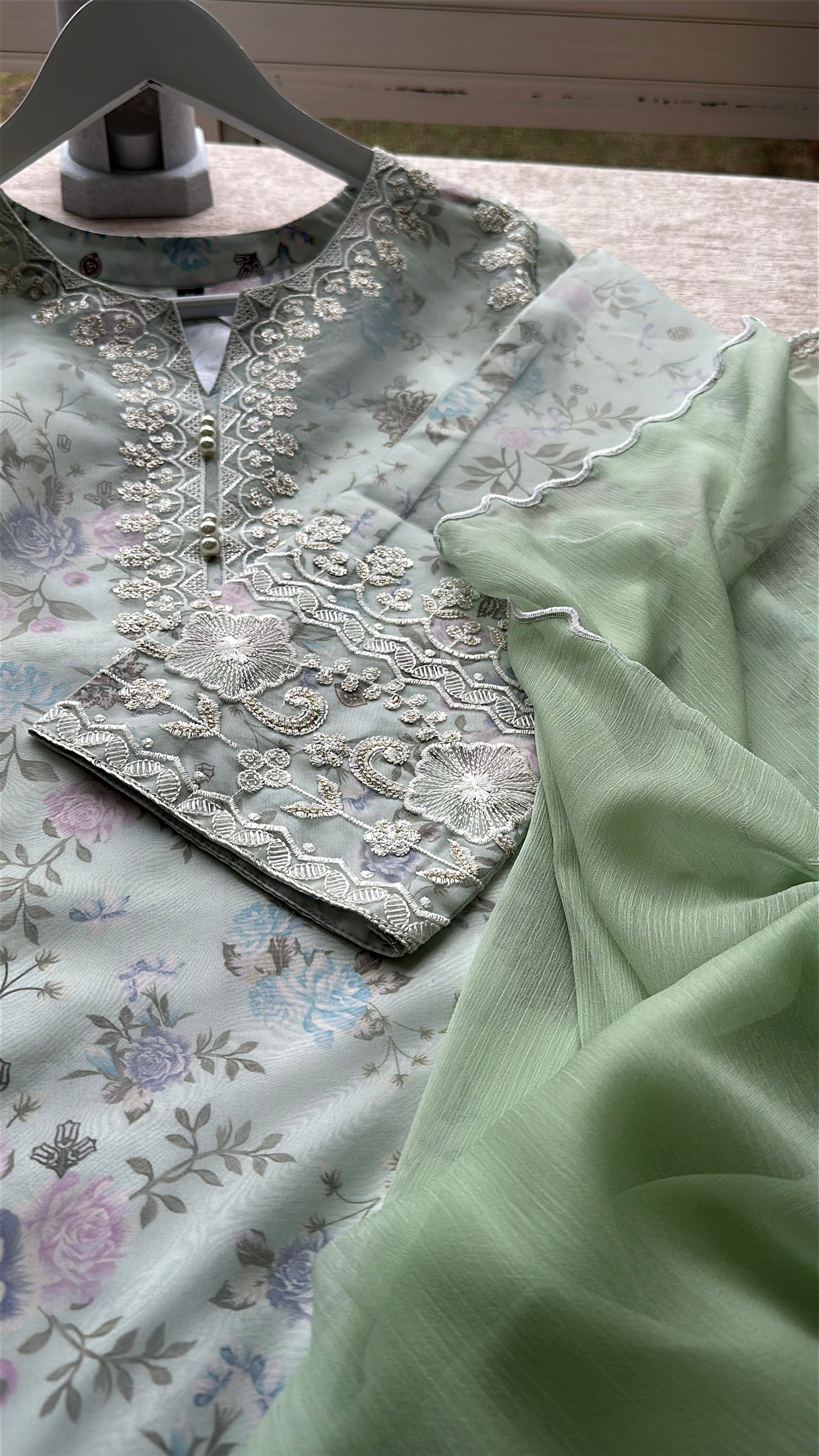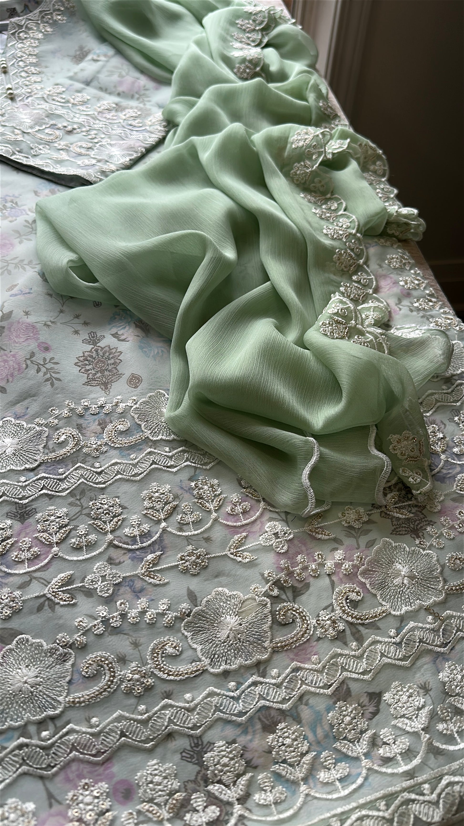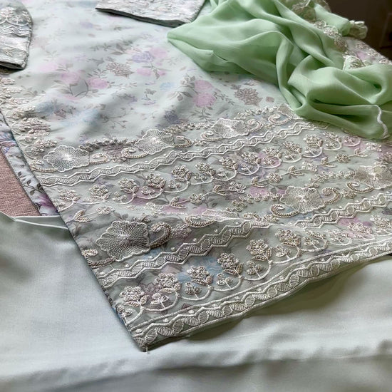 A 3-piece ensemble crafted from delicate organza layered over silk floral fabric, Mint Blossom merges romantic garden florals with refined craftsmanship. The shirt features intricate embroidery with sequins (sitara) work and a heavily hand-embellished neckline, paired with silk straight pants and a chiffon dupatta finished with scalloped embroidered edges. The soft mint floral base feels fresh, graceful, and effortlessly elegant.
