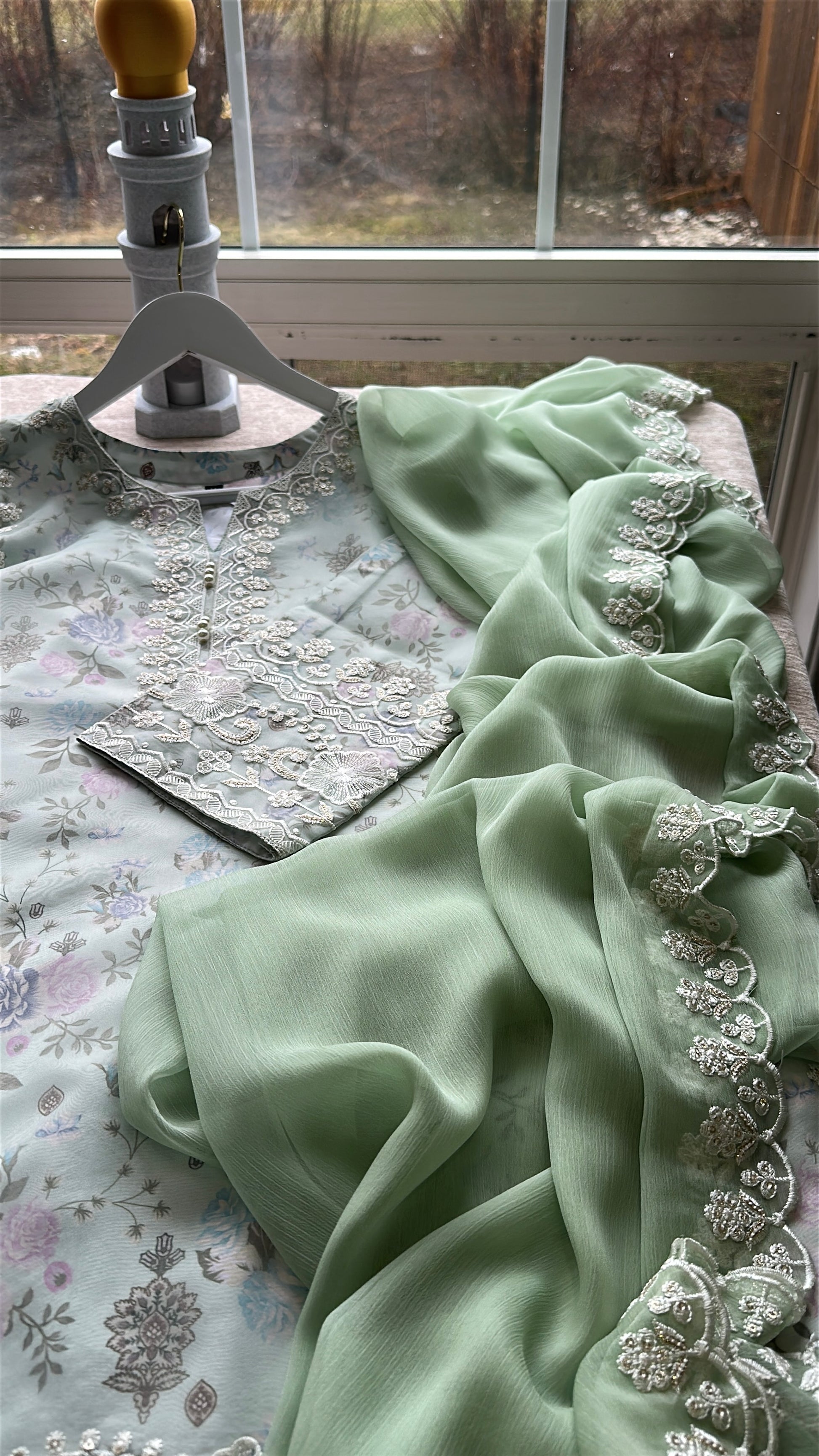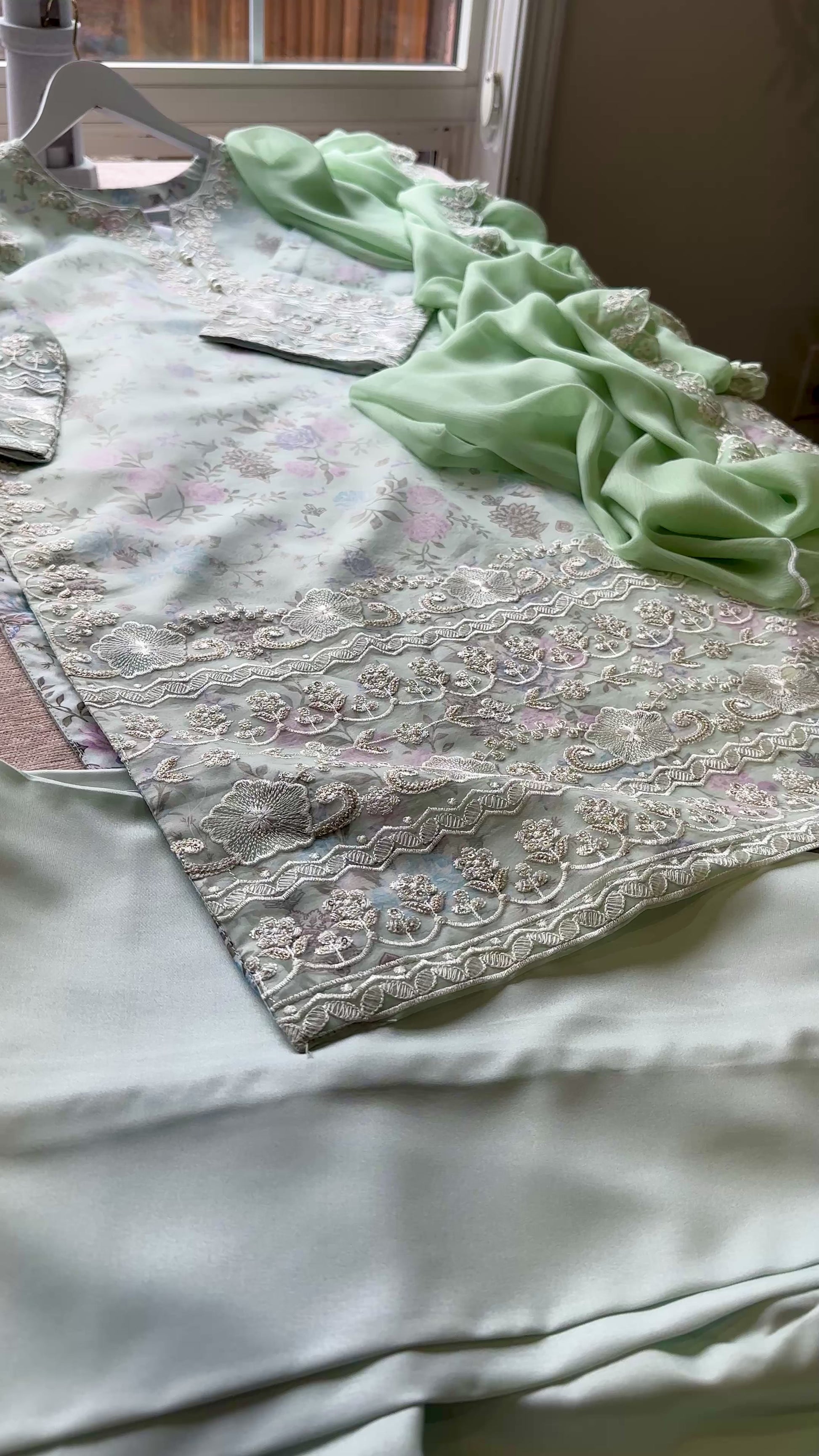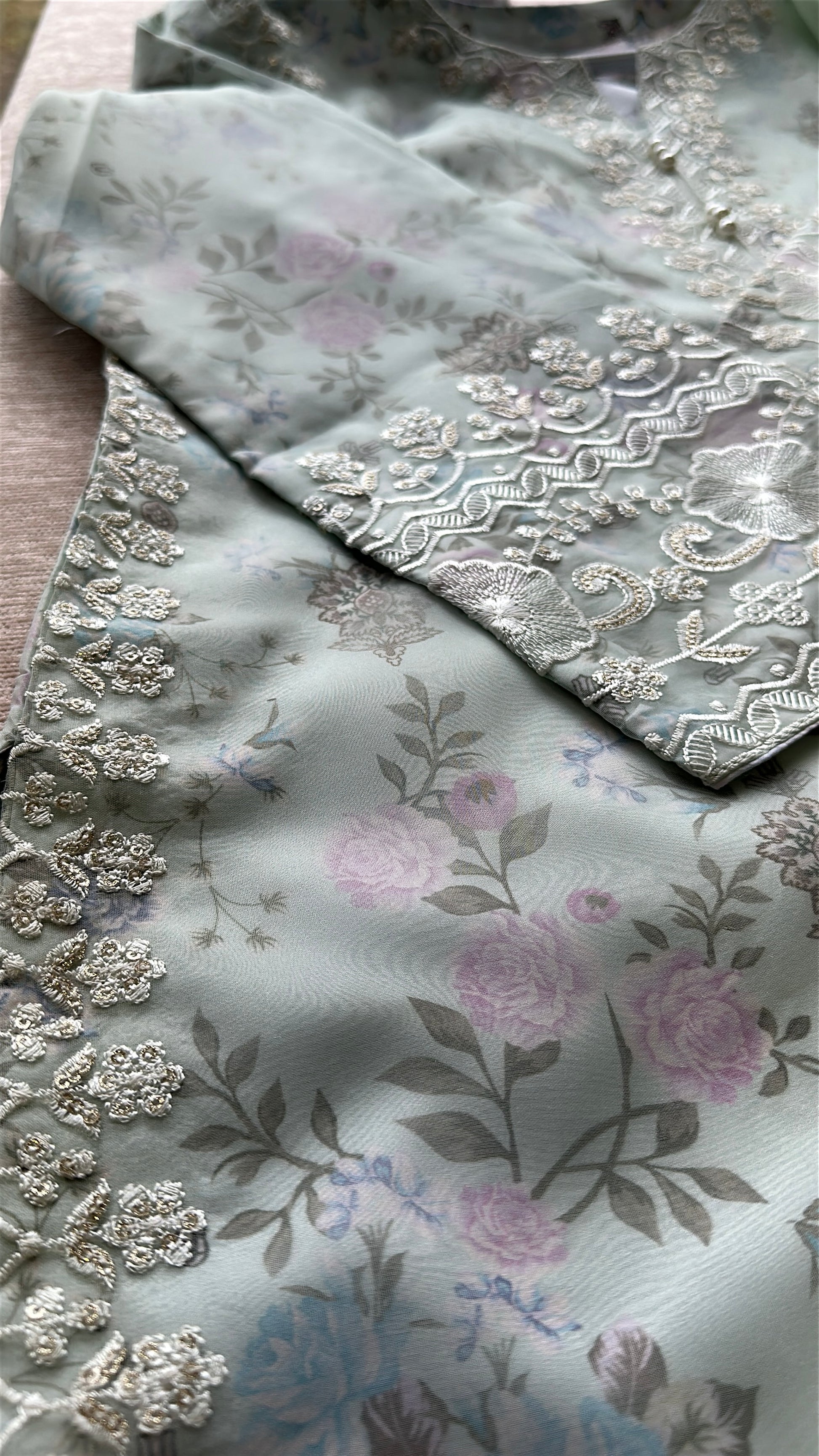 A 3-piece ensemble crafted from delicate organza layered over silk floral fabric, Mint Blossom merges romantic garden florals with refined craftsmanship. The shirt features intricate embroidery with sequins (sitara) work and a heavily hand-embellished neckline, paired with silk straight pants and a chiffon dupatta finished with scalloped embroidered edges. The soft mint floral base feels fresh, graceful, and effortlessly elegant.