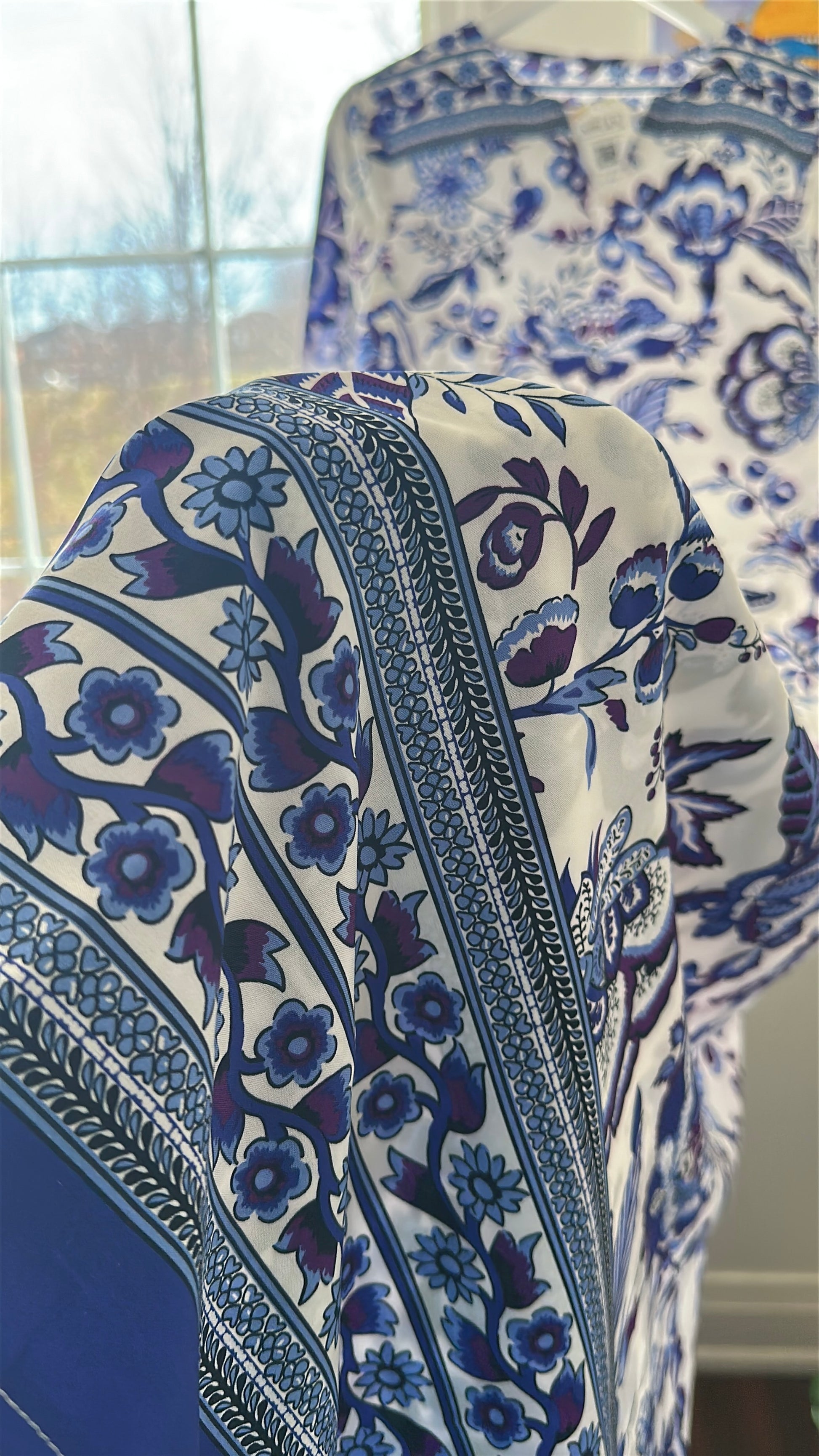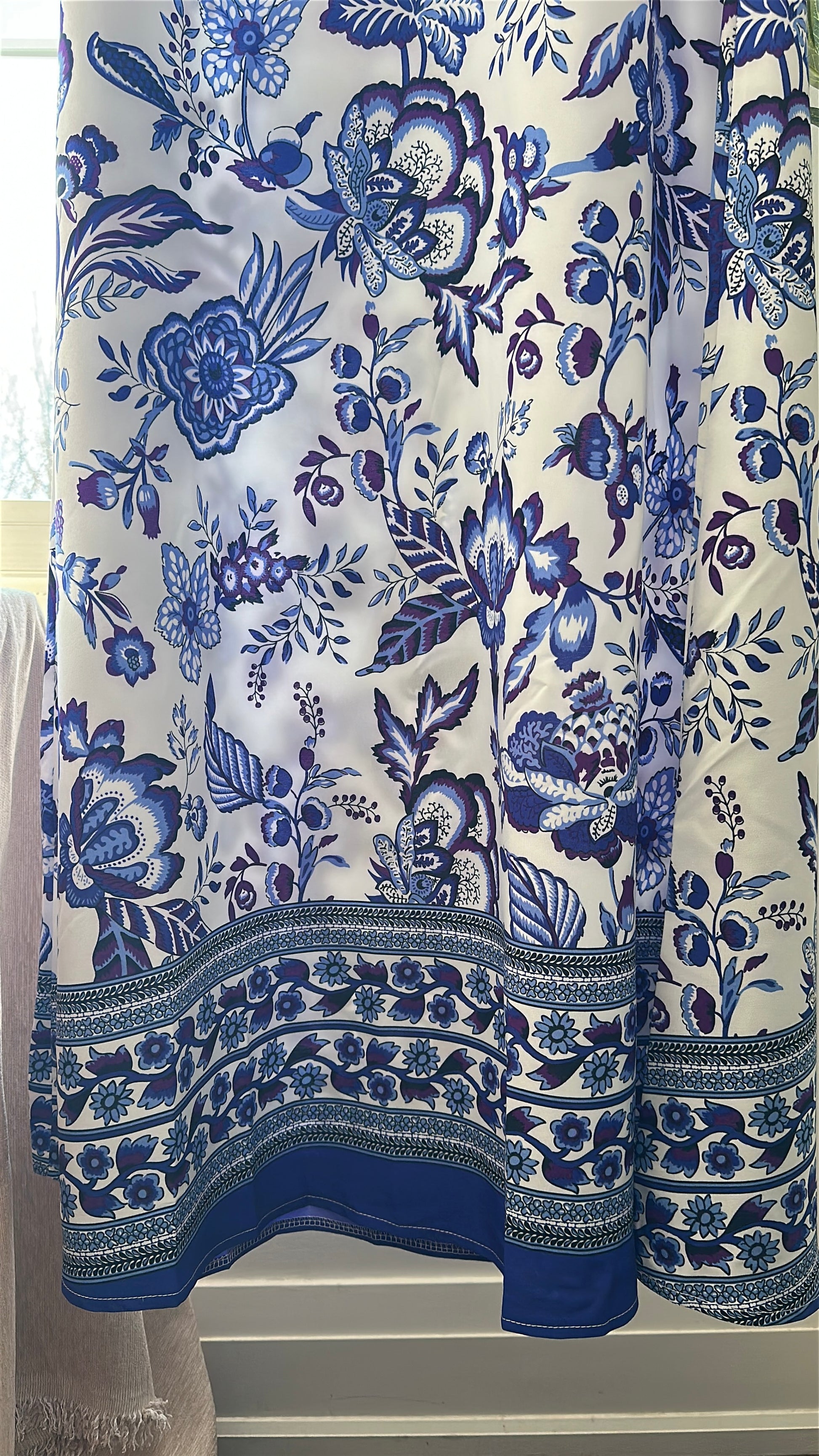 • 🧵 Premium silk fabric with sapphire floral print