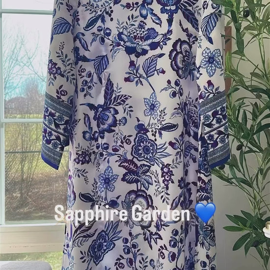 A long silk statement piece crafted from luxurious printed silk, Sapphire Garden blends timeless elegance with modern sophistication. Set on a crisp ivory base, the dress is adorned with rich sapphire-blue botanical prints that feel both fresh and regal. The flowing 53-inch silhouette drapes beautifully, creating graceful movement with every step, while the detailed sleeve and hem borders add a refined designer finish.