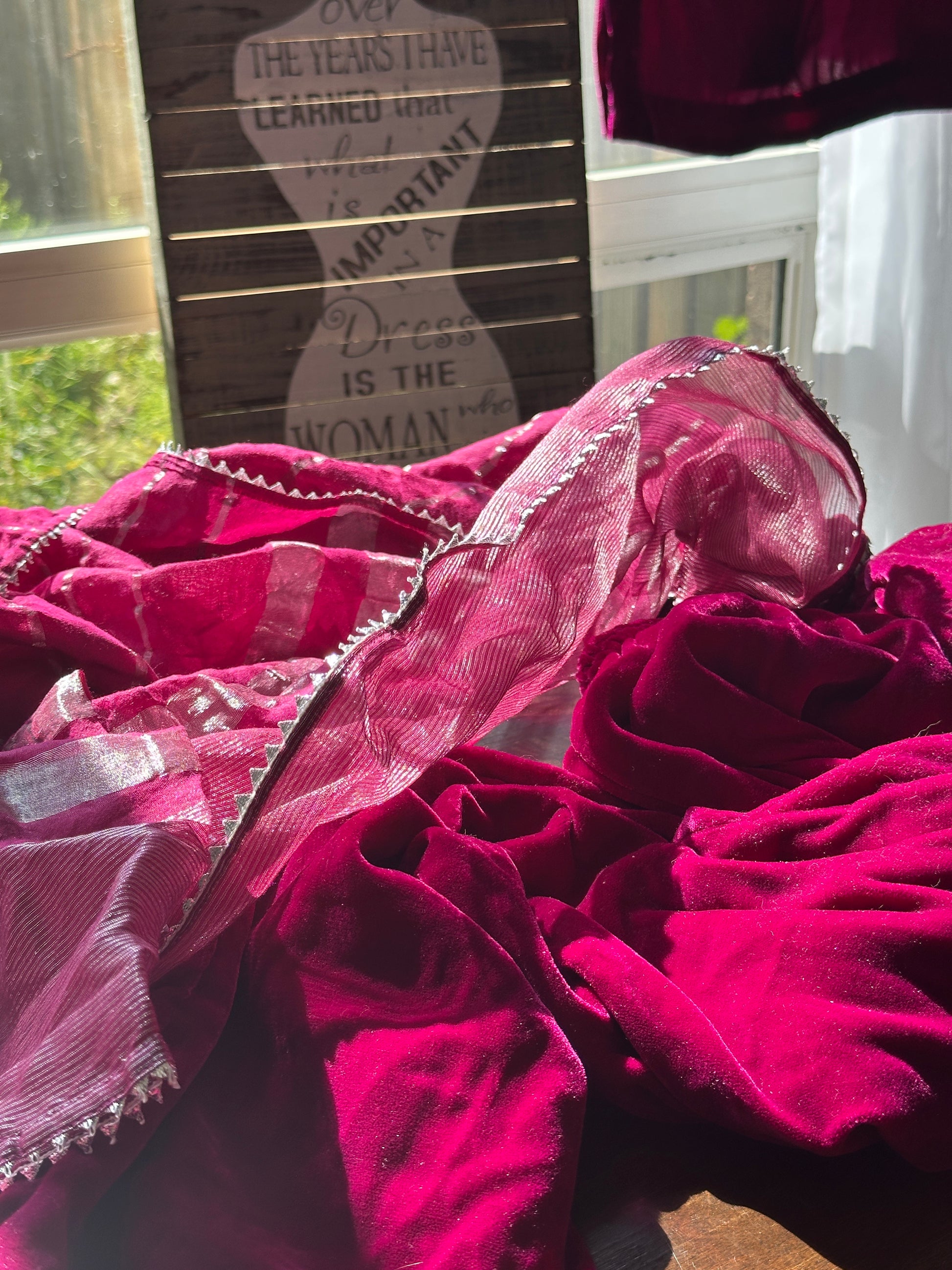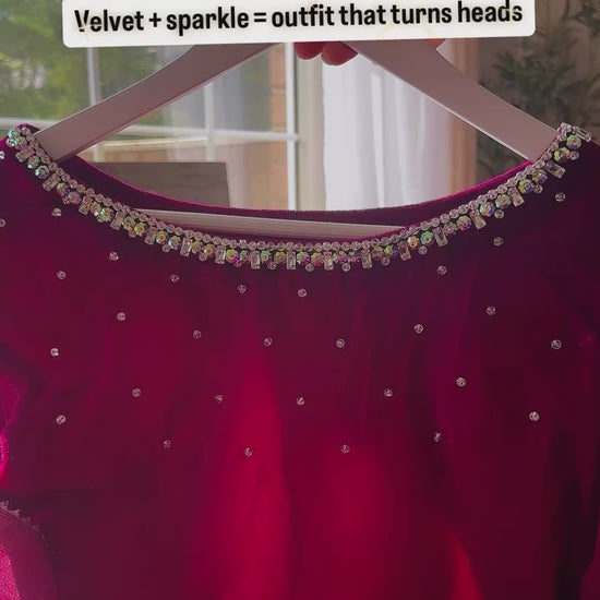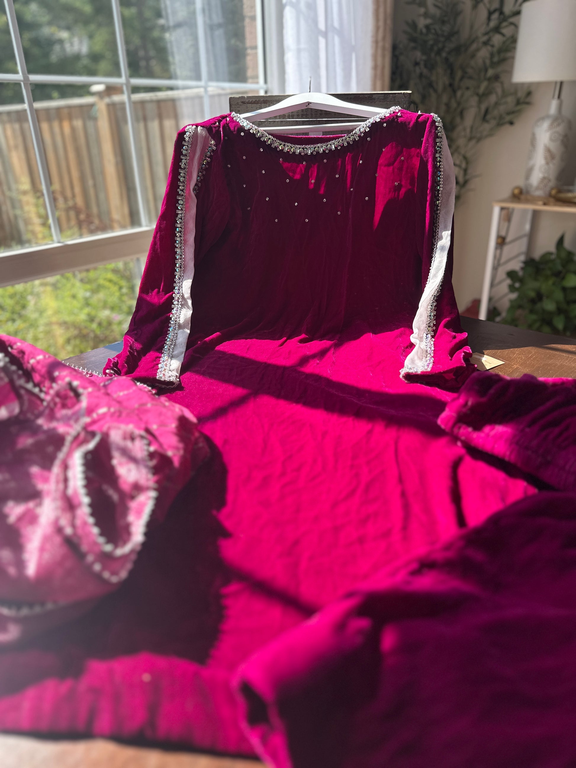 A 3-piece velvet ensemble, Magenta Allure dazzles with sparkling stone detailing across the shirt, paired with classic pants for understated elegance. The flowy dupatta, designed to steal the spotlight, completes this seasonal must-have — rich, festive, and effortlessly glamorous.