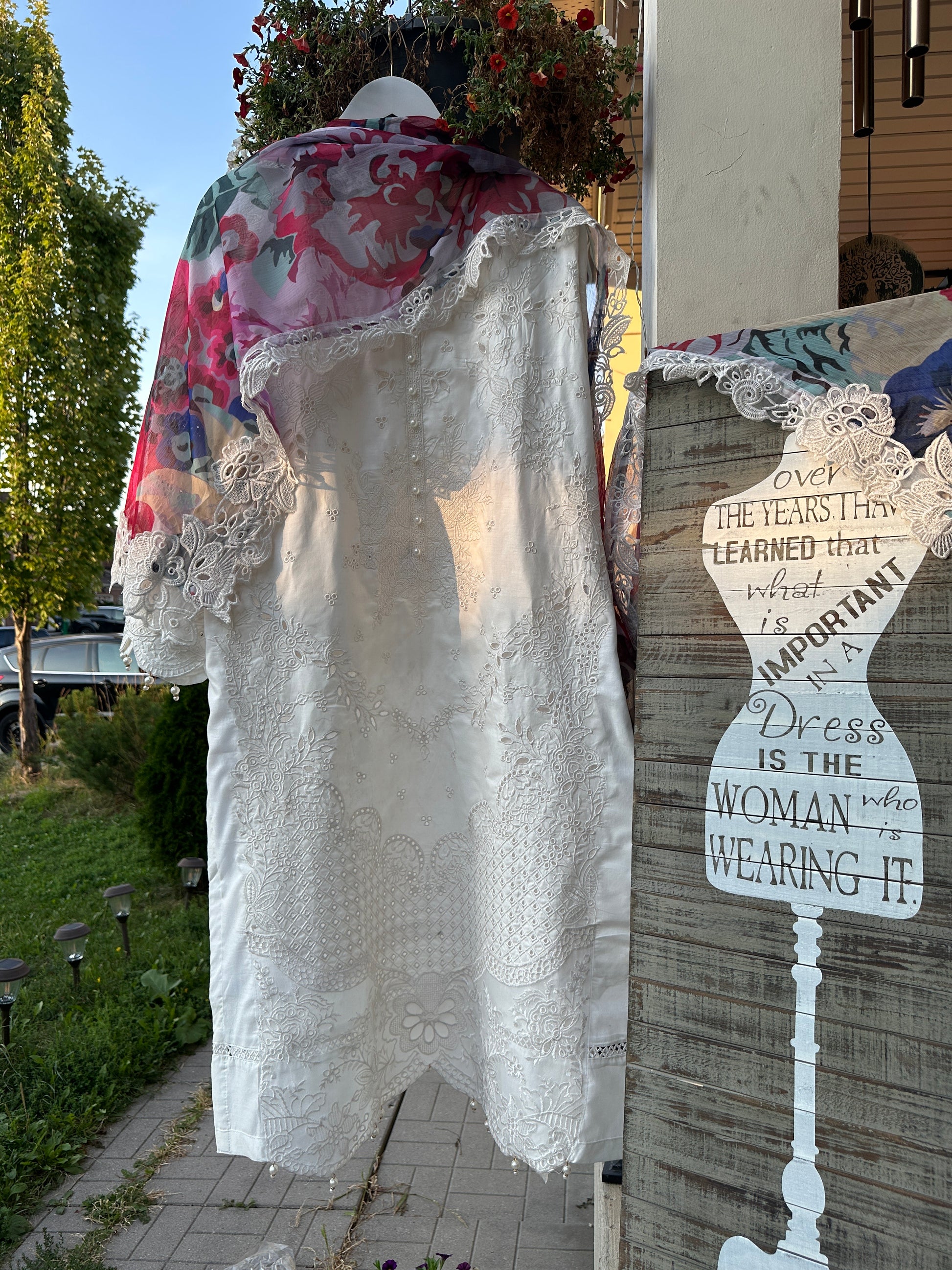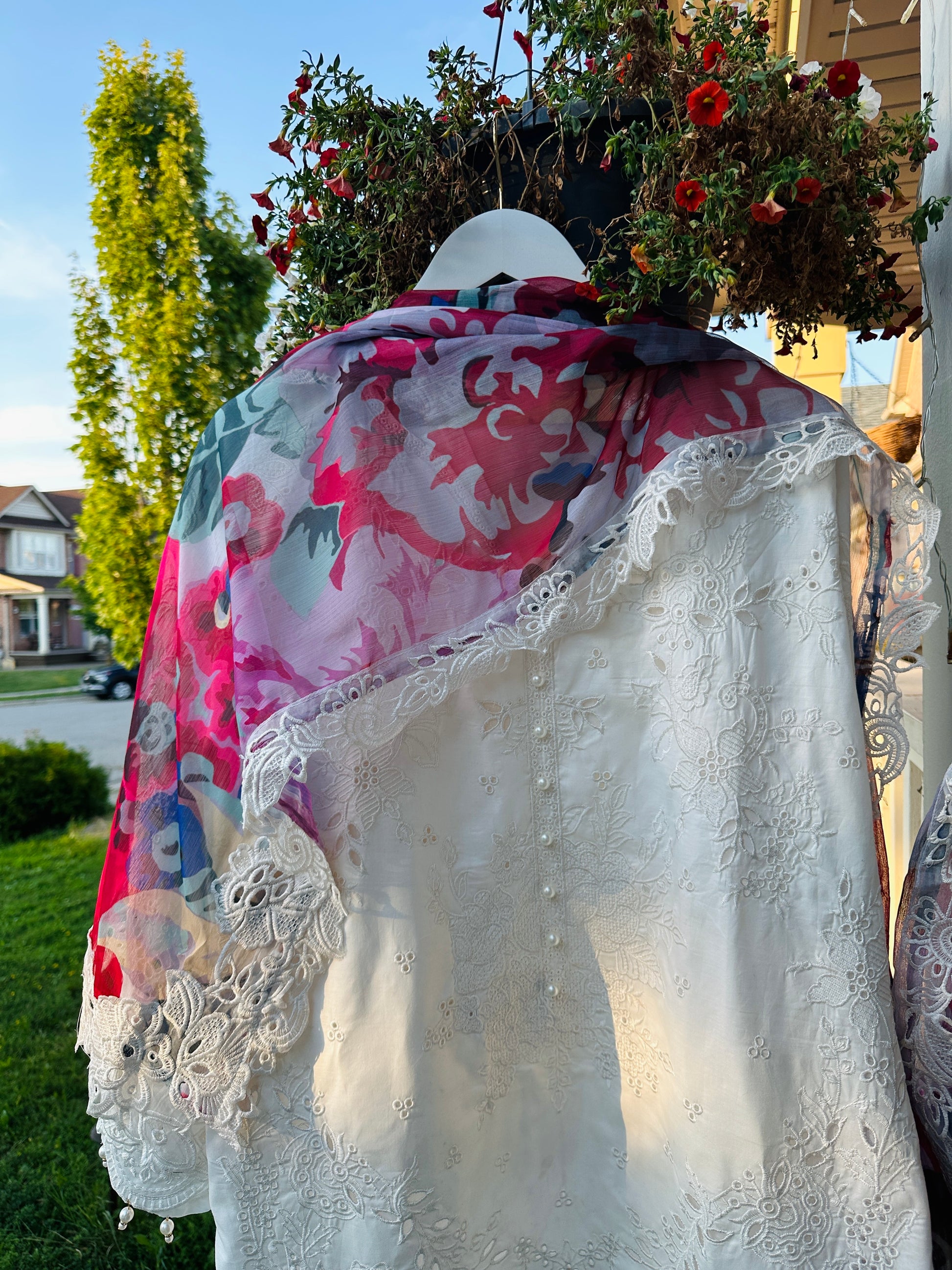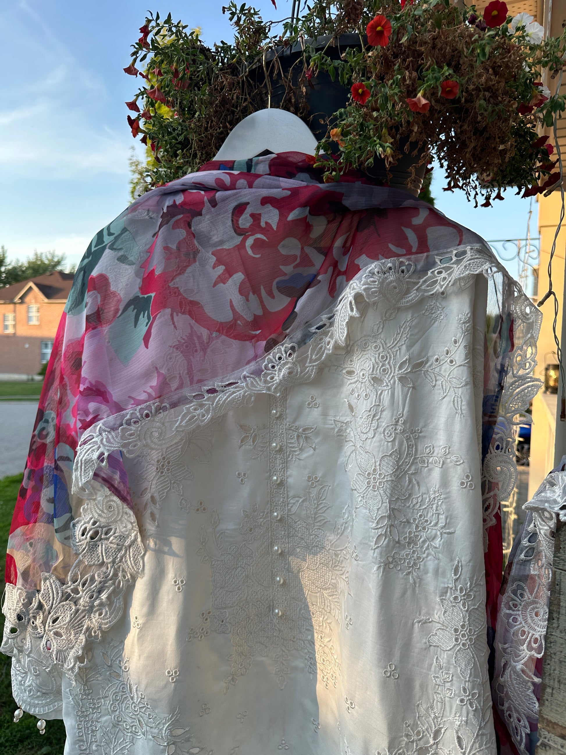 A 3-piece white Chikankari ensemble, Pearl Floral Chikan Kari features pearl-detailed sleeves and is paired with a flowy floral chiffon dupatta, bringing a delicate, feminine charm to every look. Combined with classic straight pants, this set is a timeless celebration of elegance and craftsmanship.