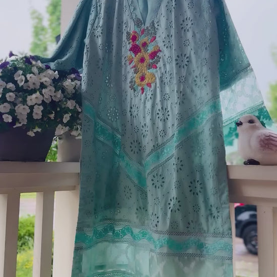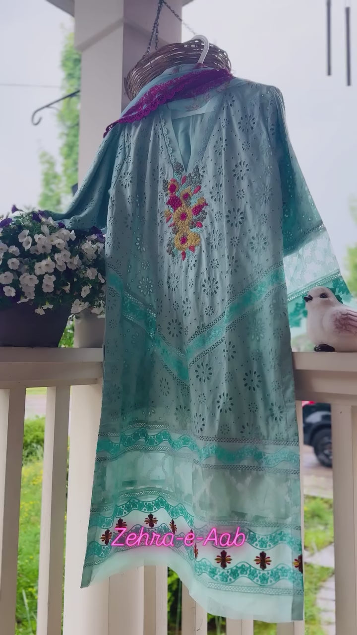 A 3-piece soft aqua ensemble, Zehra-e-Aab features delicate floral embroidery and lace detailing, bringing a whisper of elegance to every step. Fully stitched in XL sizing, it comes with matching pants and a flowy dupatta, making it summer’s softest and most sophisticated statement.