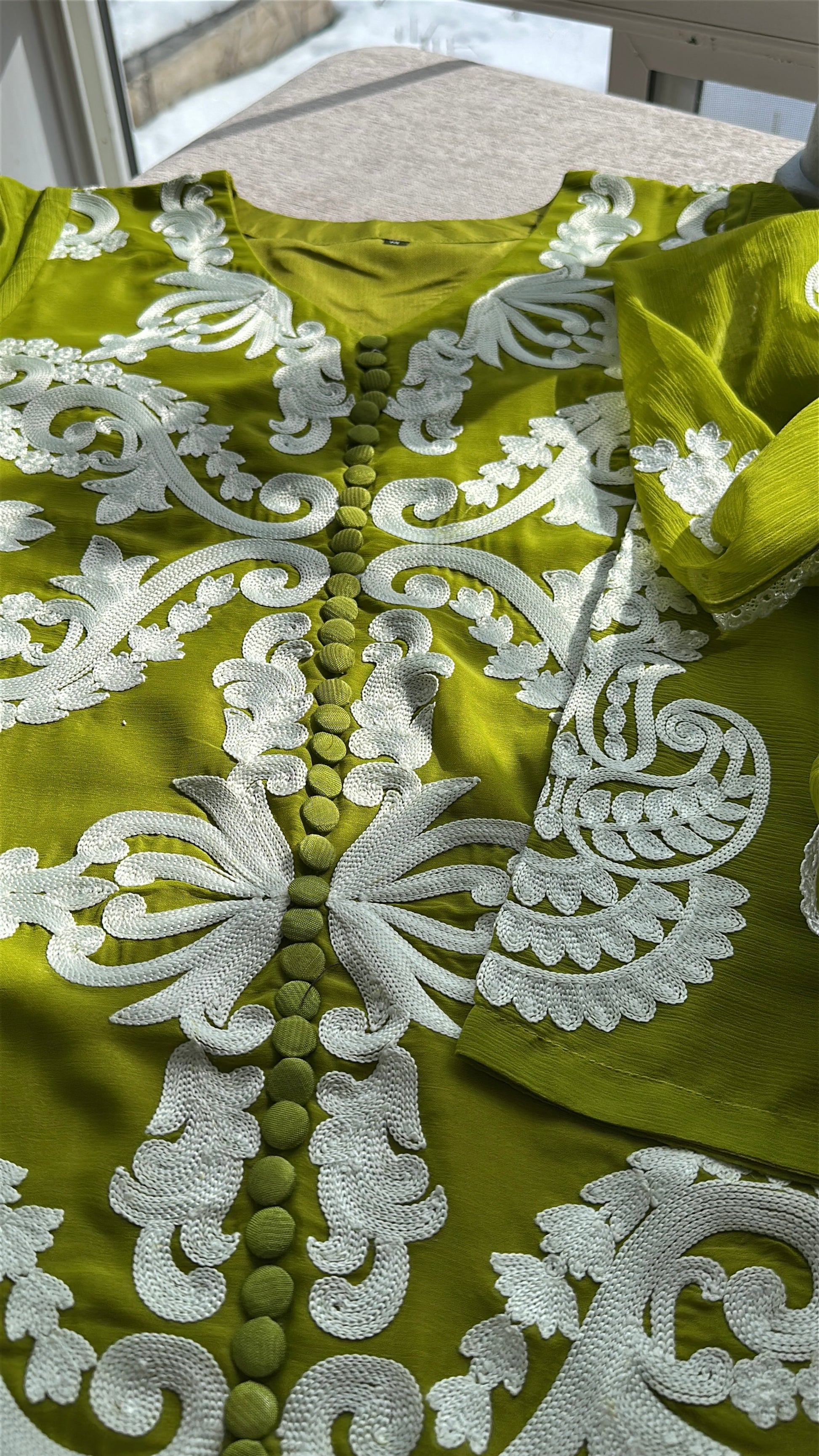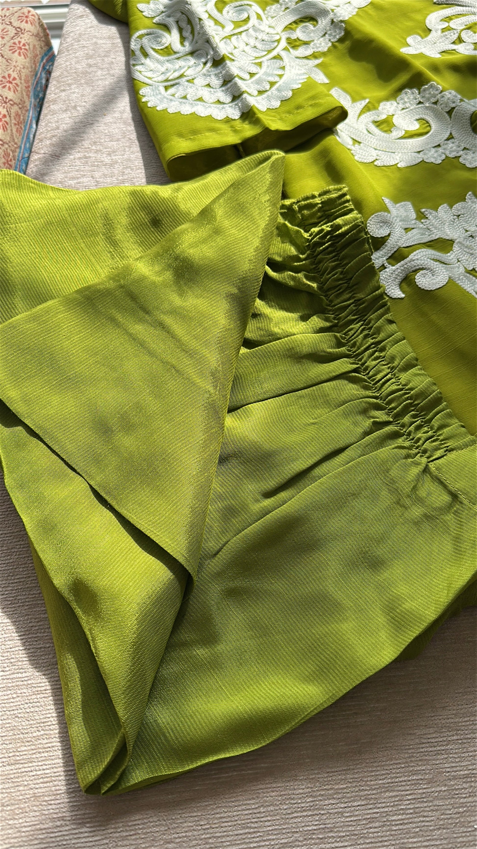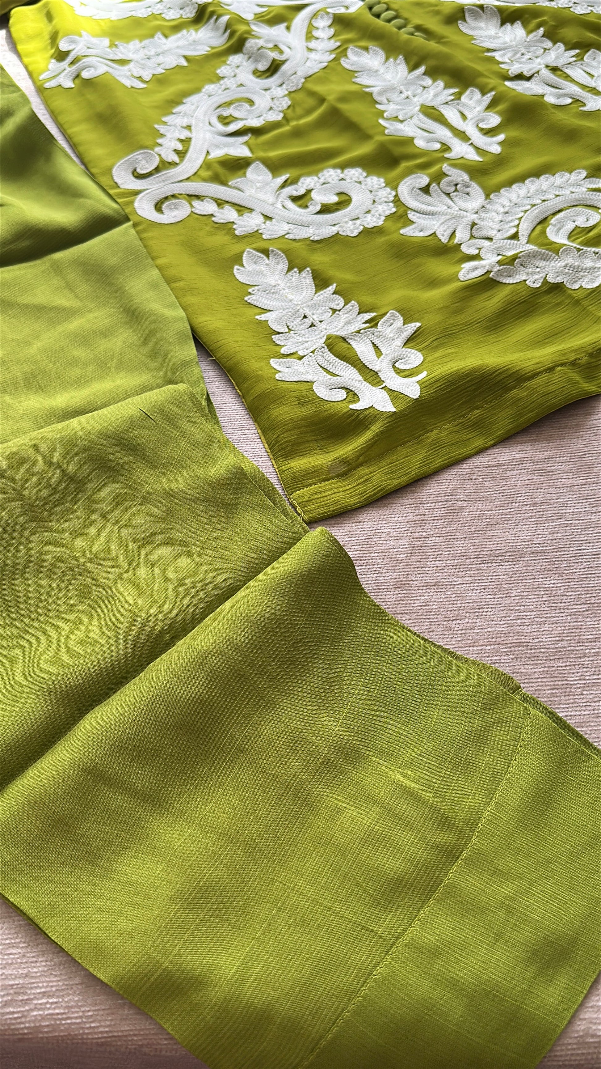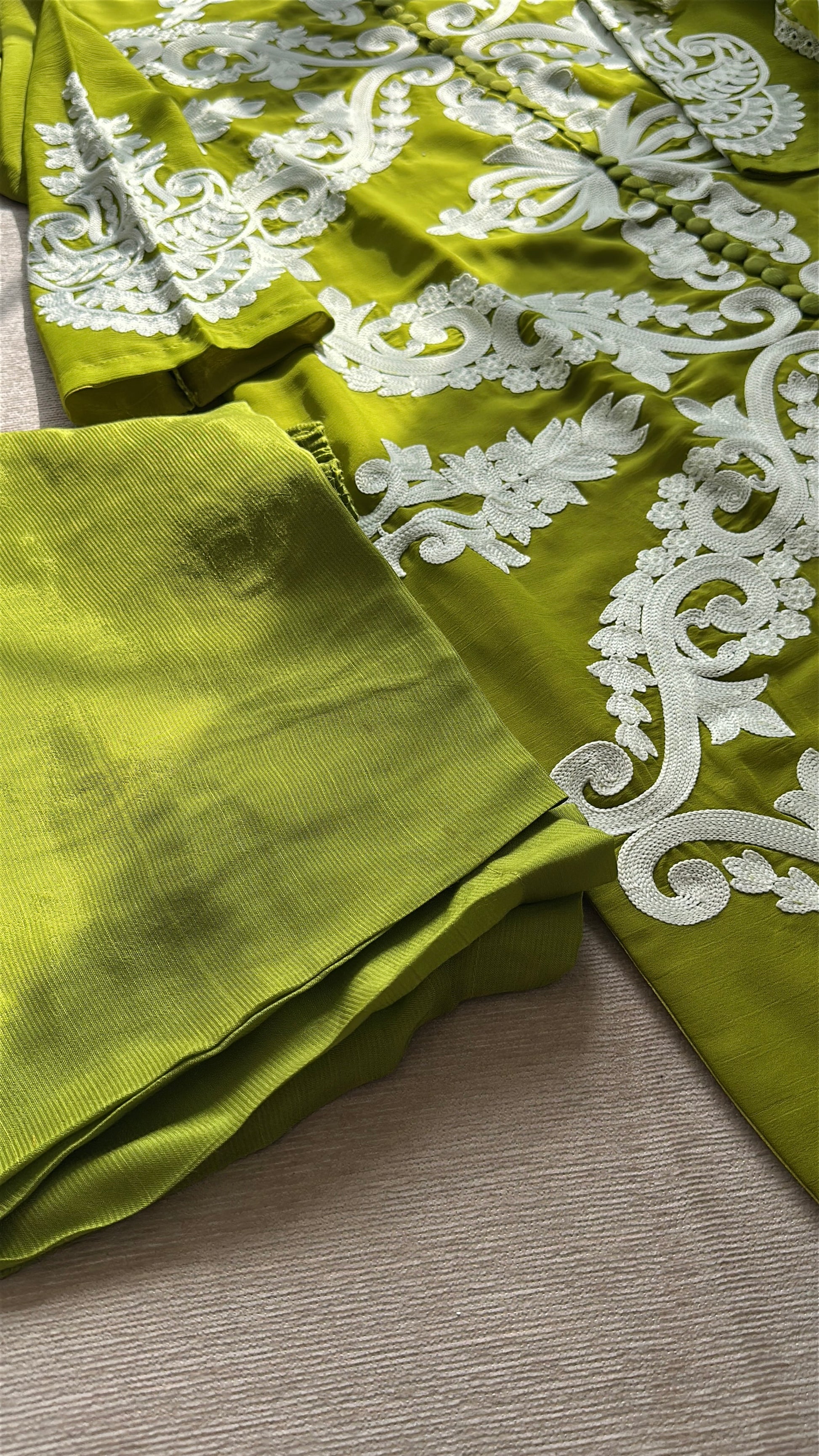 A striking three-piece ensemble in a luminous chartreuse-olive tone that commands attention without saying a word. ZÉYRA is bold, refined, and unapologetically elegant.