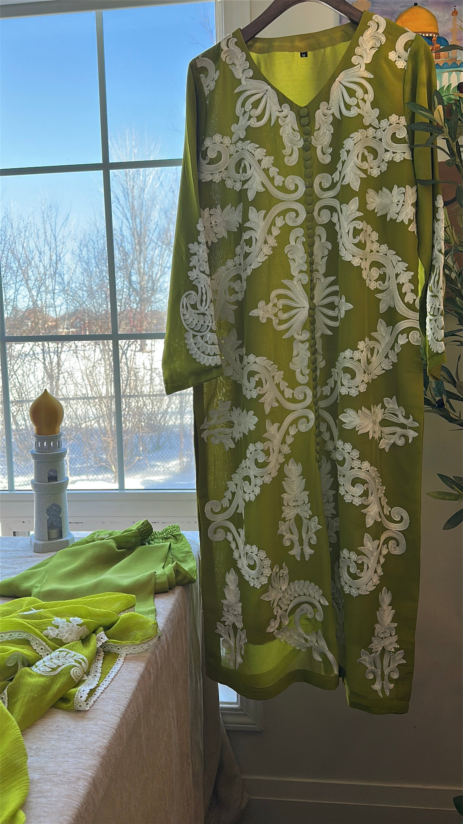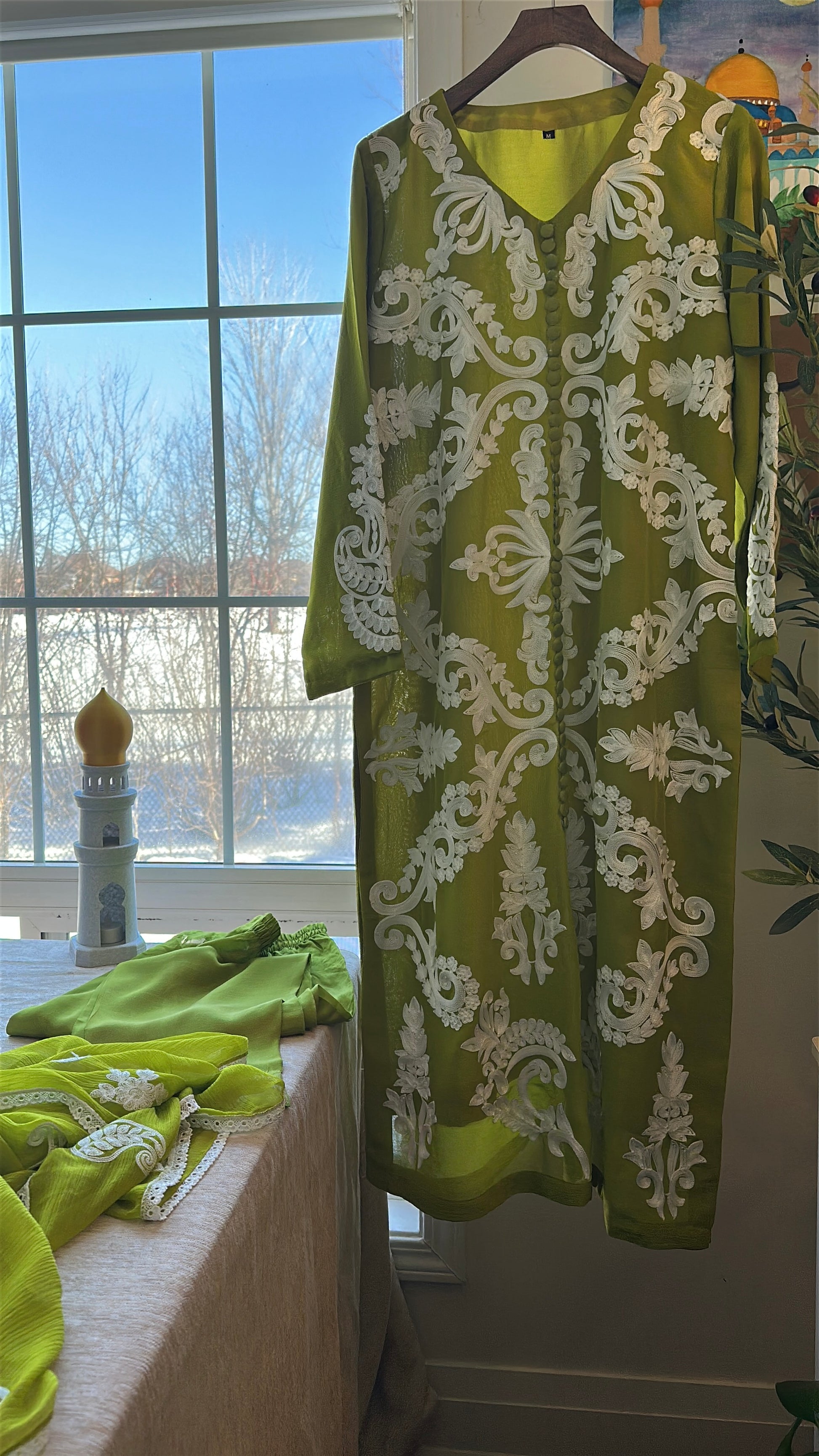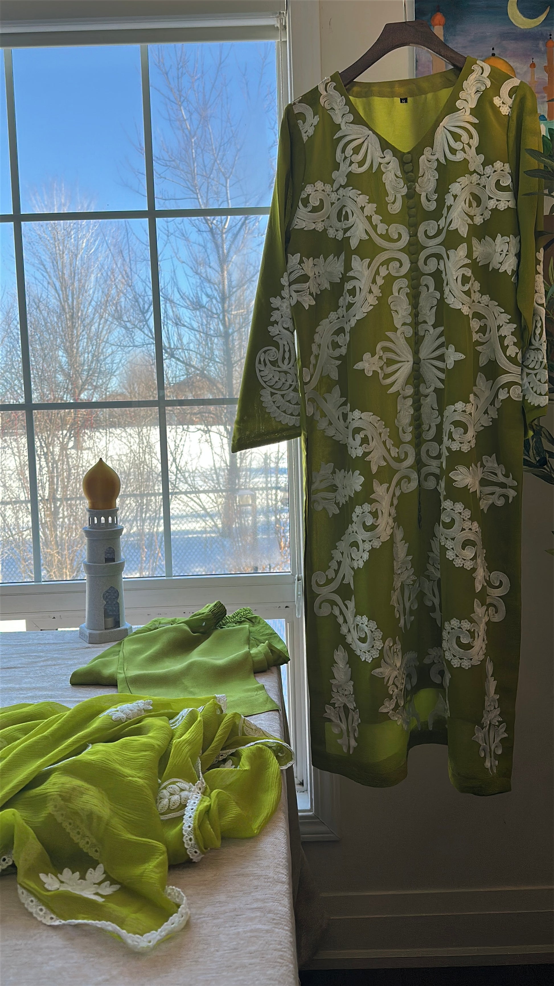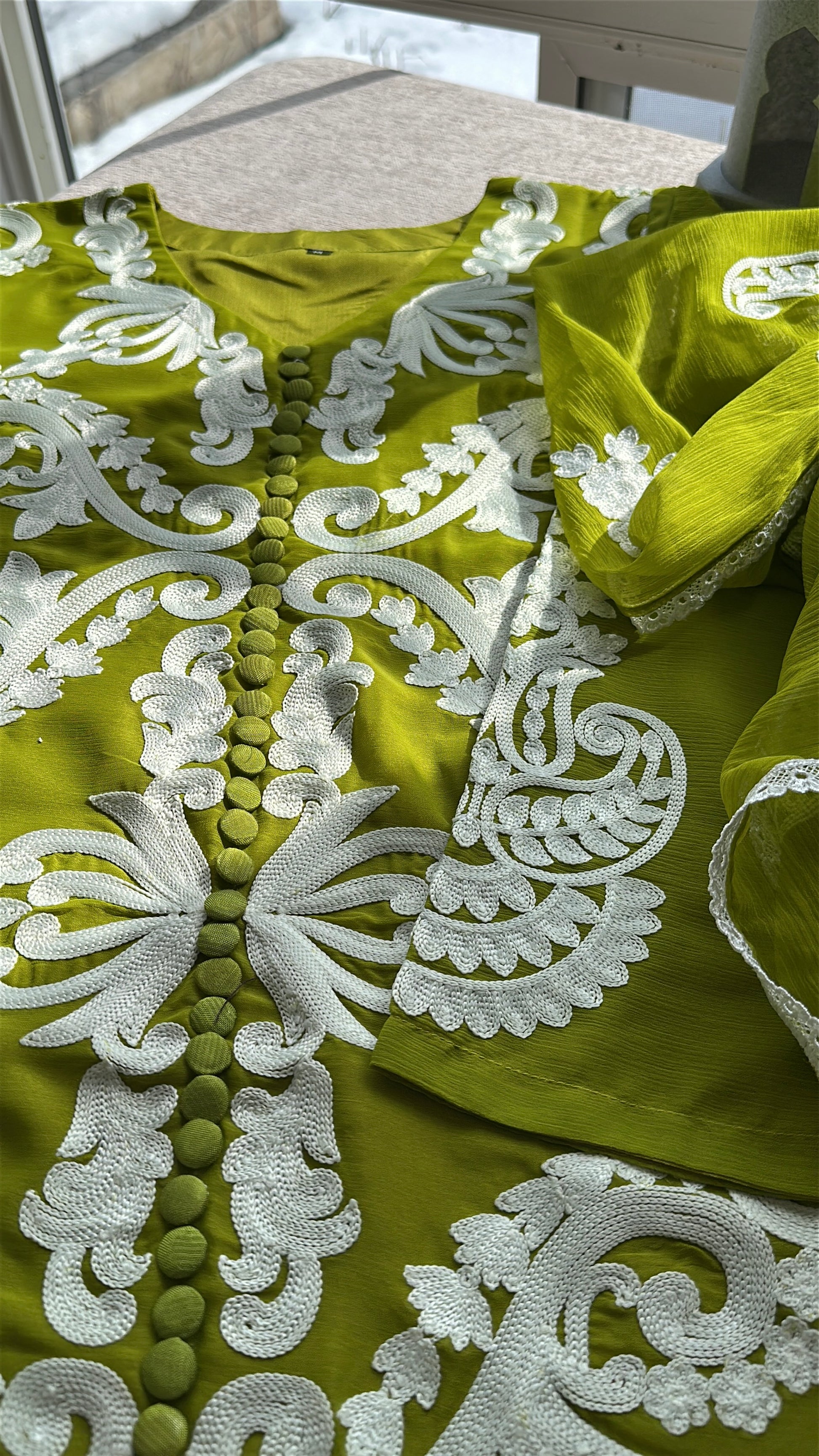 A striking three-piece ensemble in a luminous chartreuse-olive tone that commands attention without saying a word. ZÉYRA is bold, refined, and unapologetically elegant.