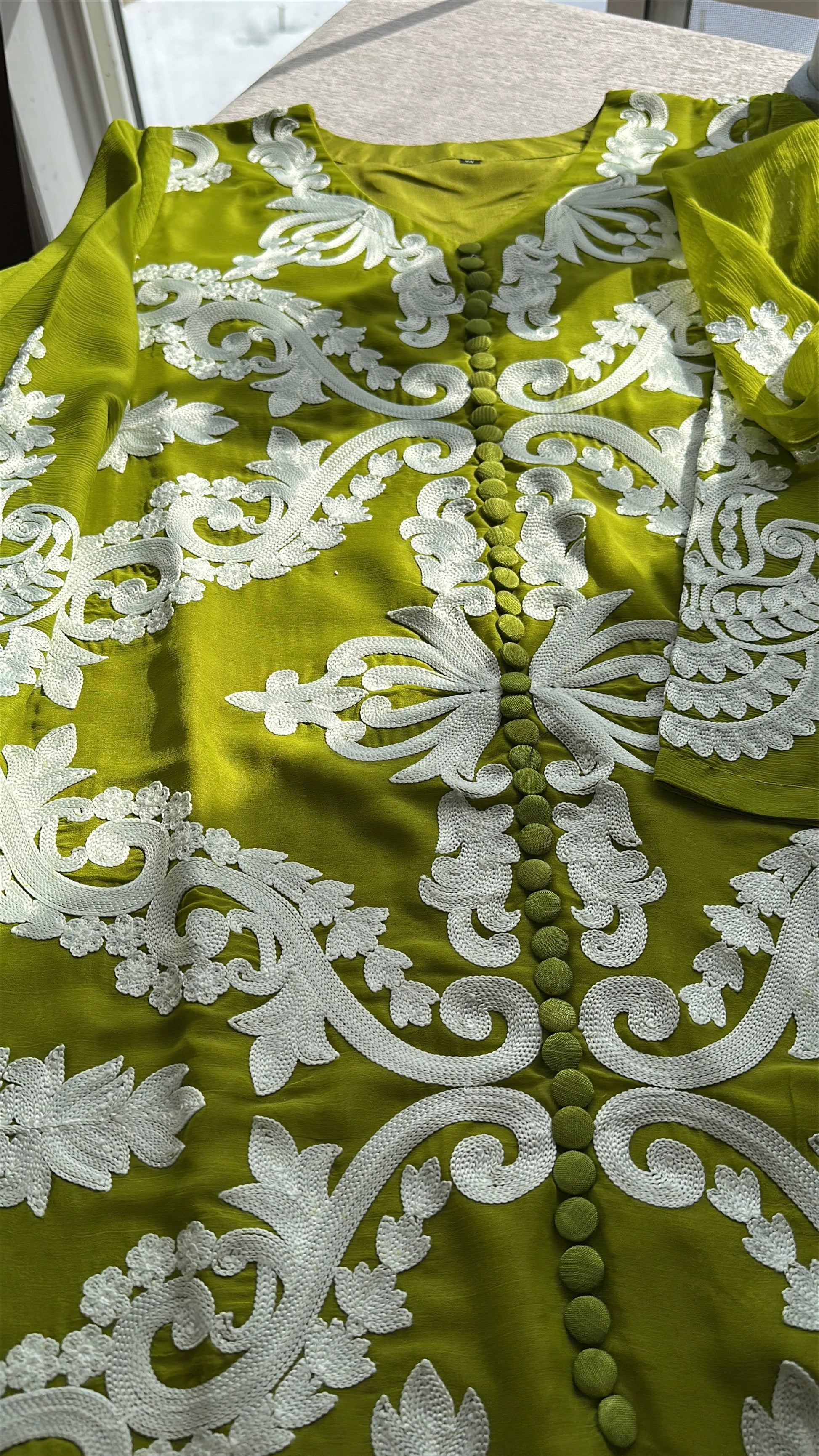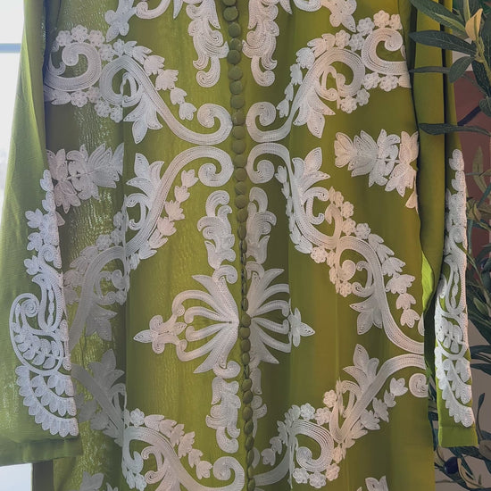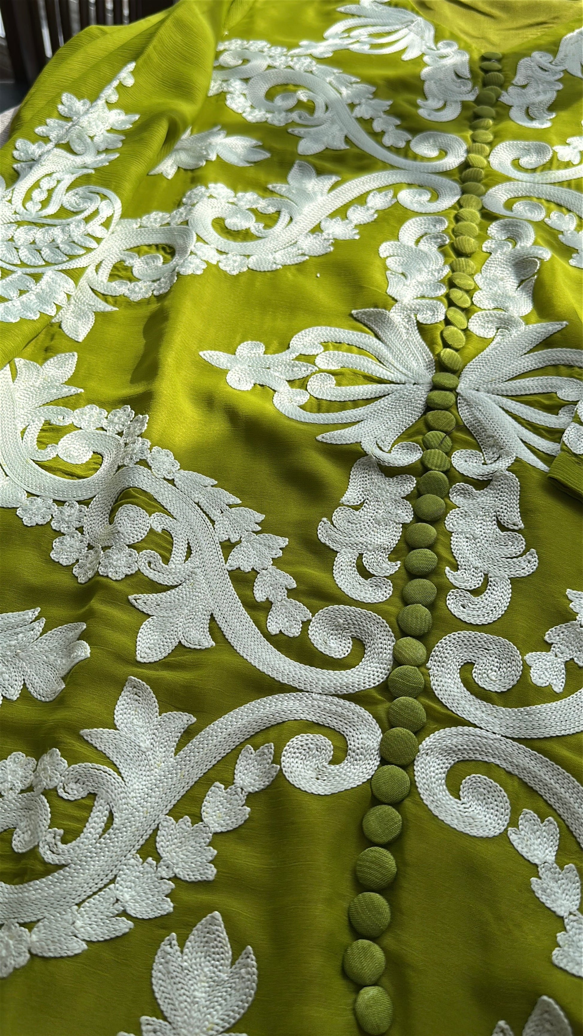 Crafted from crinkle chiffon with a soft inner lining, the shirt features intricate off-white rework embroidery across the entire front and sleeves, creating dramatic contrast against the rich green base. Finished with delicate front loop buttons for a tailored, elevated look.